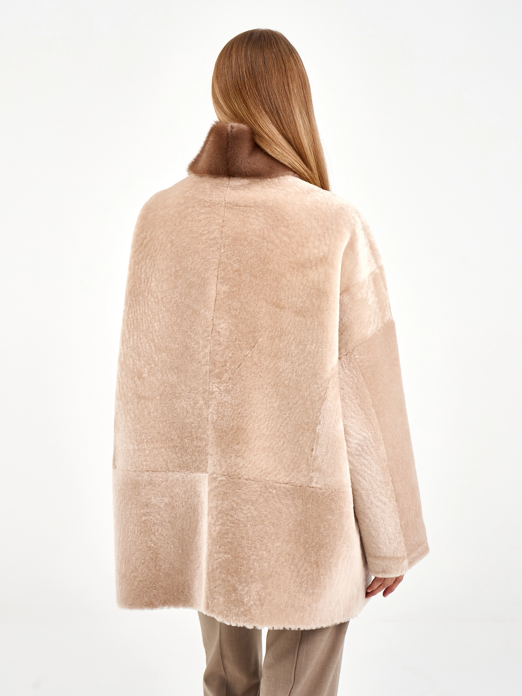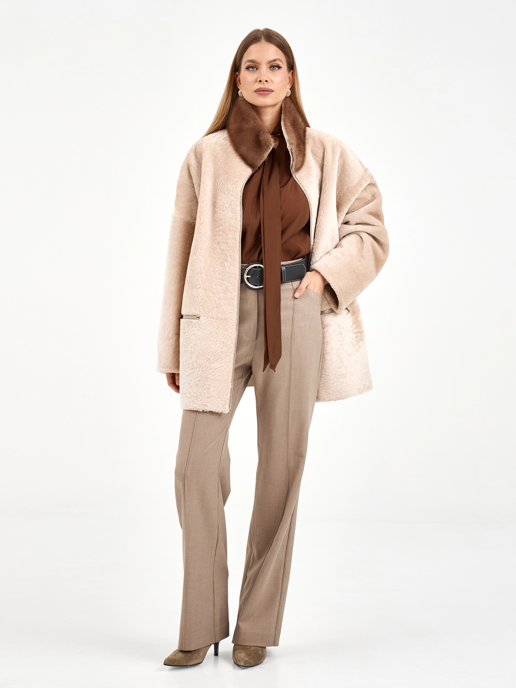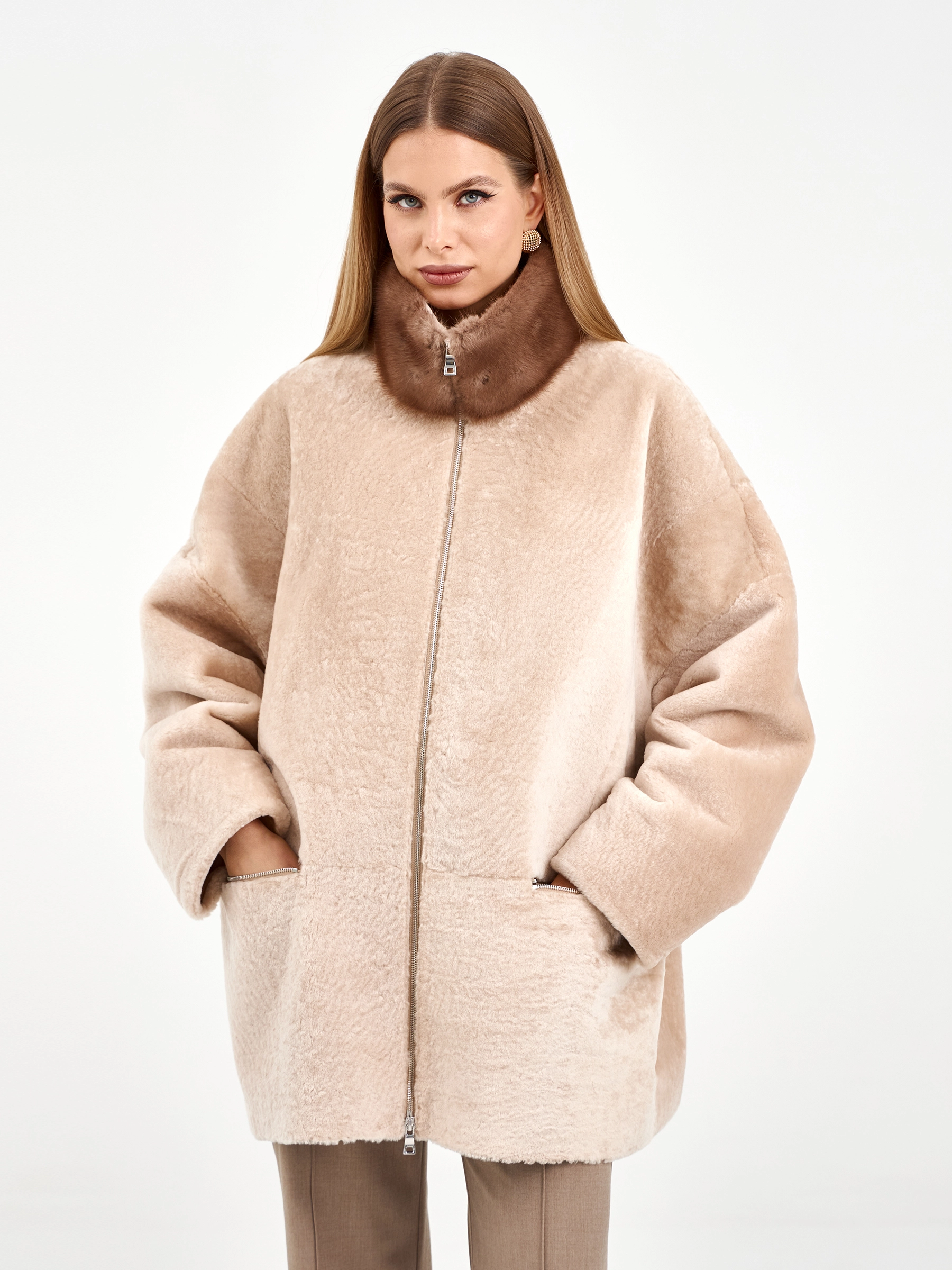 Дублёнка из астрагана свободного кроя изготовлена из премиальной овчины белого цвета. Она максимально тёплая, но при этом лёгкая и комфортная. Боковые карманы, как и само изделие, застёгиваются на молнии. Объёмный воротник-стойку дополнен густым мехом коричневой норки.