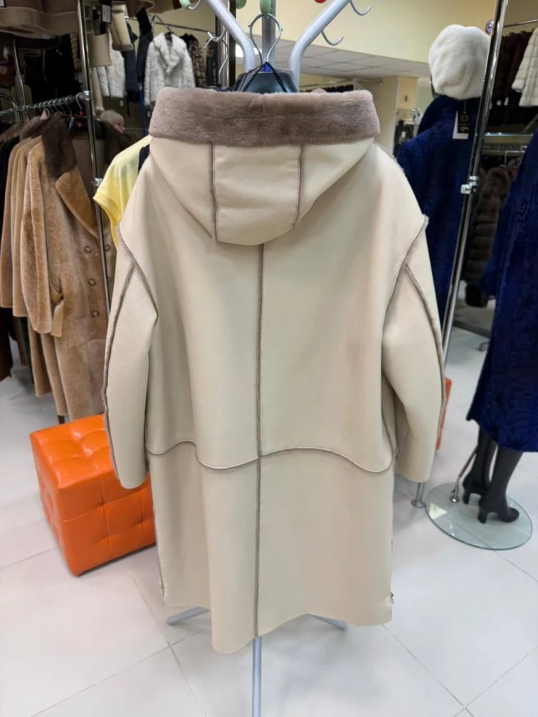 Товар бежевая женская дубленка с капюшоном 2077, размер 46, артикул 65110 выполнен из овчина "мерино" с застежкой молния. Рассчитан на сезон: зима. Длина изделия 75 см, силуэт сободный.