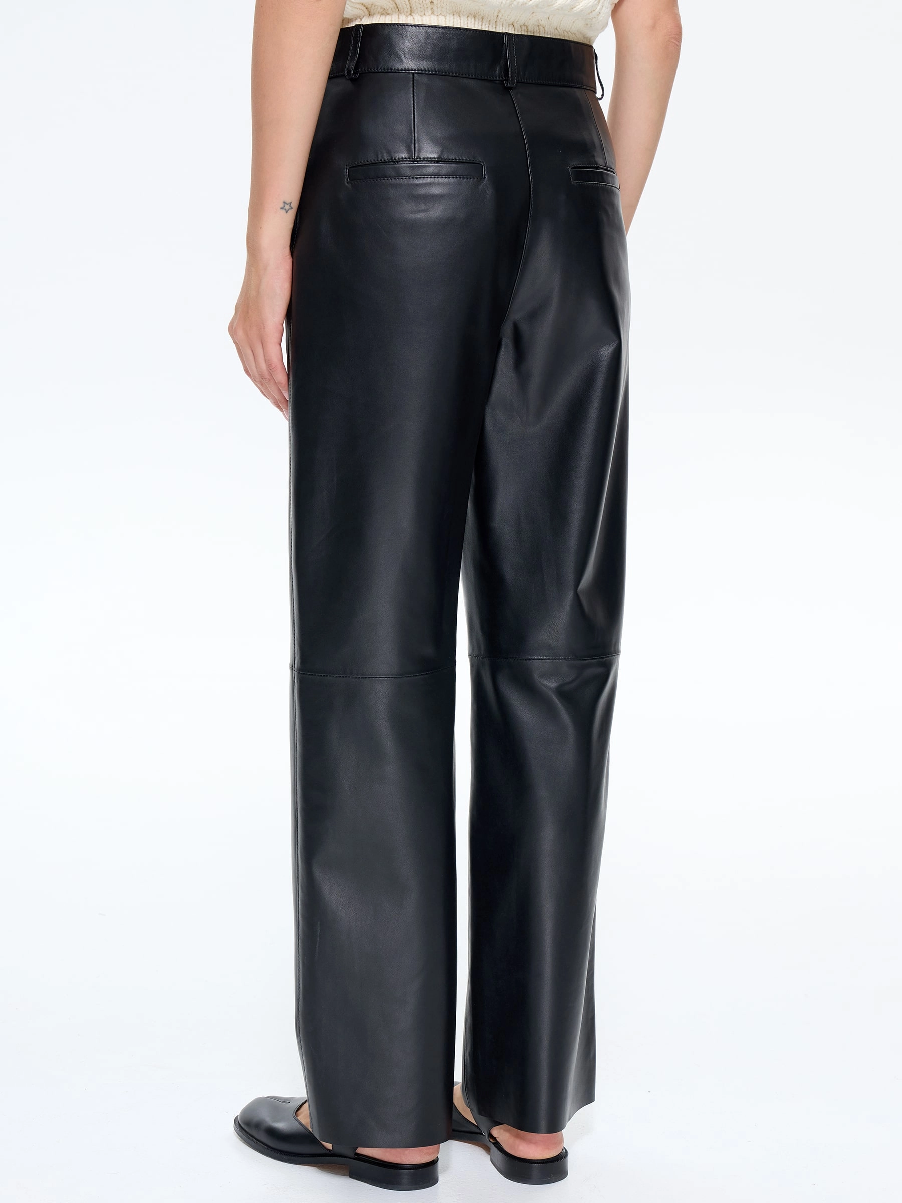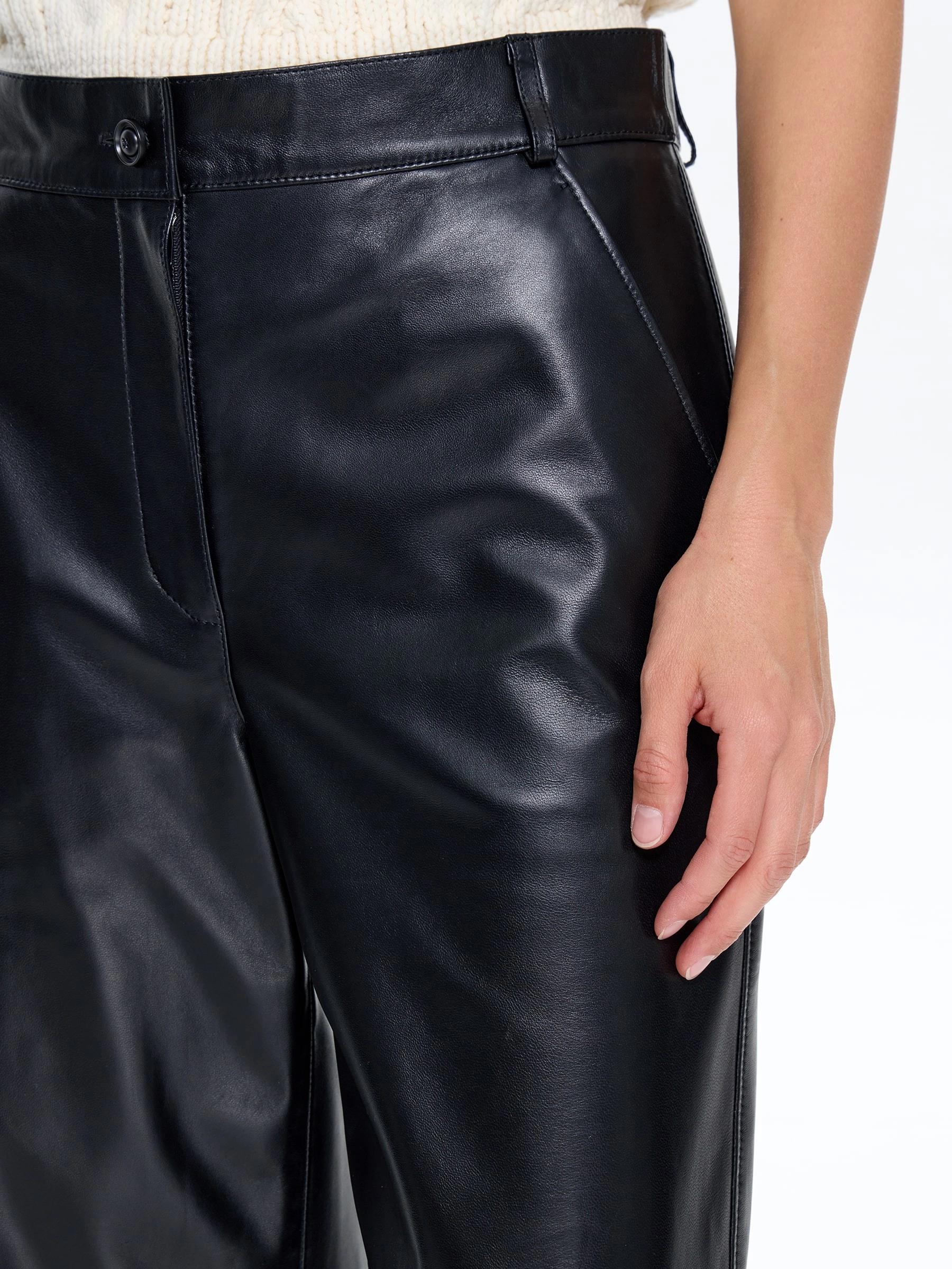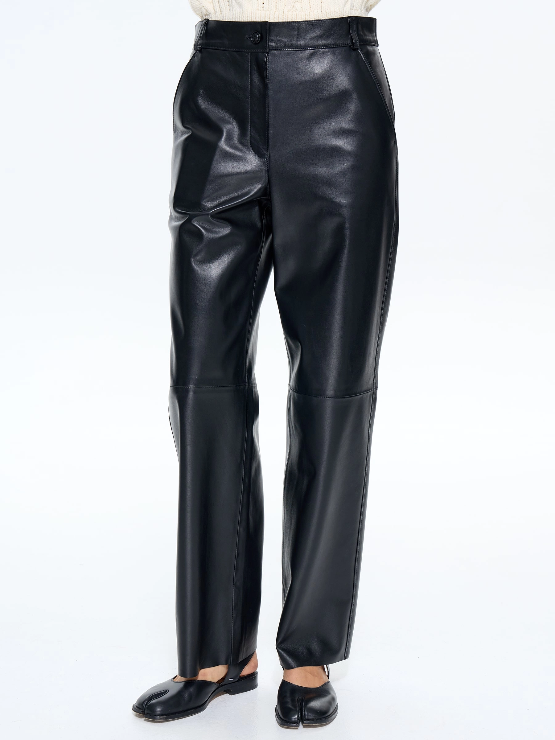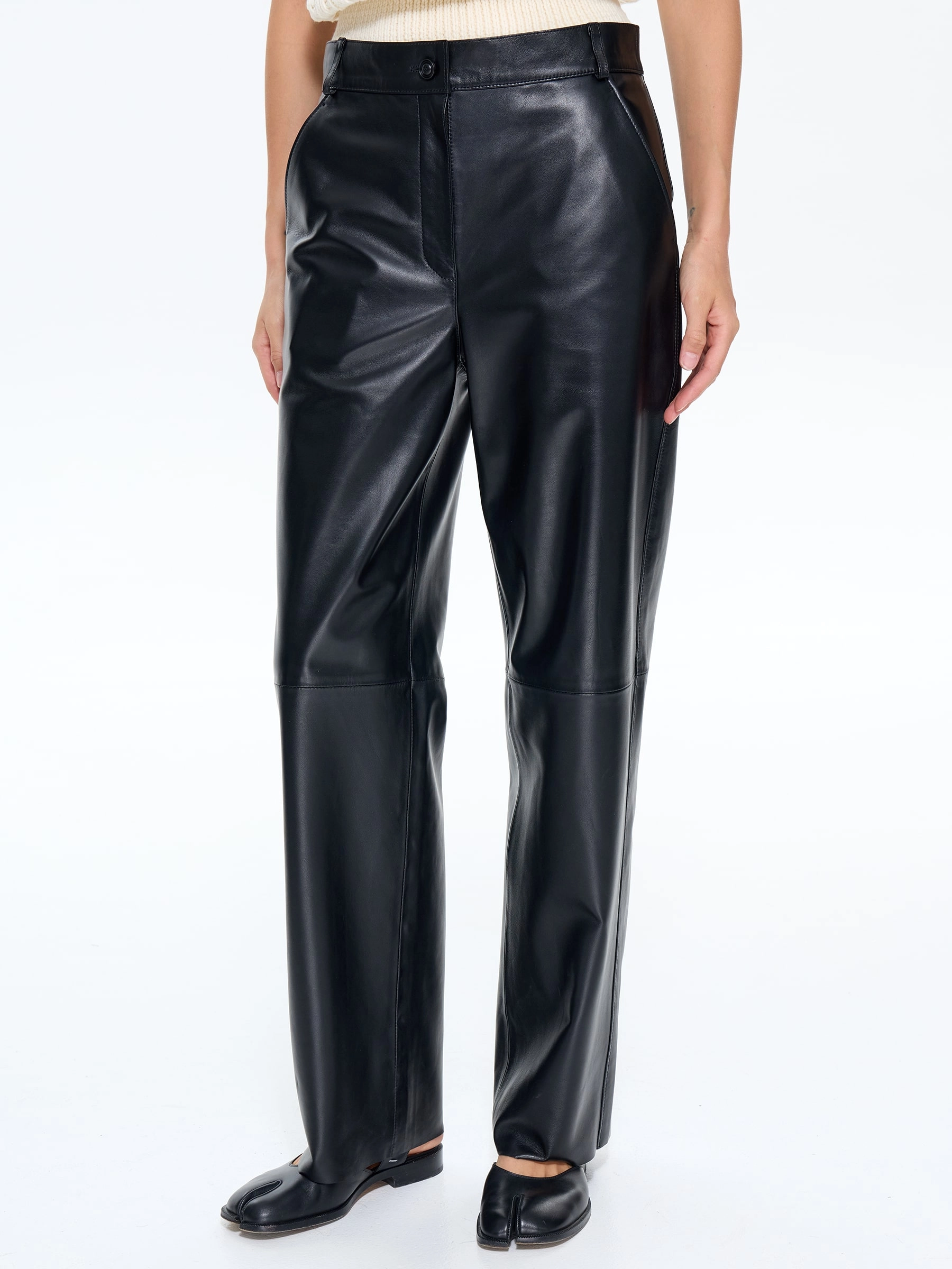 Классические женские брюки из натуральной черной кожи премиум-качества – универсальная основа для создания стильных образов. Завышенная талия визуально удлиняет ноги и подчеркивает силуэт, а прямой крой со свободным облеганием в области бедер и коленей обеспечивает комфорт без эффекта «мешка». Практичность модели дополняют четыре функциональных кармана. Брюки легко комбинируются с разной обувью: от кроссовок и балеток до босоножек и ботильонов. Застежка-молния завершает лаконичный дизайн