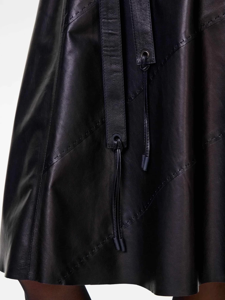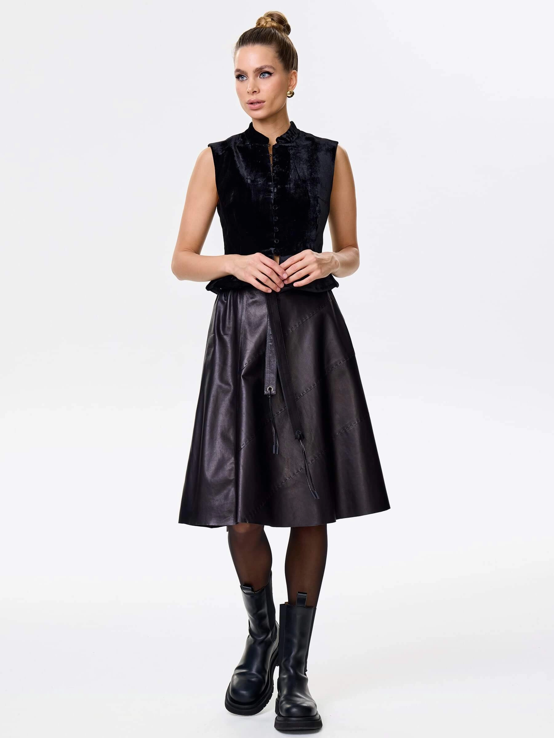 Облегающая расклешённая юбка из натуральной мягкой кожи черного цвета с благородным блеском сочетает комфорт, долговечность и безупречный стиль. Её летящий крой визуально стройнит фигуру, добавляя образу лёгкость и динамику, а эксклюзивная отделка ручной строчкой подчёркивает премиальное качество материала. Длинный пояс из той же кожи служит стильным акцентом, а потайная молния сзади обеспечивает идеальную посадку и чистоту линий, делая эту модель по-настоящему уникальной.