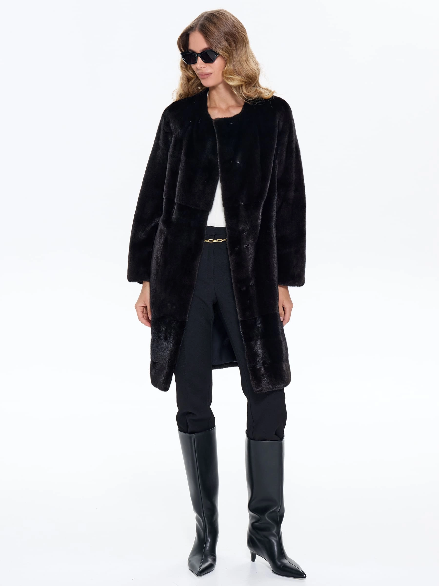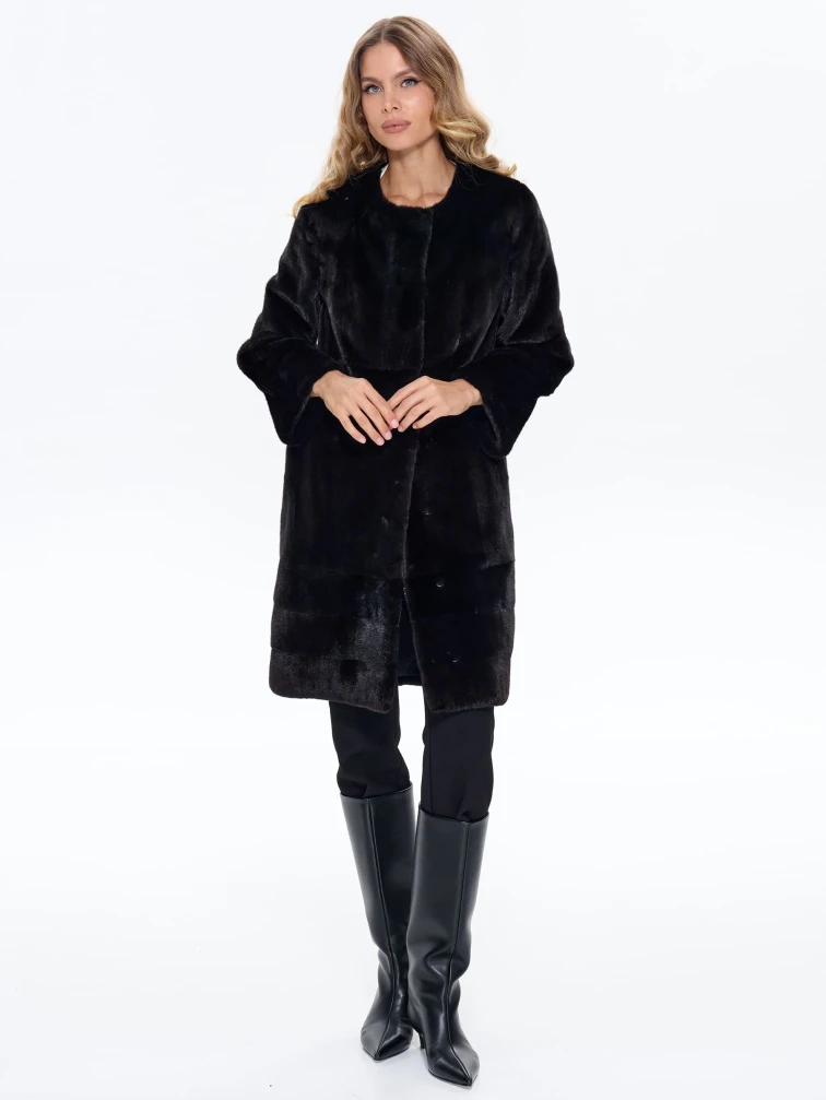Для пошива этой шубы мастера использовали густой мех норки глубокого черного цвета с металлическим отливом, где шкурки выложены перпендикулярно хребтовой линии, создавая эффект плетеной текстуры. Универсальный прямой крой визуально стройнит фигуру, а отсутствие воротника дает свободу для объемных снудов и шелковых платков, в то время как бесшовное соединение плеча и рукава реглана устраняет давление на верхнюю часть тела, обеспечивая абсолютную свободу движений. Усиленные проймы с двойной строчкой предотвращают деформацию при ношении объемной одежды, а длина midi, закрывающая бедра и часть колен, создает оптимальный баланс тепла и мобильности. Изделие с двумя боковыми карманами идеально подходит для города, удобно в транспорте и отлично сохраняет тепло в суровые морозы, завершая образ аккуратной застежкой на скрытых клипсах.