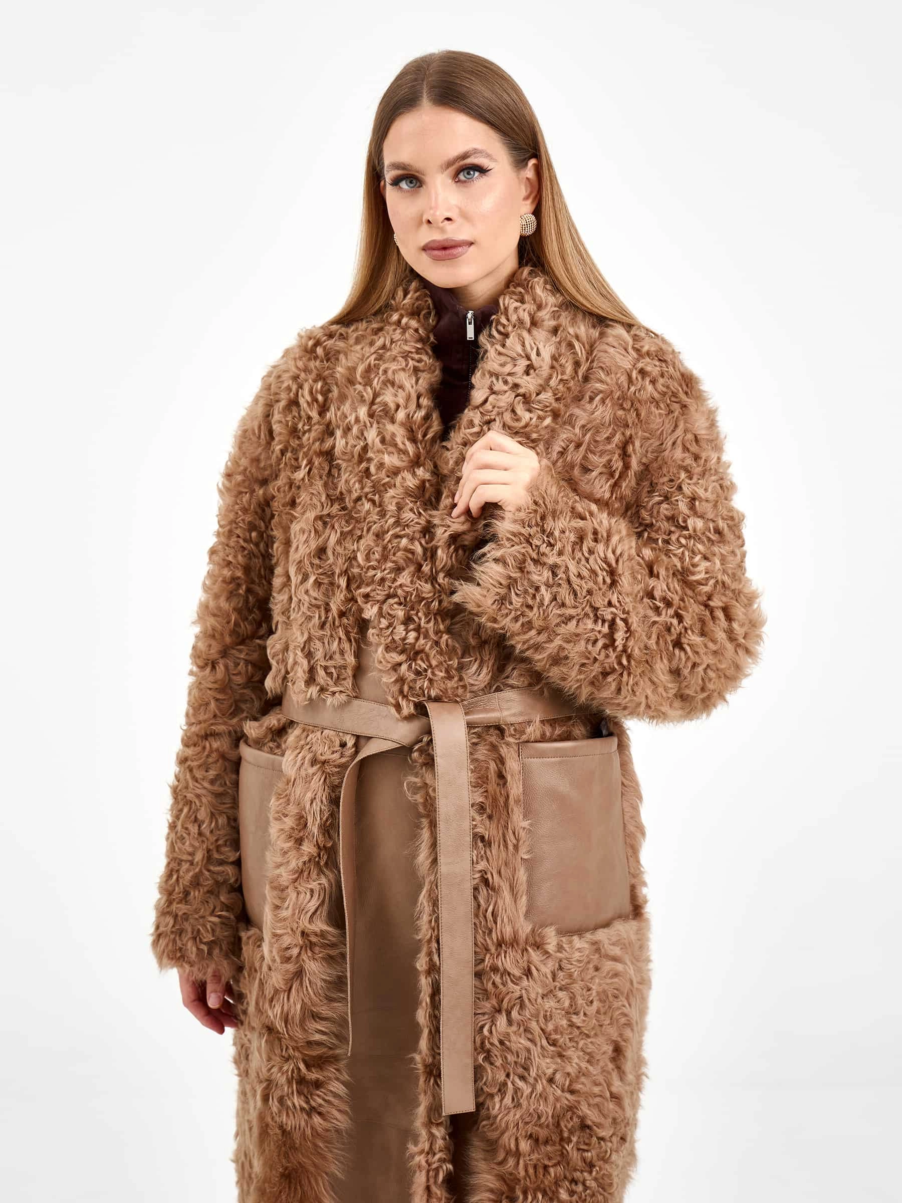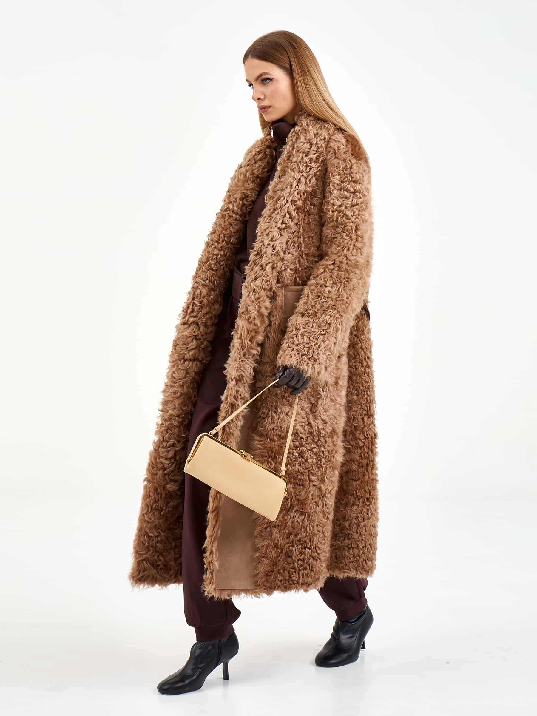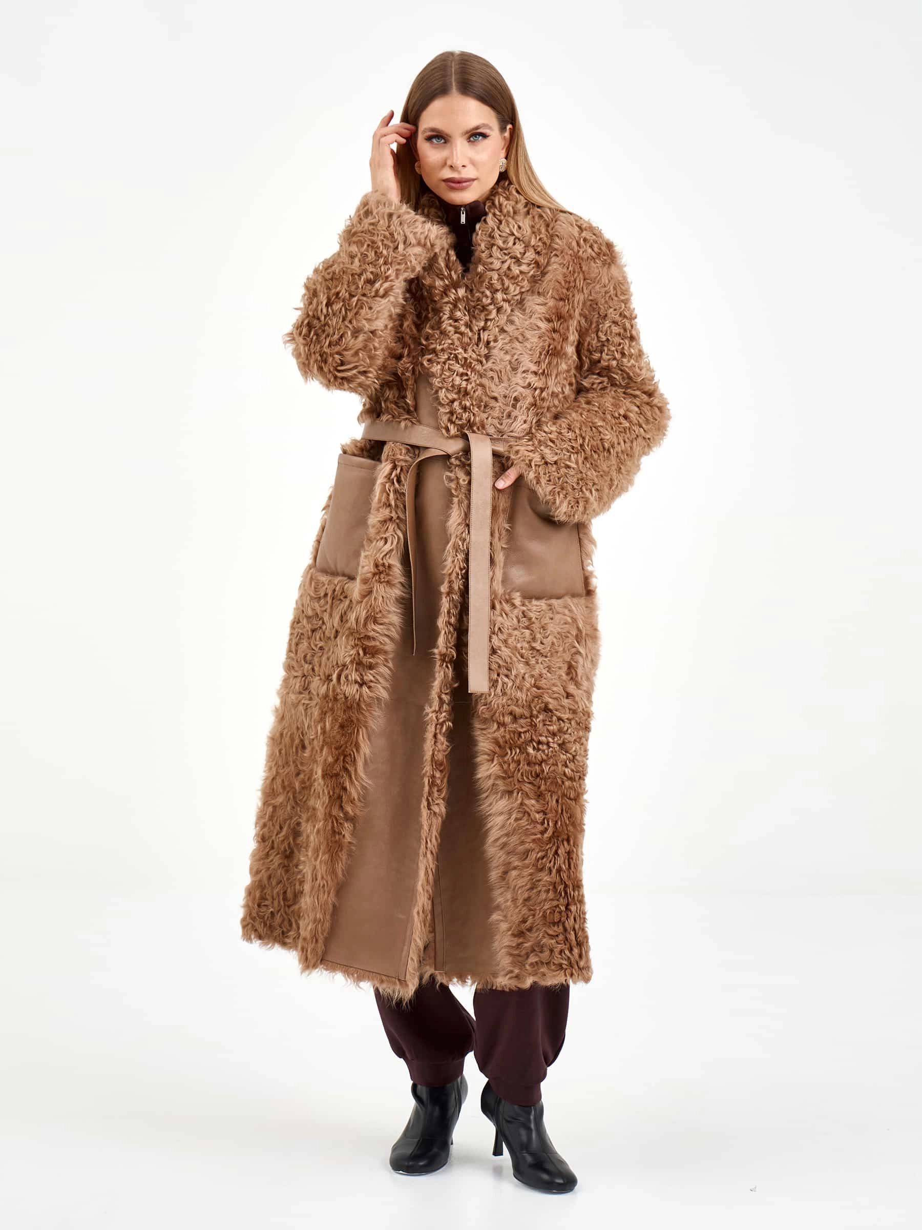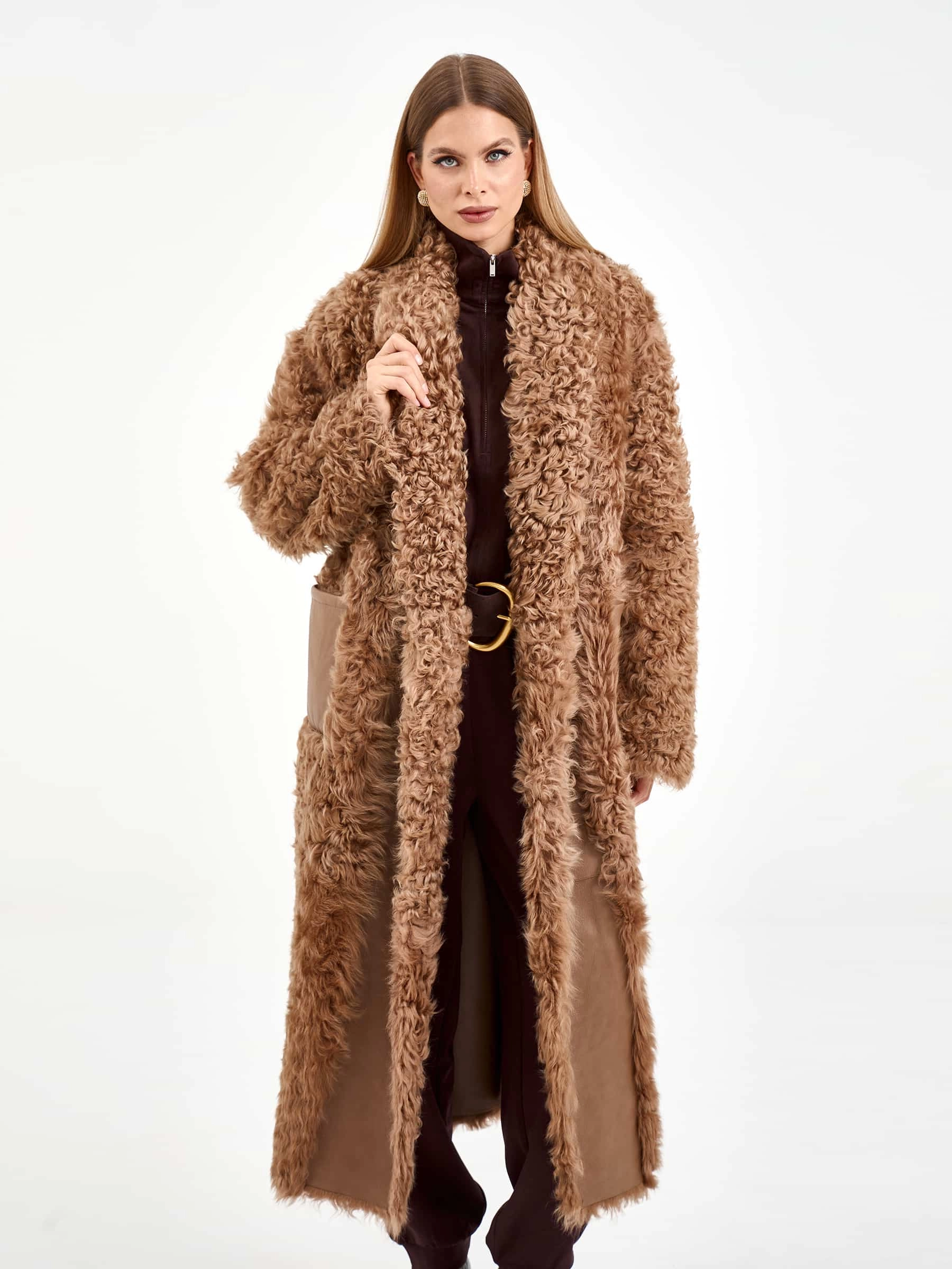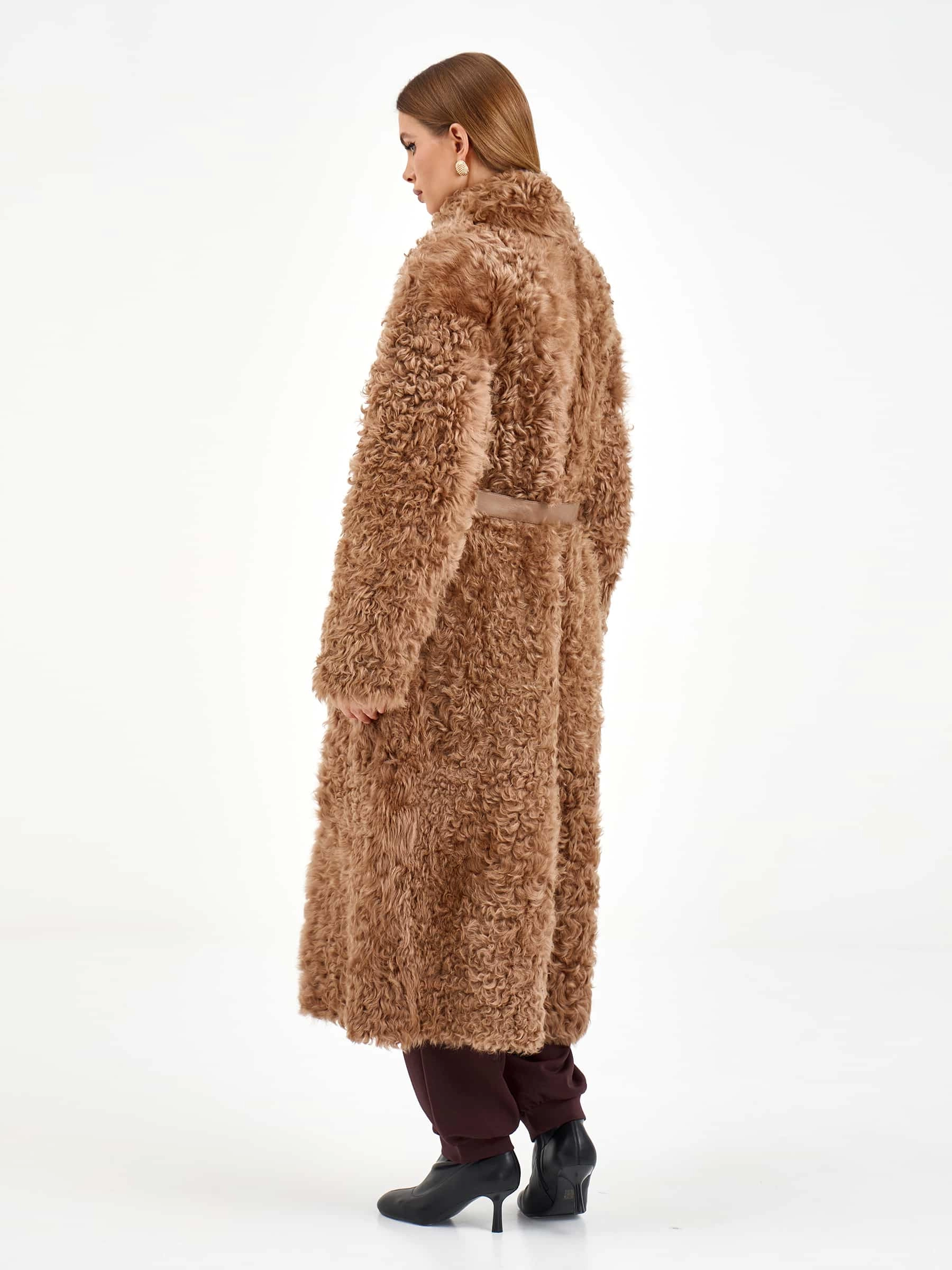 Длинная женская дубленка из натуральной овчины тиградо премиум-класса нежного светло-коричневого оттенка — воплощение природной роскоши и безупречного вкуса: для пошива модели с шалевидным воротником использовали густую шелковистую овчину с мелкими завитками — калган (овчина тиградо), которая создает узнаваемую объемную фактуру и великолепно сохраняет тепло, а прямой свободный крой длиной 122 см со спущенным плечом комфортно садится по фигуре, не сковывая движений. Модель дополнили двумя накладными карманами, добавляющими практичности, и широким поясом, который удерживает запах и позволяет при желании подчеркнуть линию талии, создавая женственный силуэт; отсутствие подкладки сохраняет естественную структуру натурального меха. Совет стилиста: объемная фактура тиградо и длина макси делают это полупальто самодостаточным акцентом образа — носите его с максимально лаконичной базой: узкими джинсами или брюками, облегающим свитером крупной вязки и высокими сапогами на плоской подошве, позволяя роскошному меху с мелк