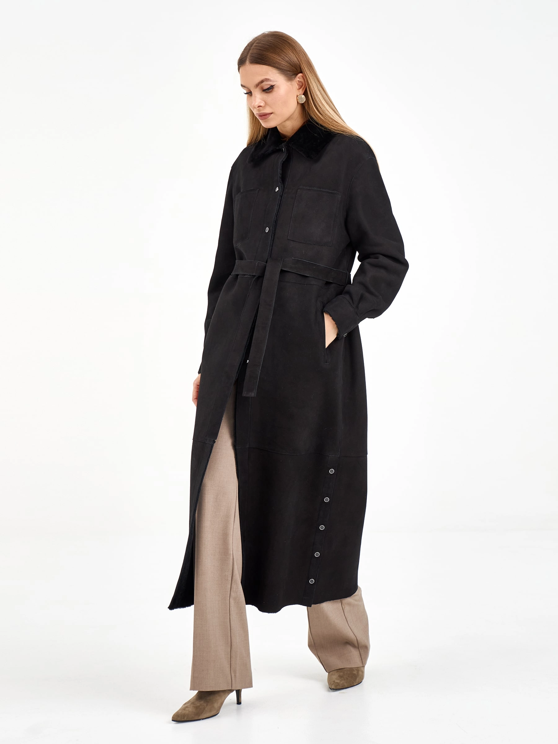 Эта длинная дублёнка из чёрной замши и овчины мерино предлагает два образа в одном: с поясом она создаёт элегантный силуэт, а без него — современный и струящийся. Практичные кнопки, спущенный рукав и высокие боковые разрезы добавляют комфорта и свободы движений. Рекомендация по стилю: сочетайте её с объёмным свитером, узкими джинсами и грубыми ботинками, чтобы создать модный контраст текстур.