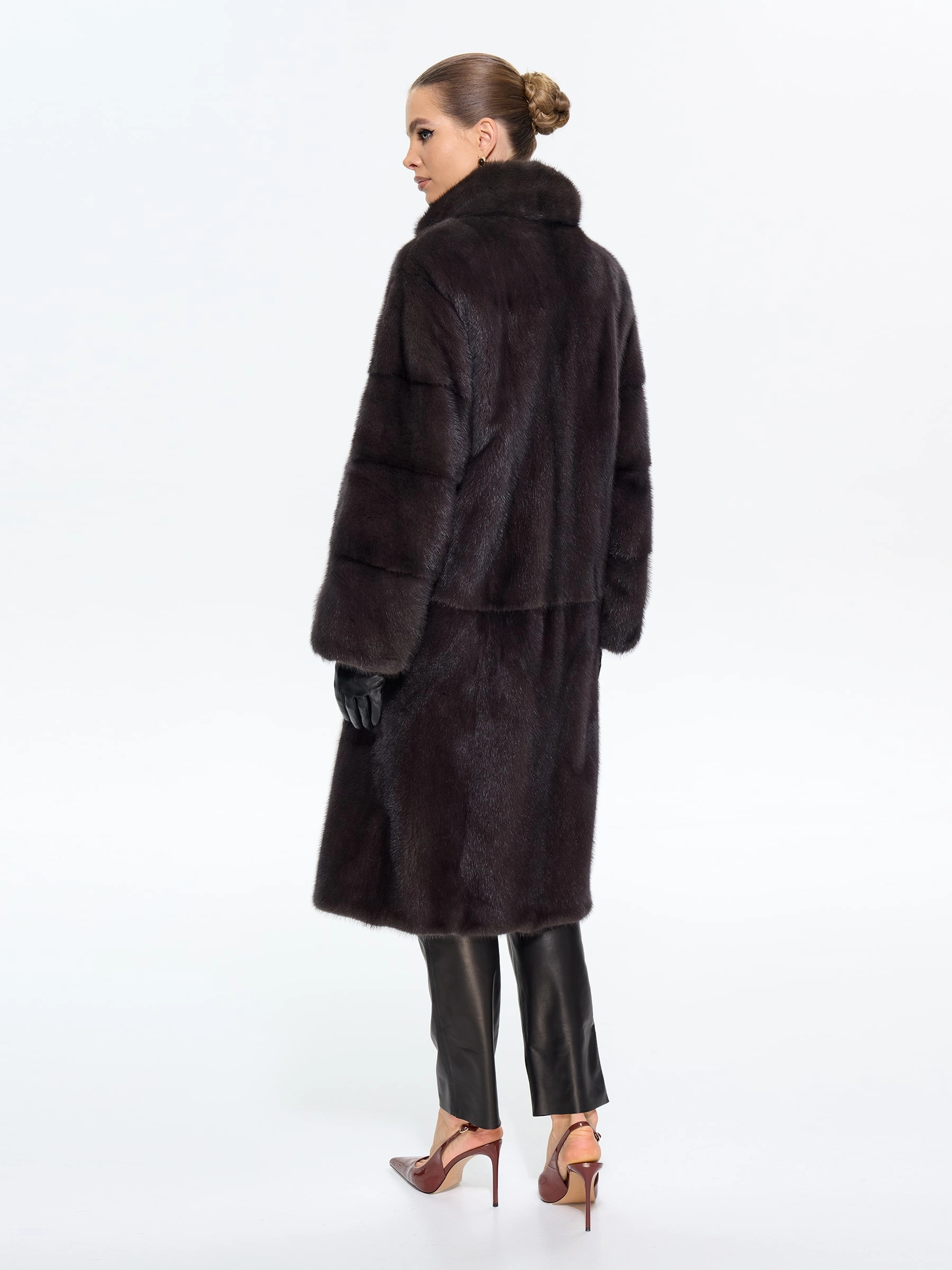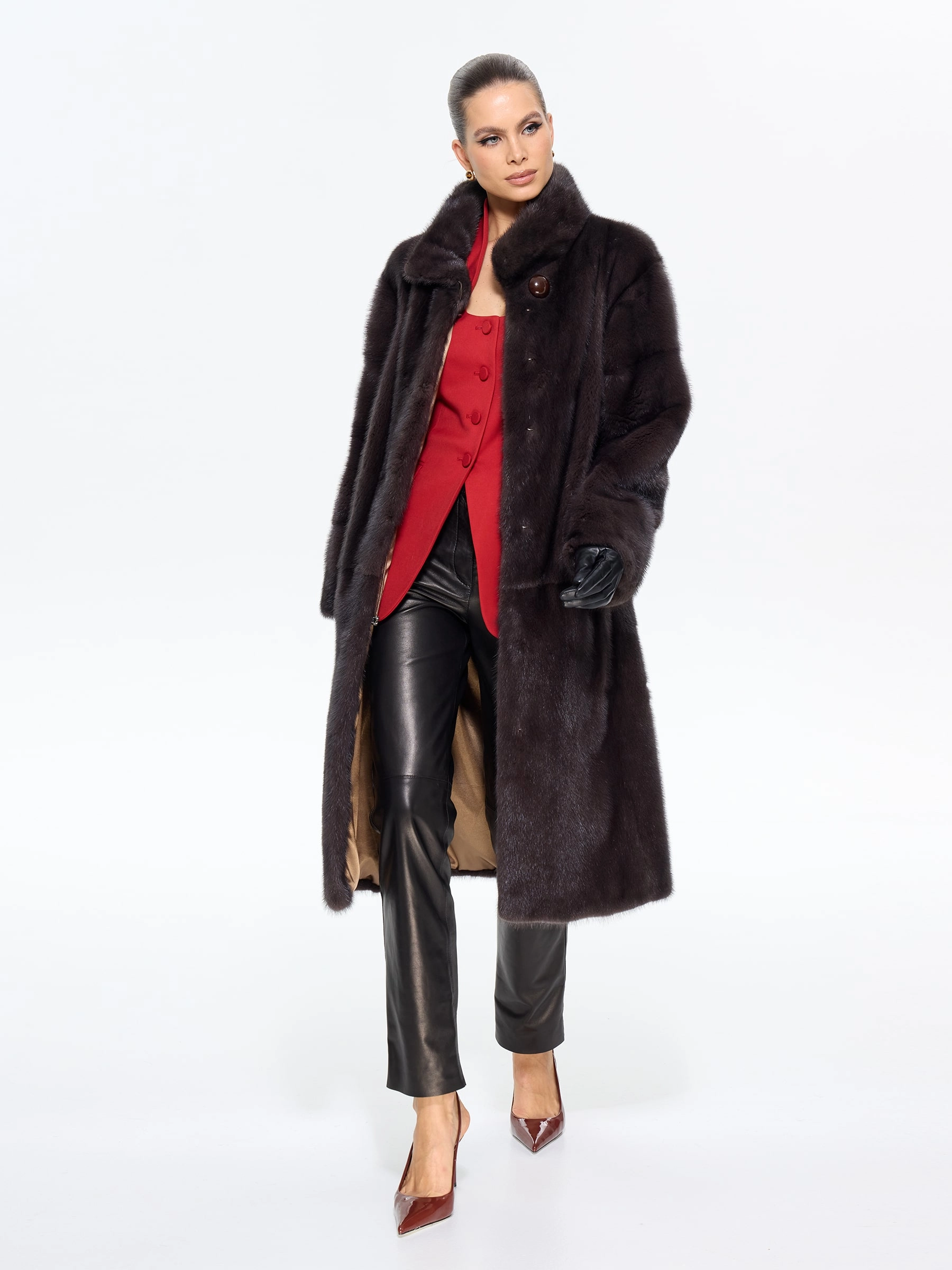 Длинная классическая шуба из меха норки премиум-класса с элегантным воротником-стойкой воплощает вневременную элегантность. Модель прямого силуэта длиной 110 см с втачными рукавами и застежкой-клипсой отличается особой деталью — поперечной раскладкой меха на рукавах, что подчеркивает роскошную текстуру меха. Практичность шубы обеспечена удобными врезными карманами и внутренней кулиской для регулировки силуэта. Стилисты рекомендуют сочетать эту модель с кожаными брюками и сапогами для дневного образа или с вечерним платьем для особых случаев — это универсальная инвестиция в ваш гардероб, где классика встречается с современной функциональностью.