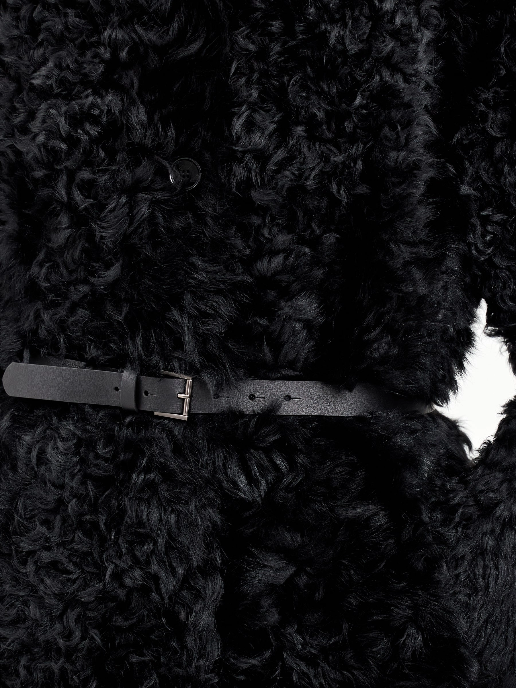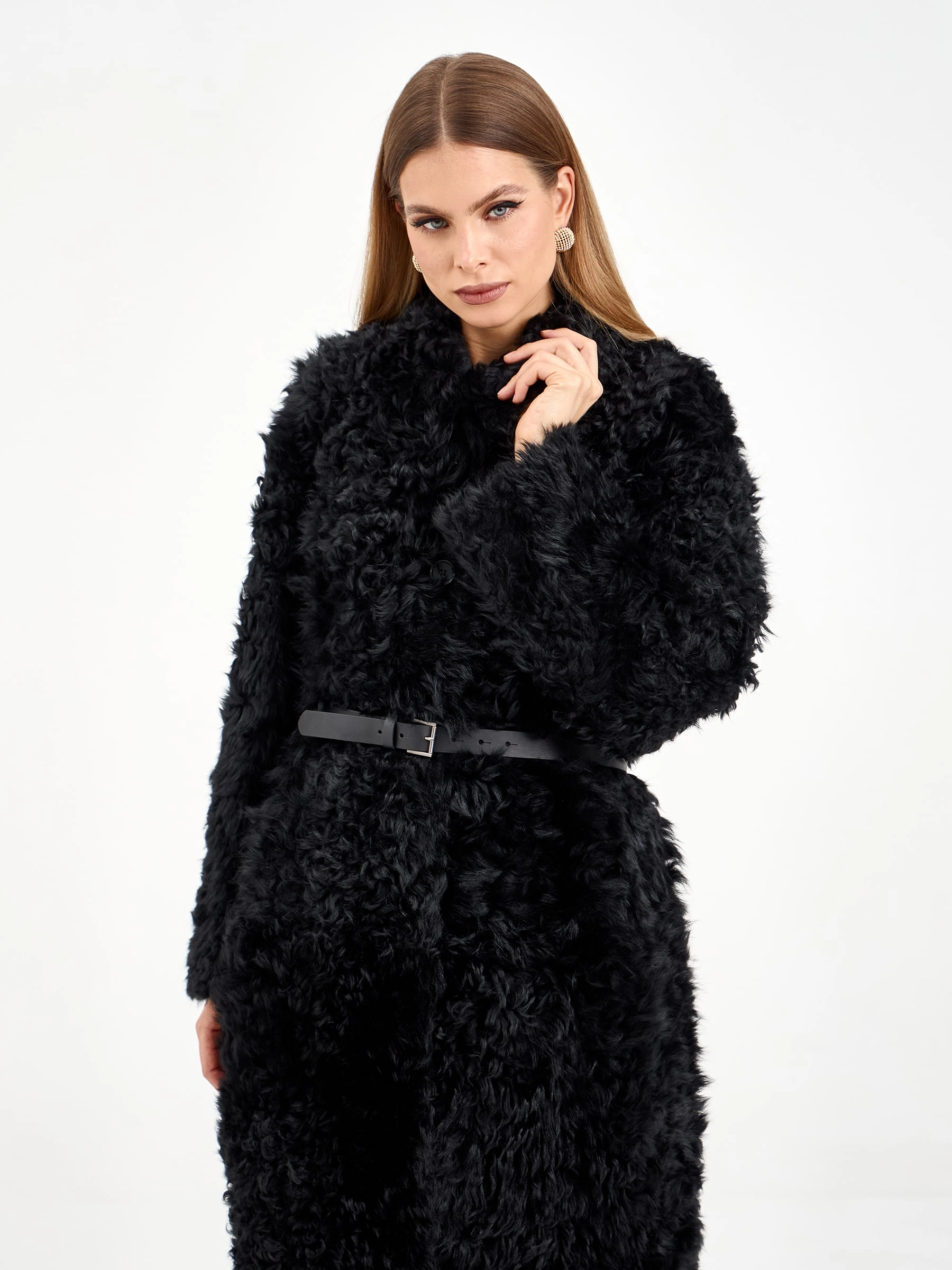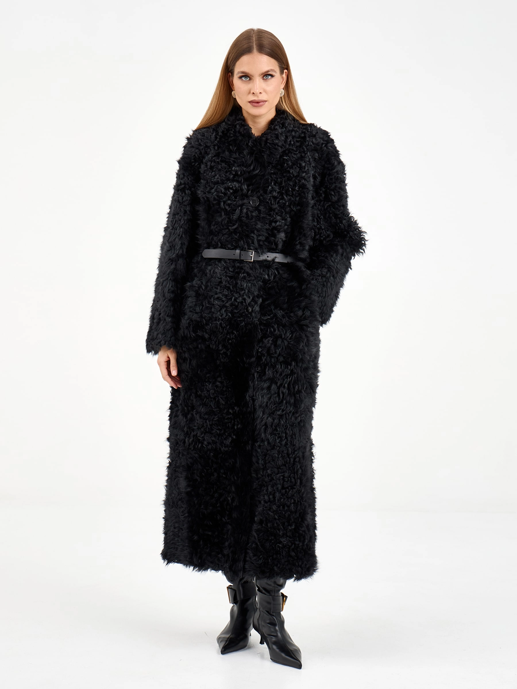 Представляем длинную дубленку из натуральной овчины «Тиградо», чья фактура с крупным завитком сразу привлекает внимание. Модель свободного кроя с воротником-стойкой и изящным ремнем для акцента на талии. Эта дубленка станет звездой вашего гардероба: сочетайте ее с водолазками, кожаными брюками и уггами для повседневного стиля или с платьем-миди и сапогами-чулками для элегантного образа.