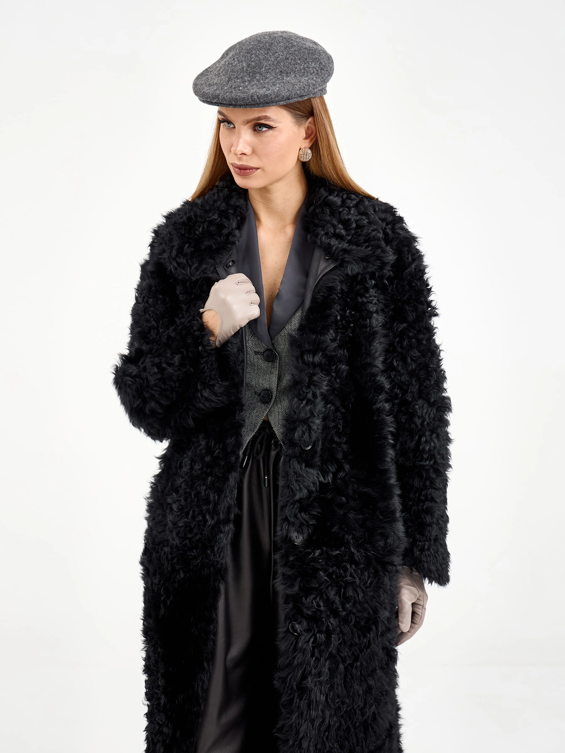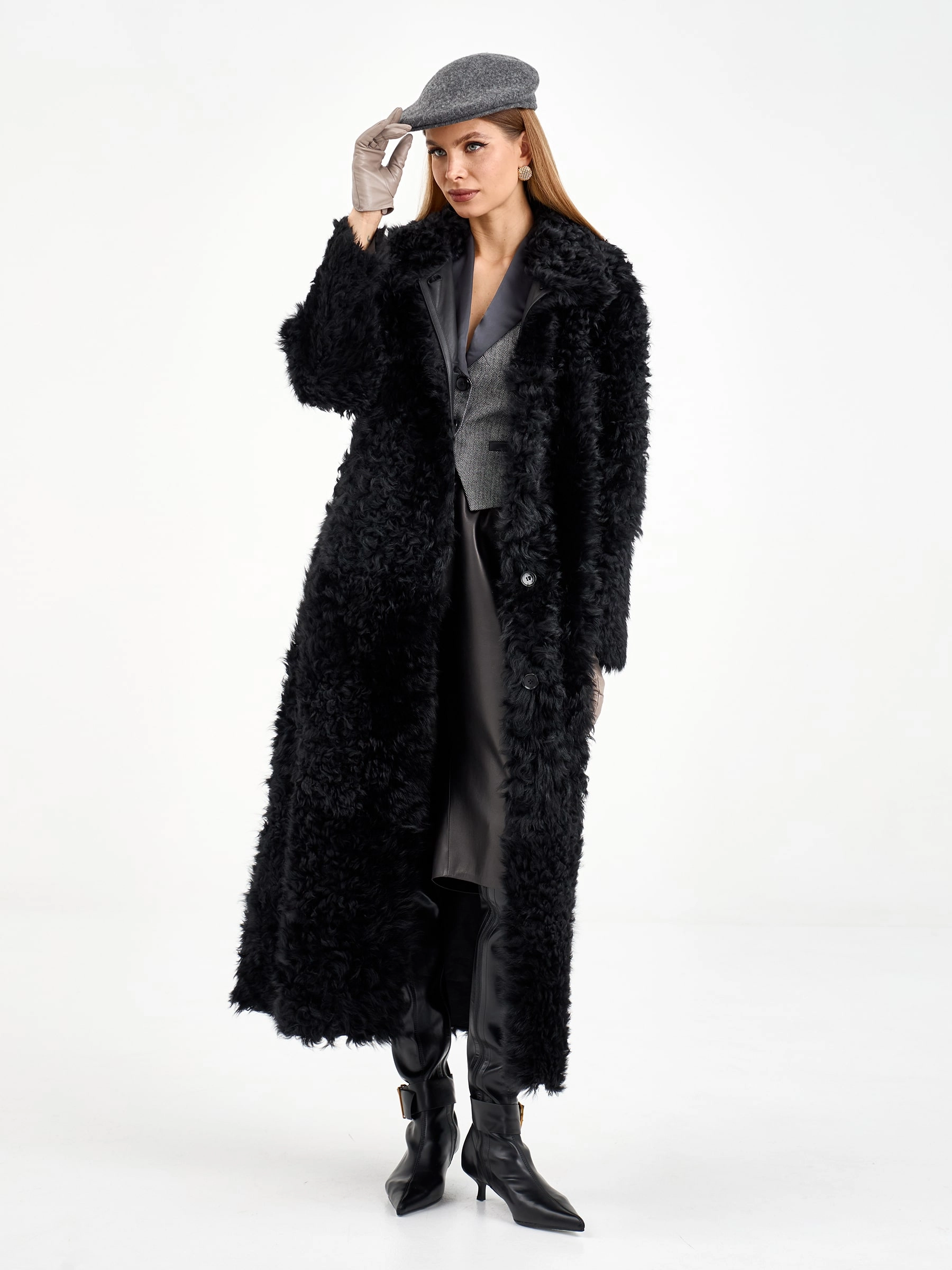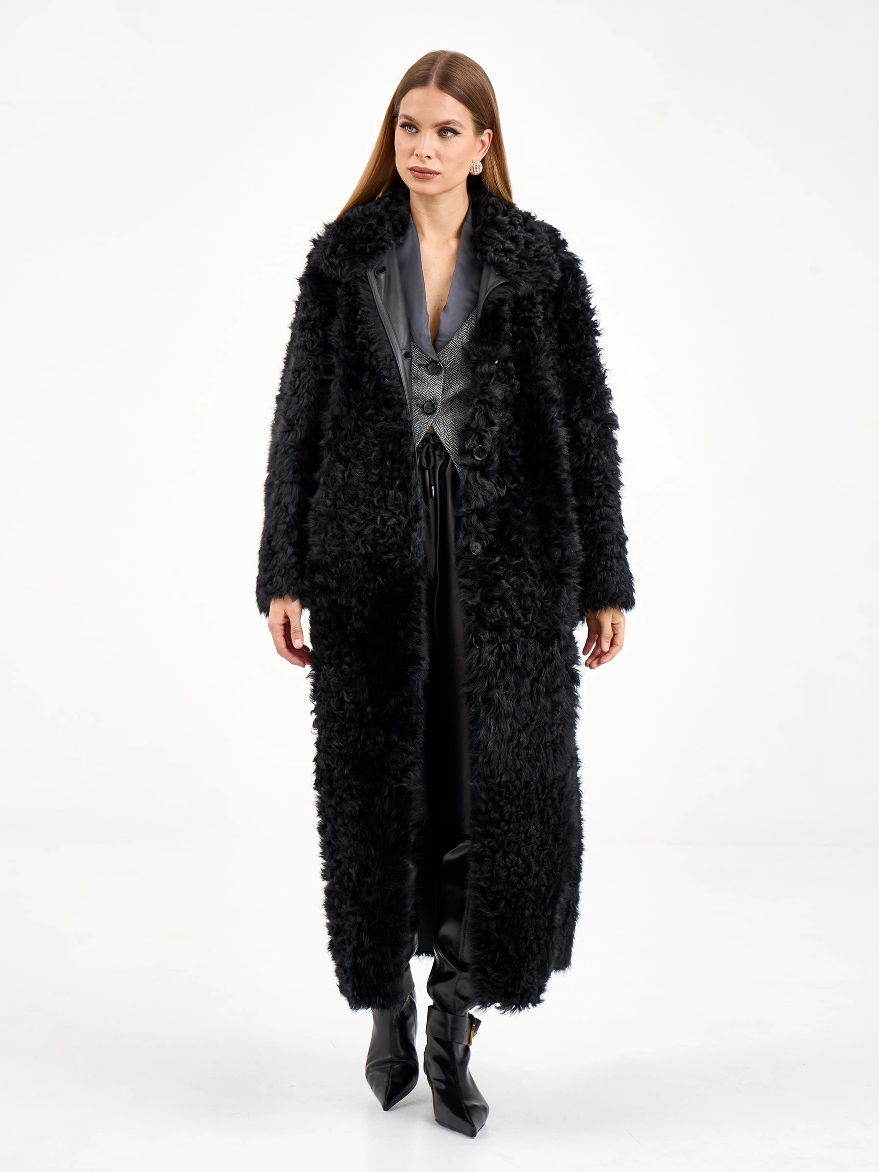 Товар длинная женская дубленка из тиградо 2080, черная, размер 48, артикул 65030 выполнен из овчина "тиградо" с застежкой пуговицы. Рассчитан на сезон: зима. Длина изделия 132 см, силуэт свободный.