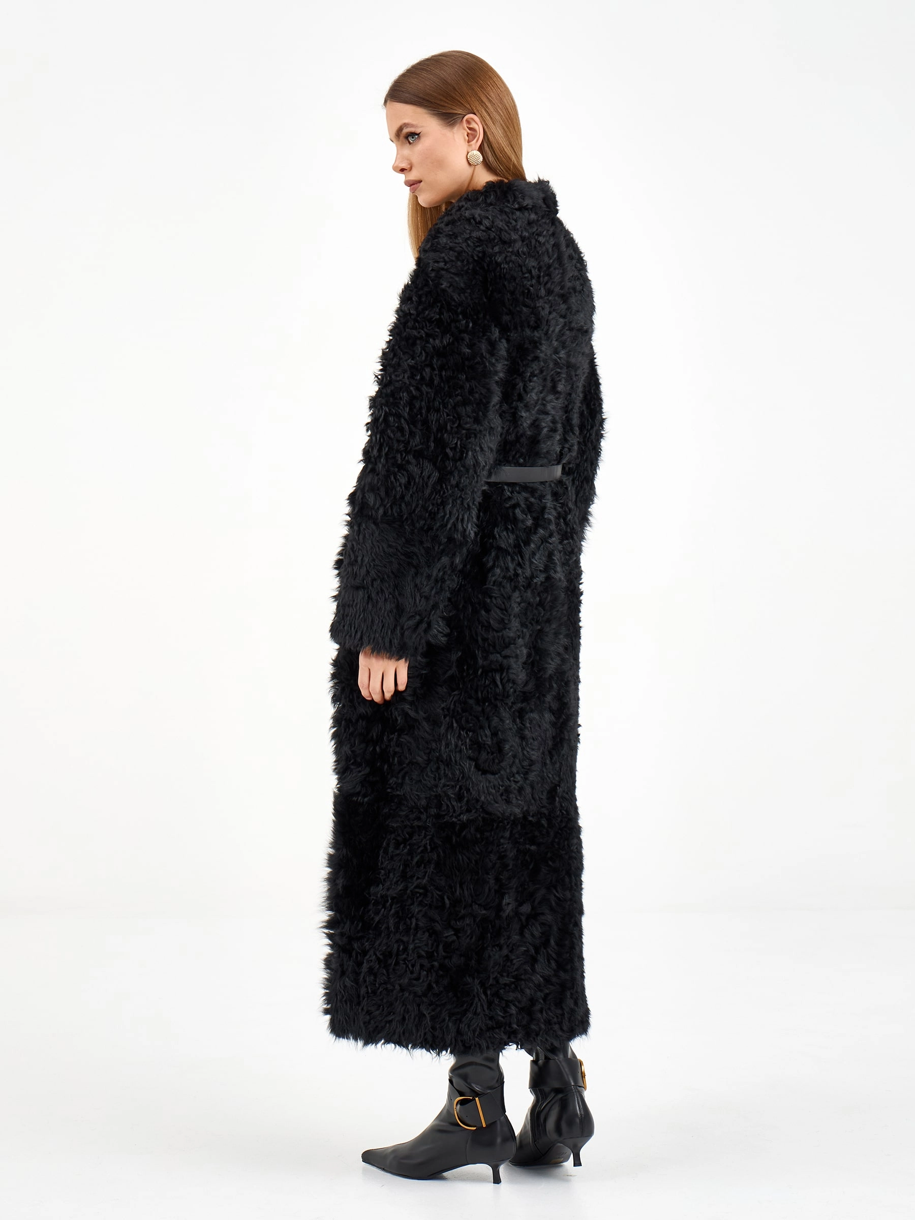 Длинная женская дубленка из тиградо 2080, черная, размер 48, артикул 65030