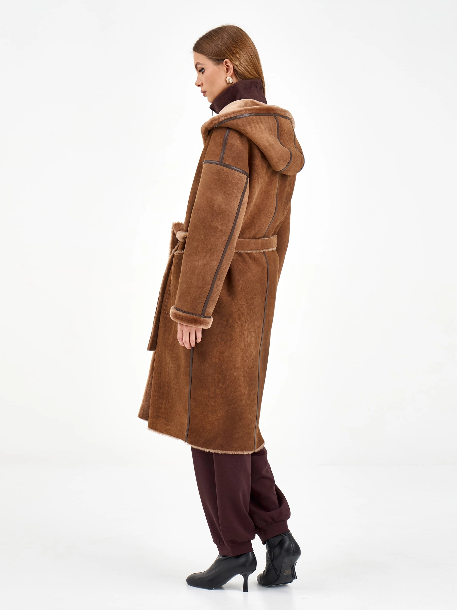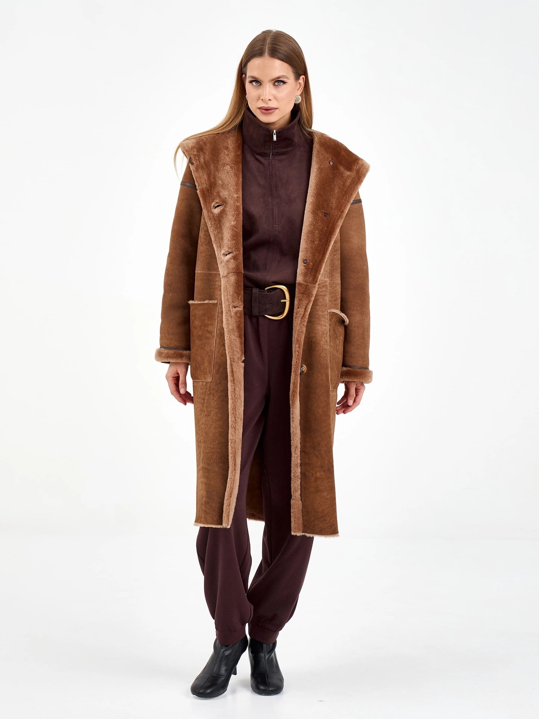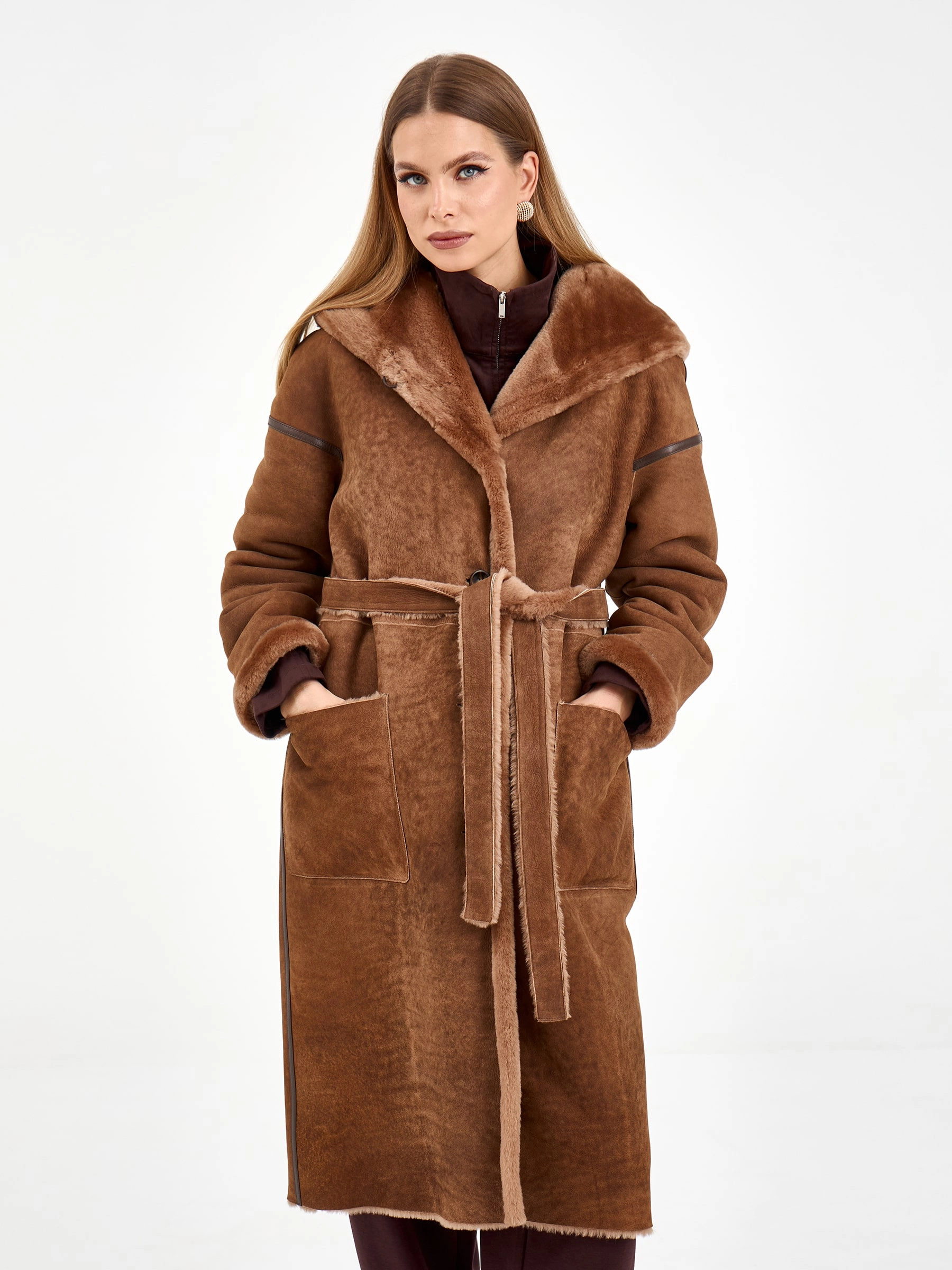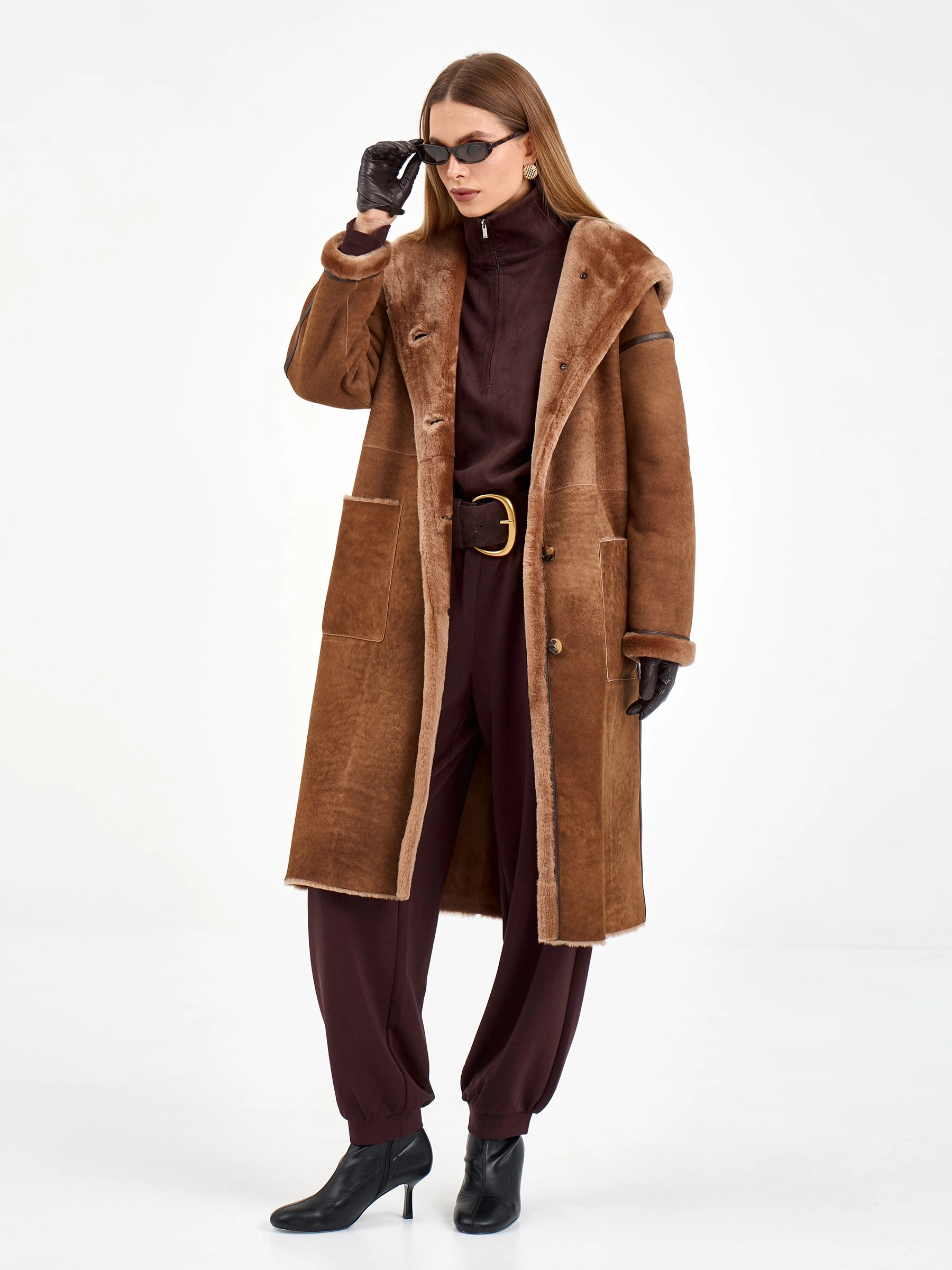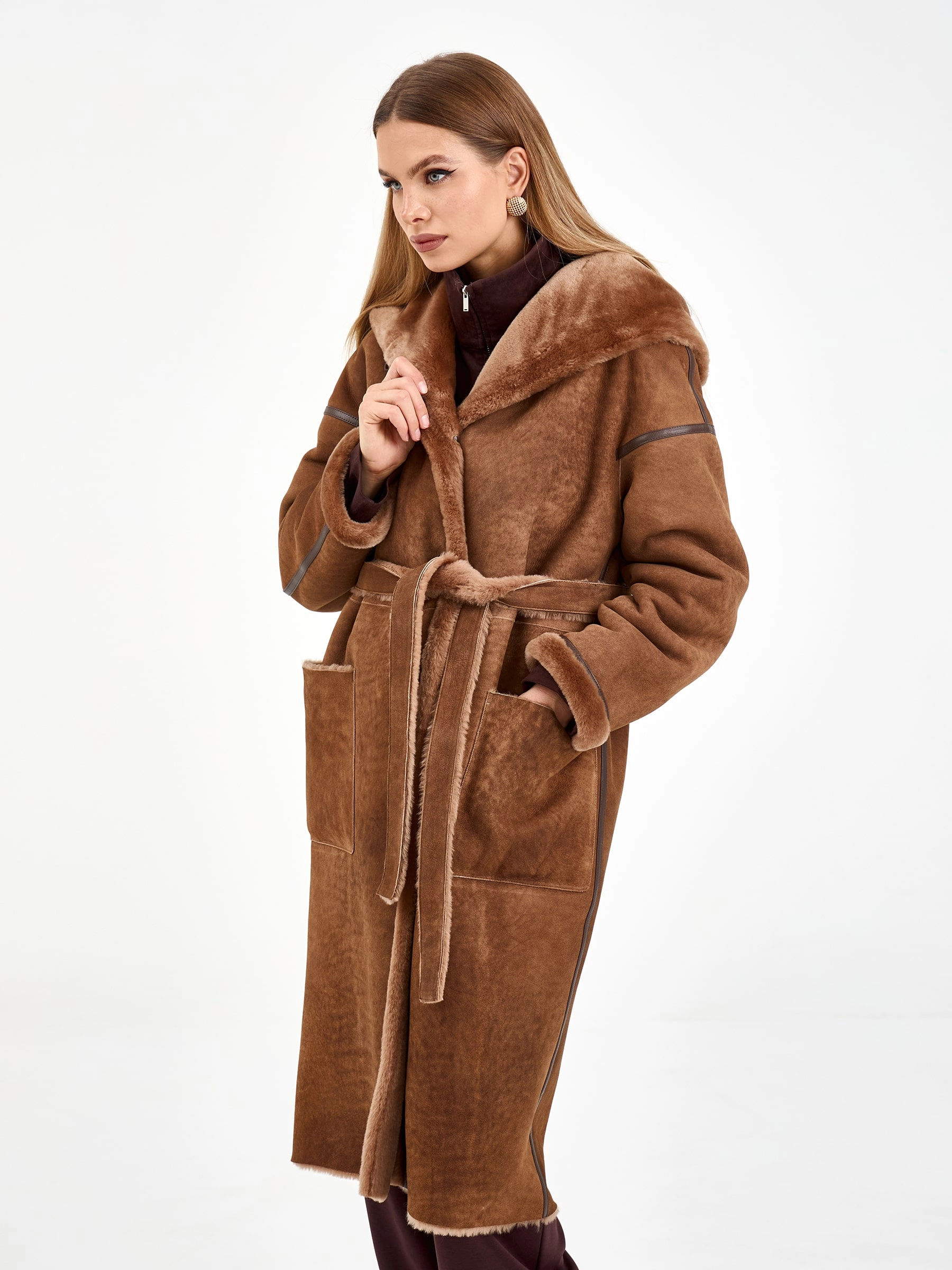 Эта длинная дубленка из натуральной овчины мерино насыщенного коричневого оттенка создана для тех, кто ценит безупречный уют и стиль в каждой детали своего зимнего гардероба. Модель свободного кроя длиной 110 сантиметров с глубоким объемным капюшоном и спущенной линией плеча дарит ощущение непринужденной элегантности и надежно согревает даже в самые холодные дни. Особого внимания заслуживают изящные детали: аккуратный кожаный кант, проходящий по линиям кроя, деликатно подчеркивает силуэт и добавляет модели графичную выразительность, а практичные накладные боковые карманы становятся функциональным акцентом. Удобная застежка на пуговицы сохраняет чистоту линий и позволяет легко регулировать посадку. Расслабленный силуэт и продуманный крой создают ощущение комфорта и свободы движений. Стилисты рекомендуют носить эту дубленку с объемным свитером, прямыми джинсами и ботинками челси для создания модного повседневного лука с городским драйвом и характером.