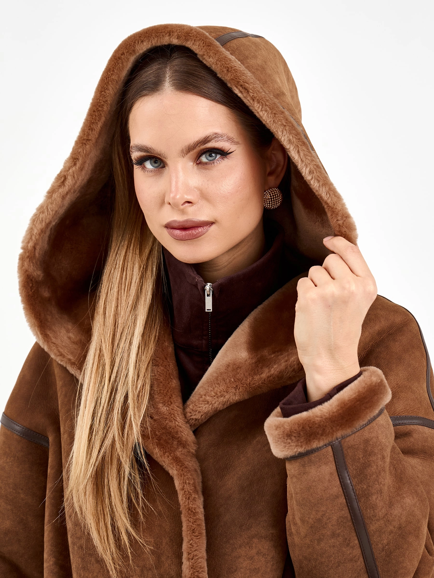 Длинная женская дубленка с капюшоном 2079, коричневая, размер 44, артикул 65120