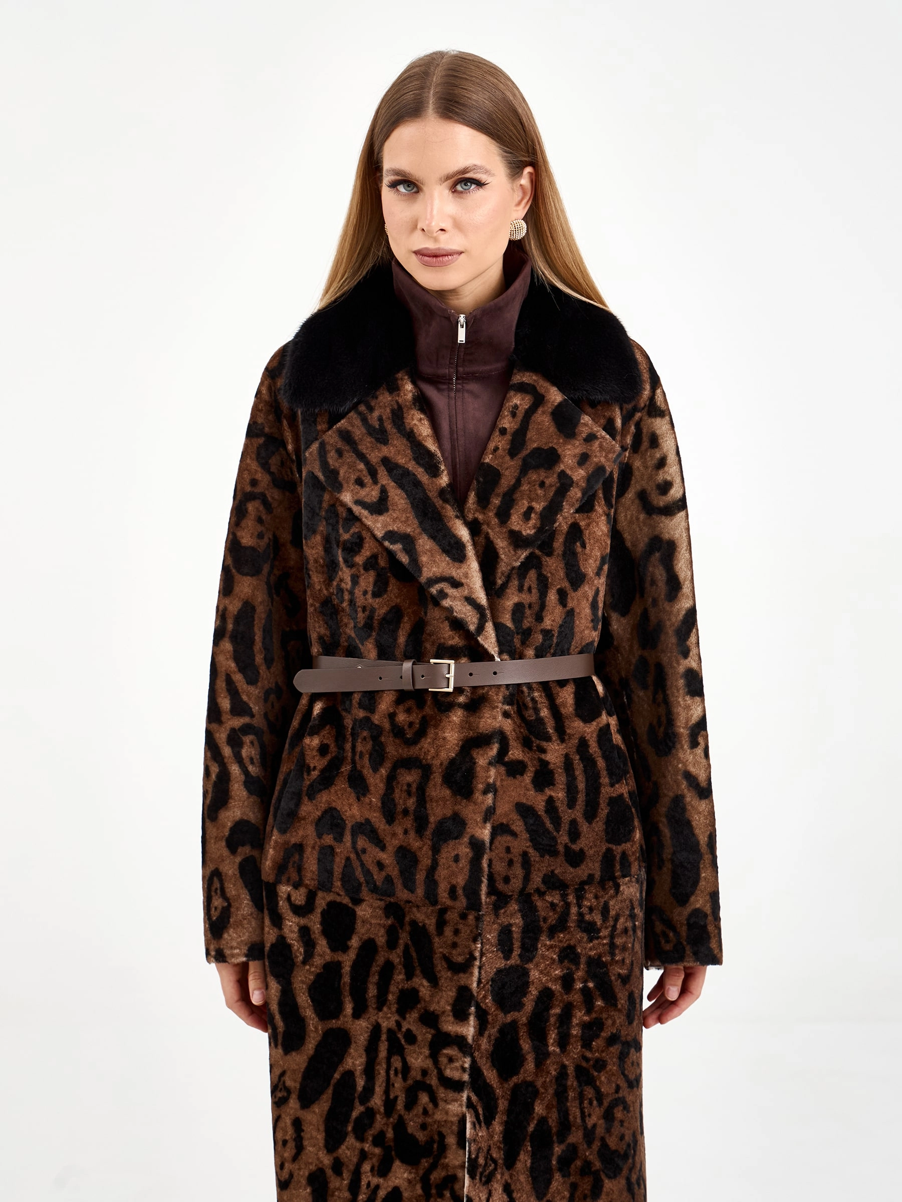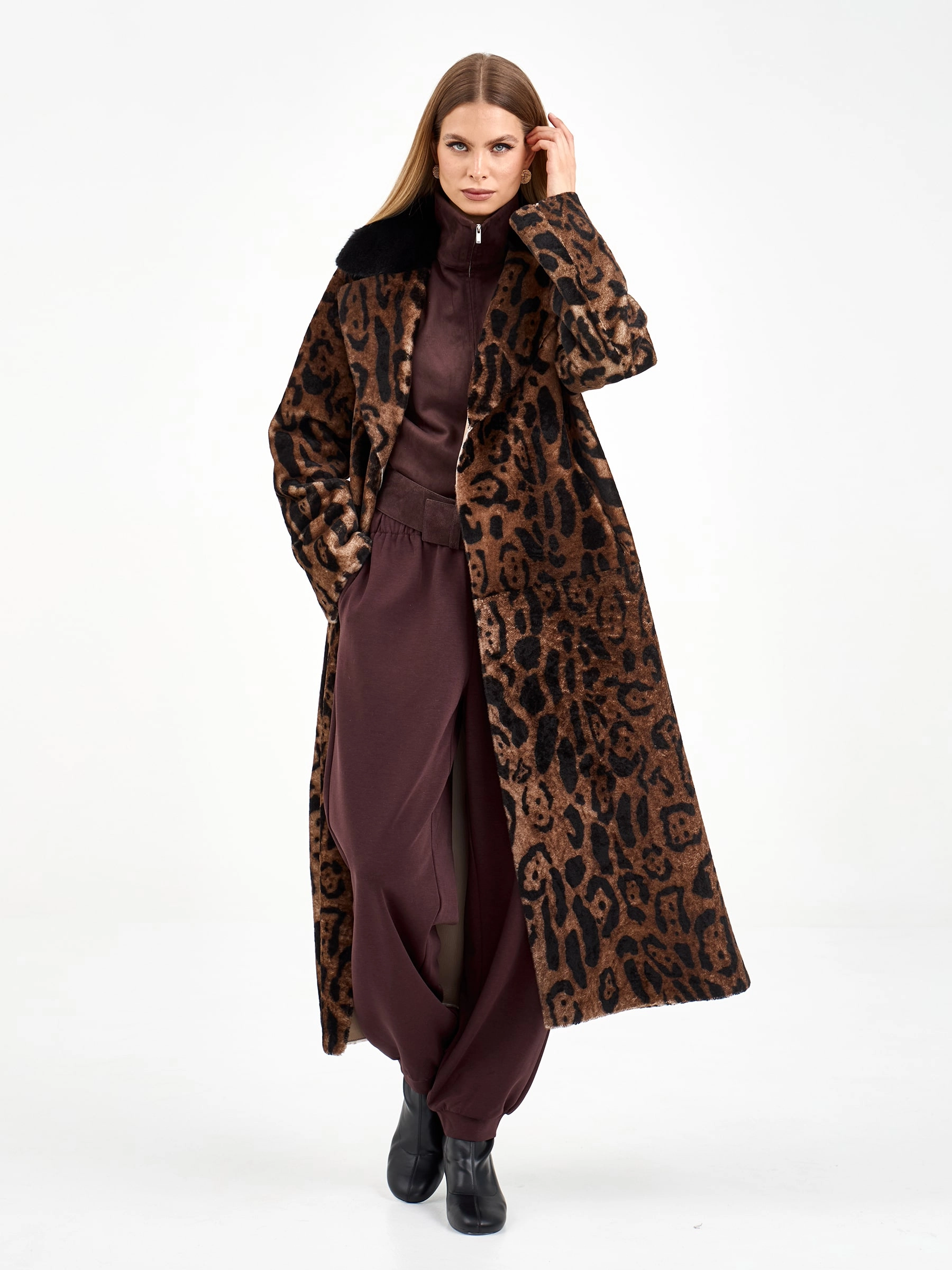Длинная дубленка из натуральной овчины с леопардовым принтом и роскошным воротником из норки — это воплощение элегантности и комфорта. Свободный силуэт и спущенный рукав создают непринужденный образ, который легко дополнить поясом для акцента на талии. Стилисты рекомендуют носить эту модель с однотонными базовыми вещами — например, с черными брюками-клеш и водолазкой, чтобы позволить принту и текстуре норки стать главным акцентом образа.
