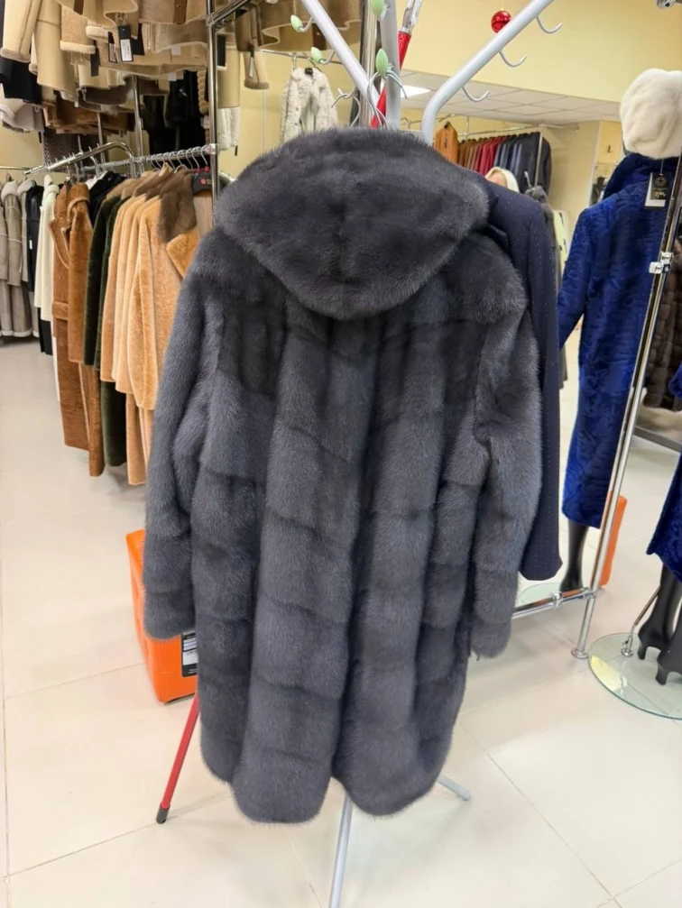 Длинная женская норковая шуба с капюшоном Москвичка-132, графитовая, размер 52, артикул 65390