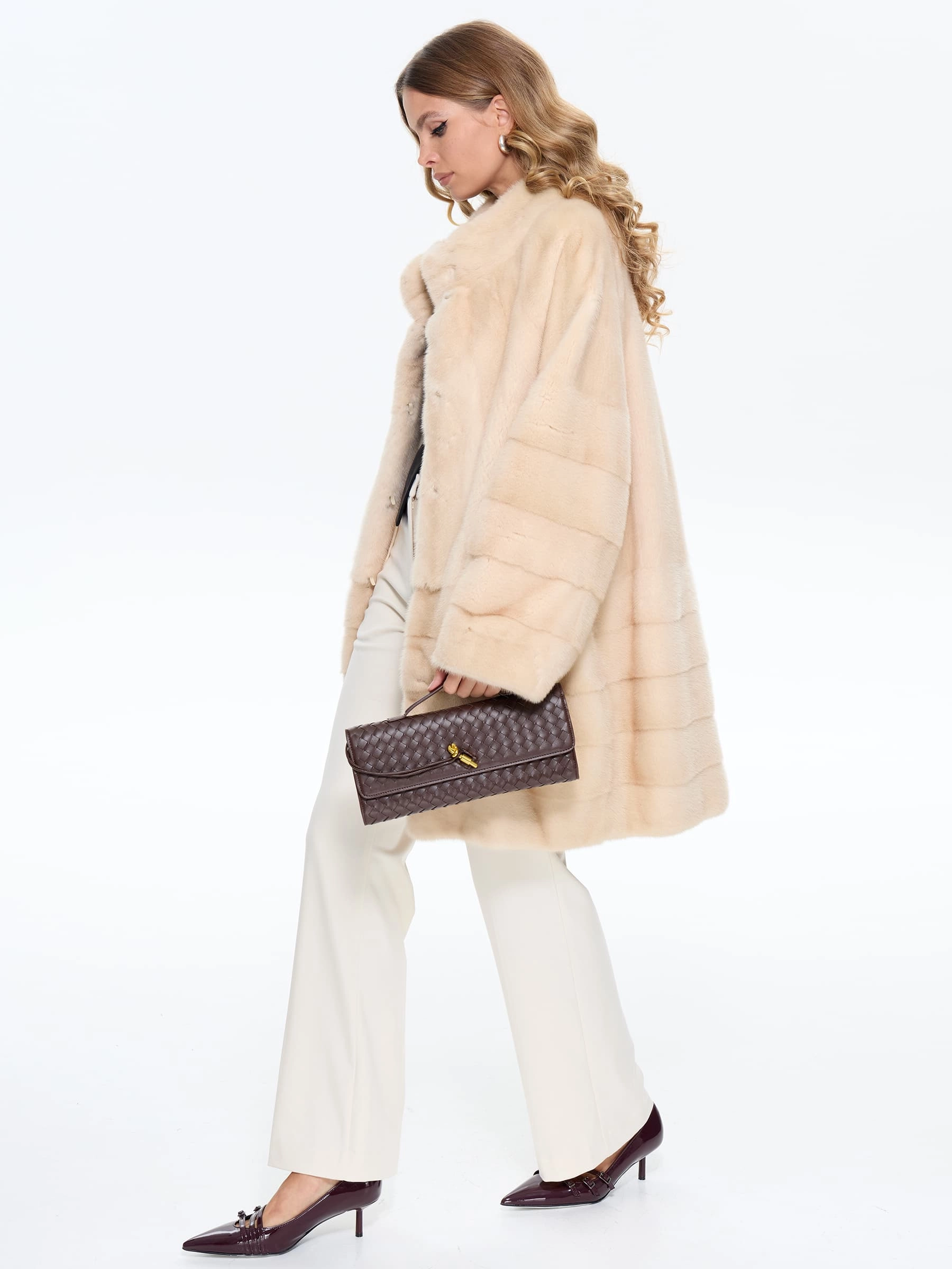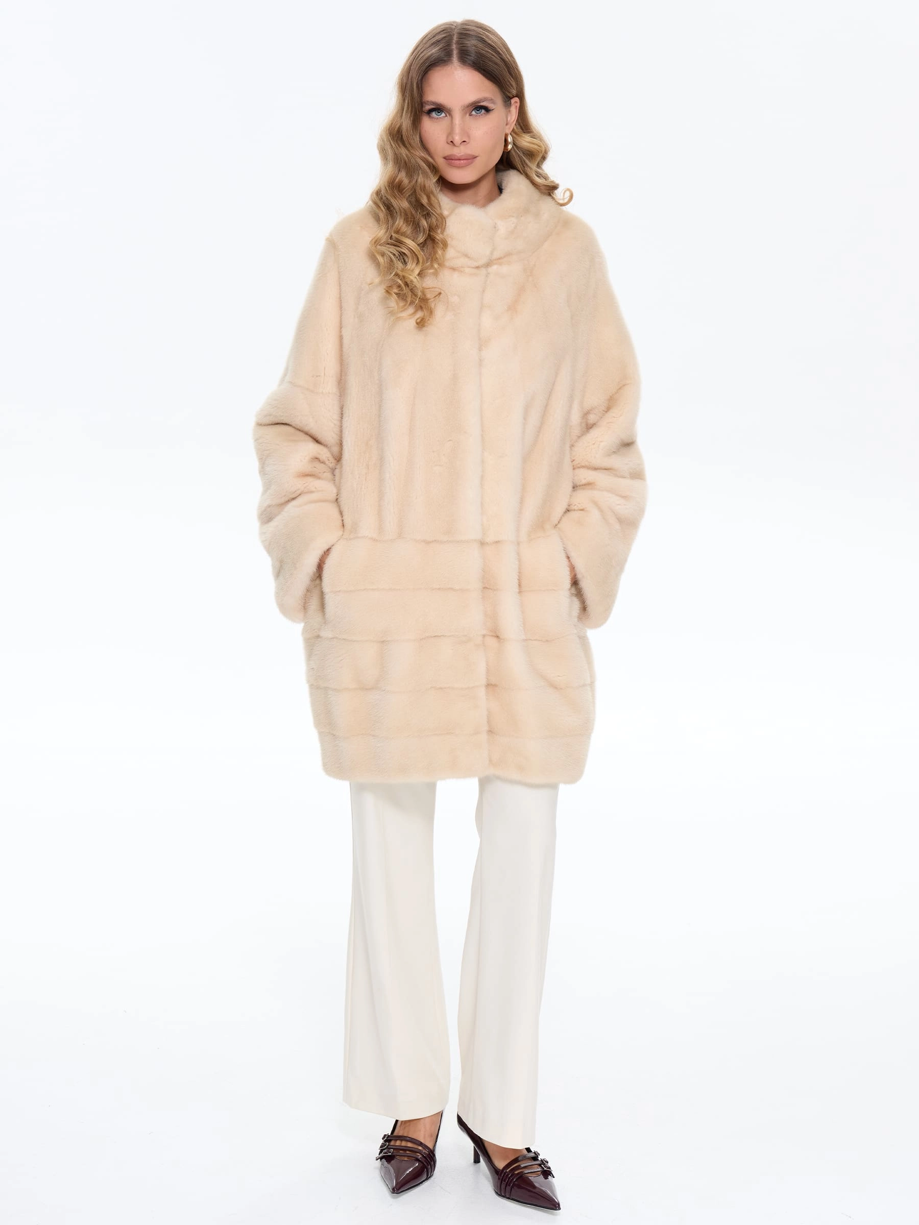 Эта шуба создана для истинных ценителей качества - мастера использовали нежную шелковистую бежевую норку с густым ворсом, которая великолепно сохраняет тепло в зимние холода. Её комбинированная раскладка, прямой силуэт и элегантно спущенные рукава без слов говорят о вашем безупречном вкусе и статусе. Практичный воротник-стойка надежно защищает от ветра, визуально удлиняет шею и гармонично сочетается с любыми аксессуарами. Мягкая вискозная подкладка с гипоаллергенной антистатической пропиткой обеспечивает комфорт носки, предотвращая трение об одежду, а скрытые клипсы бережно фиксируют изделие, сохраняя целостность мехового полотна.