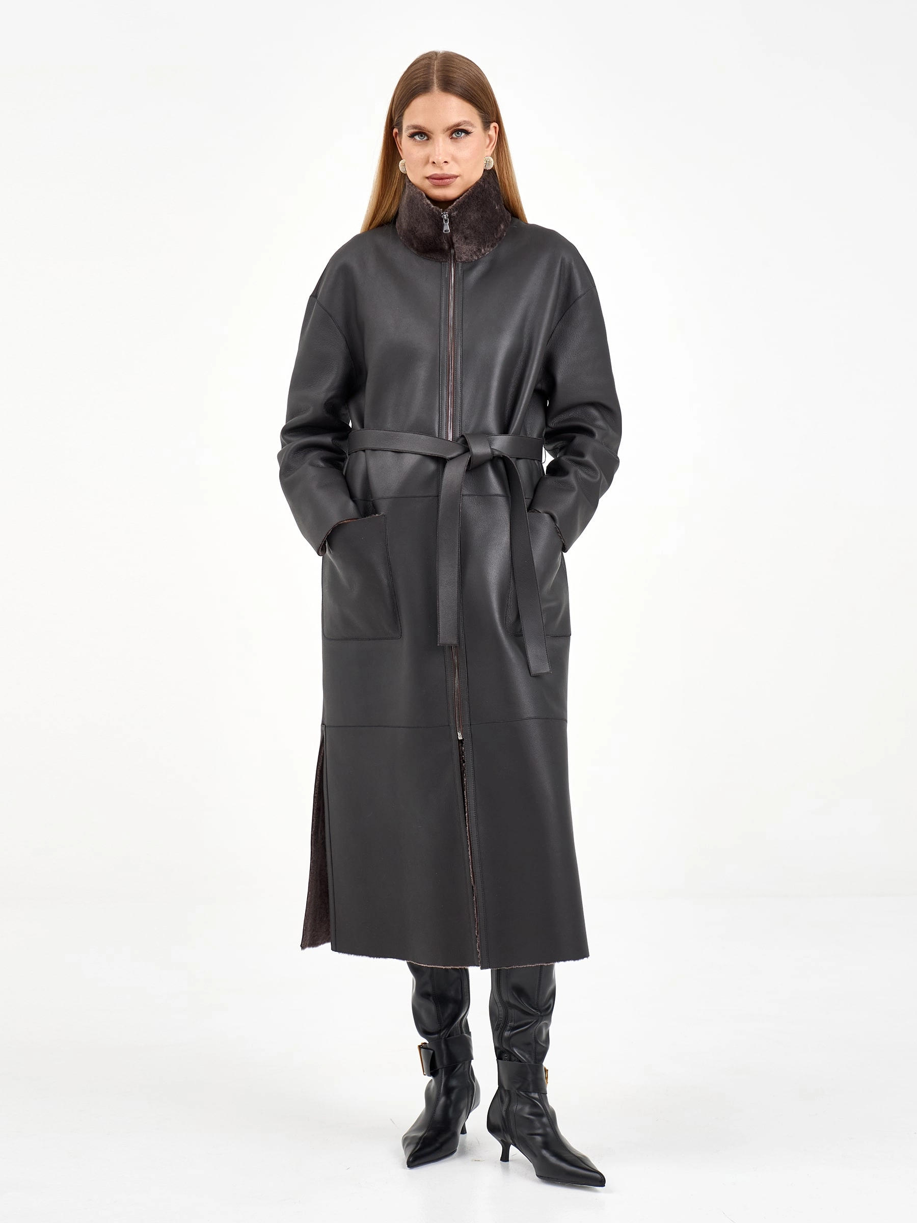 Товар коричневая длинная женская дубленка 2071, размер 48, артикул 64990 выполнен из овчина "мерино" с застежкой молния. Рассчитан на сезон: зима. Длина изделия 120 см, силуэт прямой.
