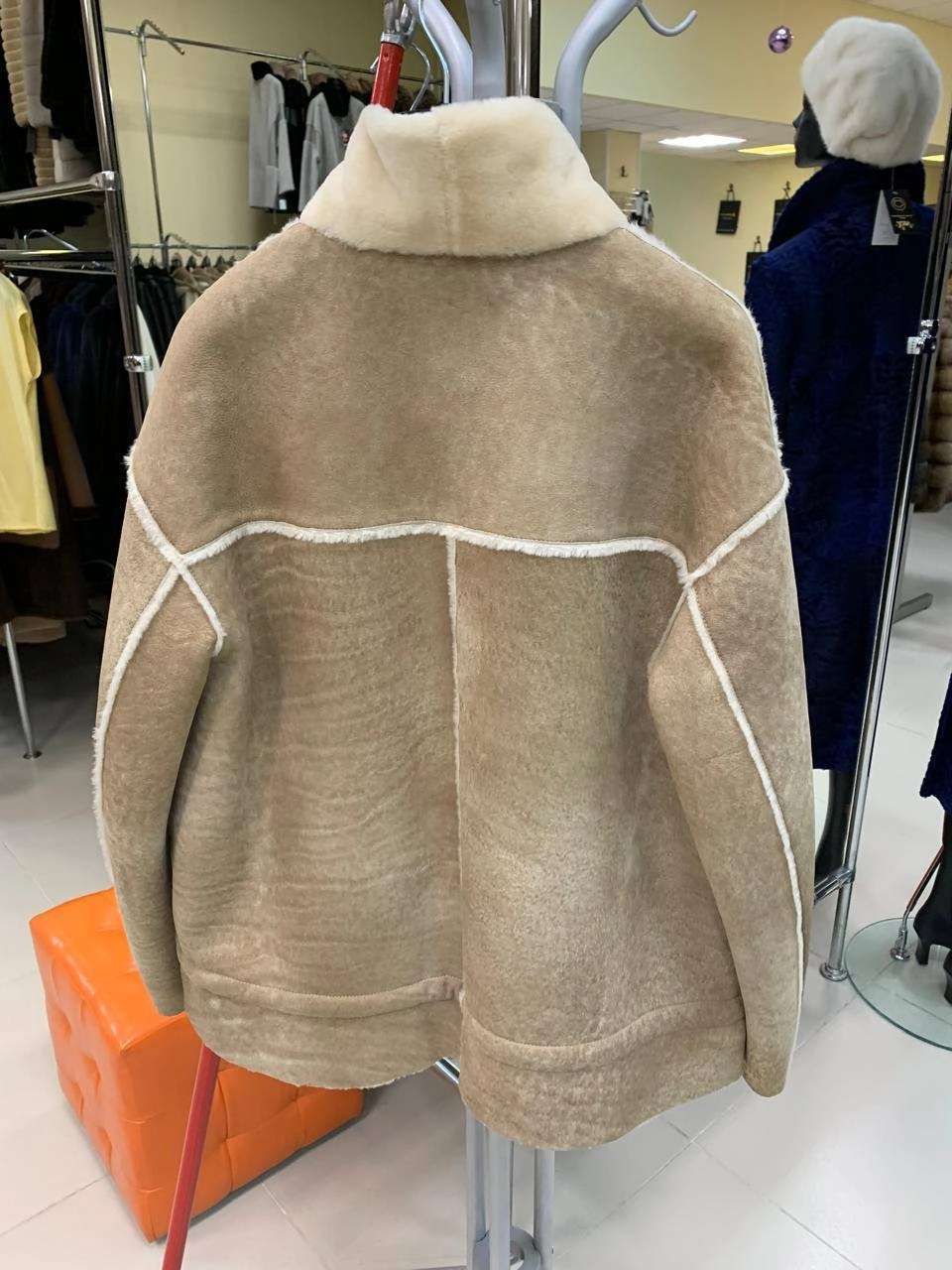 Товар короткая женская дубленка 2074, бежевая, размер 44, артикул 65250. Длина изделия 65 см.
