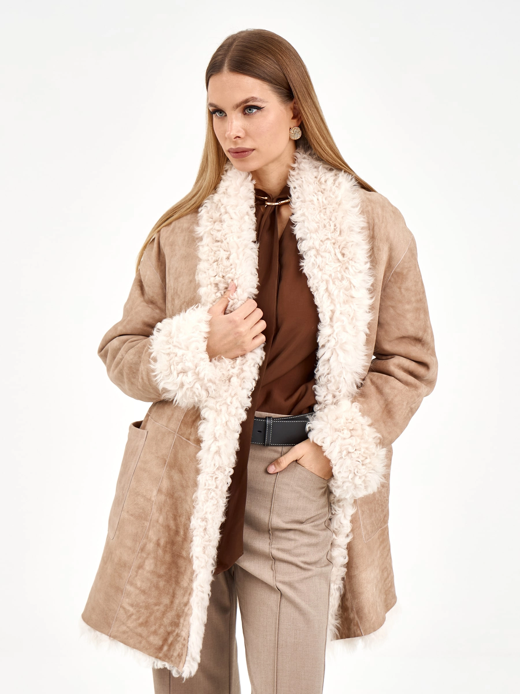 Товар короткая женская дубленка из тиградо 2078, бежевая, размер 44, артикул 65270 выполнен из овчина "тиградо" с застежкой нет. Рассчитан на сезон: зима. Длина изделия 80 см, силуэт свободный.