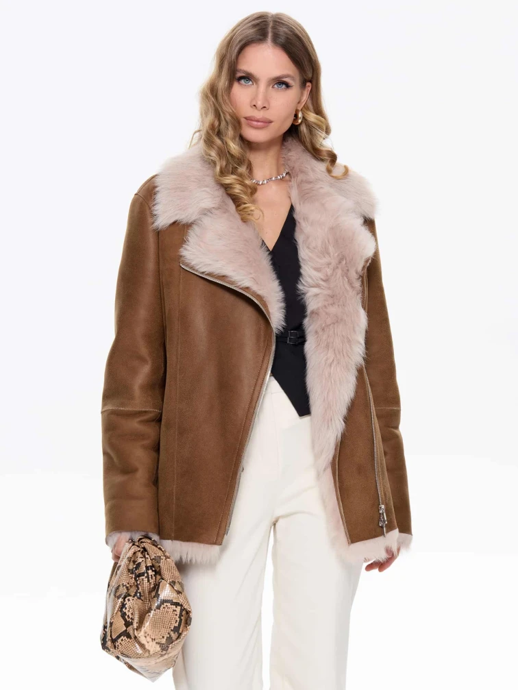 Дублёнка-легенда. Для пошива косухи использовали отборные шкуры овец с шелковистым ворсом. Спортивный крой, роскошь натуральной тосканской овчины и полуприлегающий силуэт создают образ уверенной современницы. Укороченная длина акцентирует талию, не стесняет движений и идеальна для вождения. Два боковых кармана, асимметричная застёжка-молния и английский воротник создают диалог между бунтарством и аристократизмом. Доступна в благородном бежевом оттенке. Великолепно сохраняет тепло в морозную погоду.