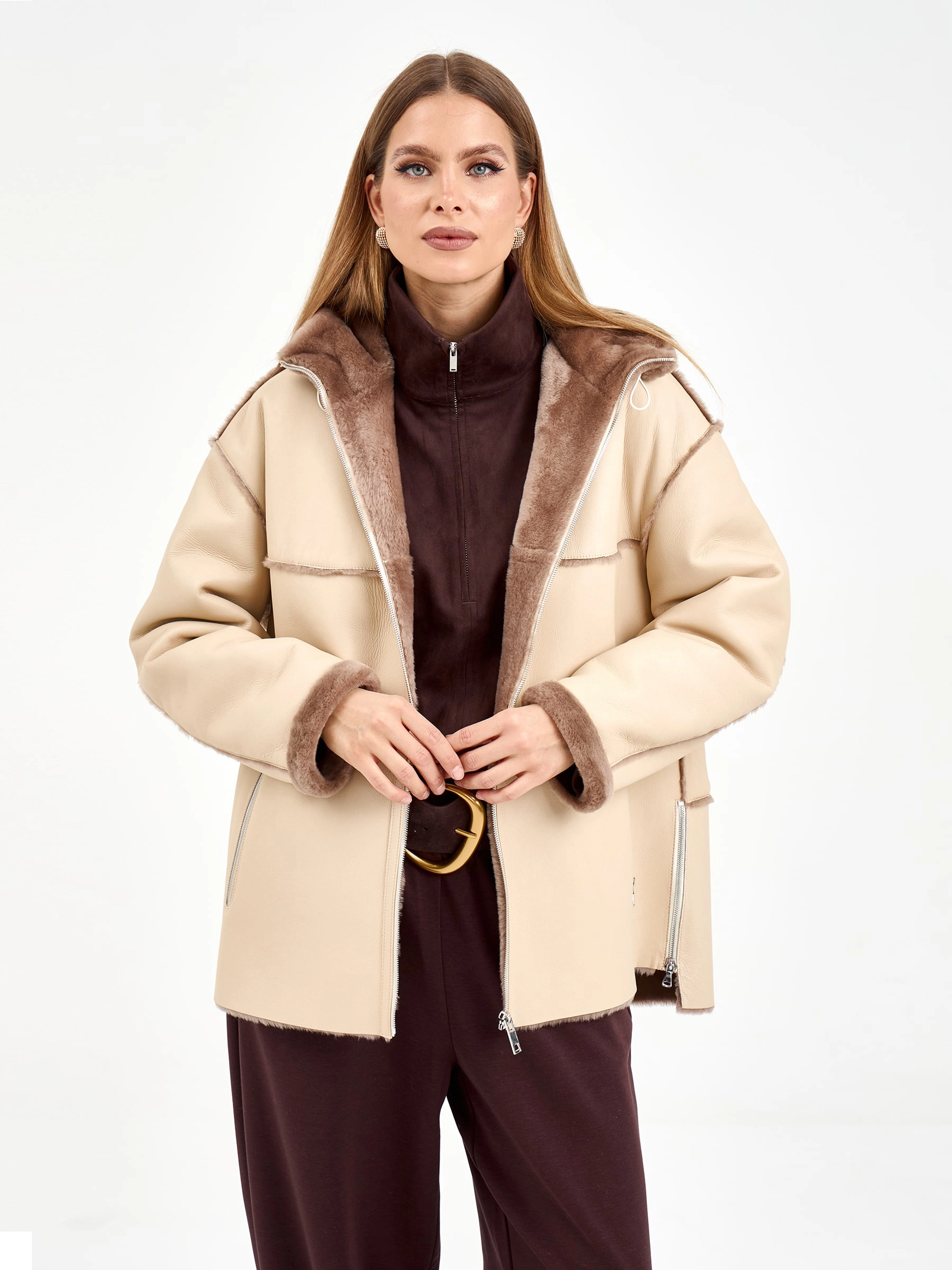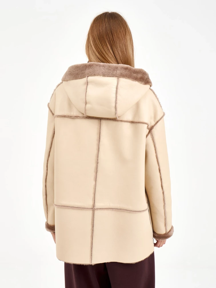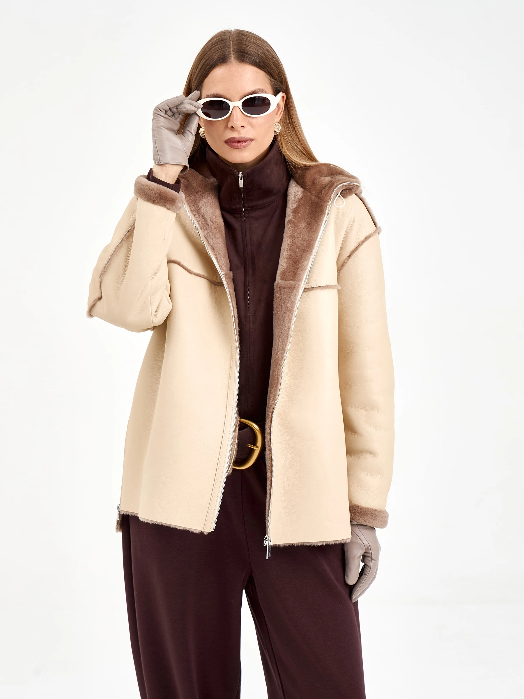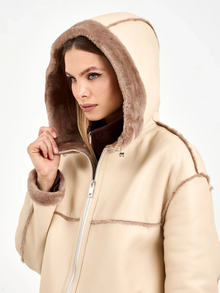Короткая дубленка с капюшоном из премиальной овчины мерино свободного кроя. Модель длиной 75 см с несъемным капюшоном и спущенным рукавом создает элегантный повседневный образ. Застежка-молния, боковые разрезы и практичные врезные карманы. Стилисты рекомендуют носить с объемными свитерами, джинсами-скинни и ботильонами для создания модного лука. Идеальное сочетание уюта, стиля и городской эстетики.