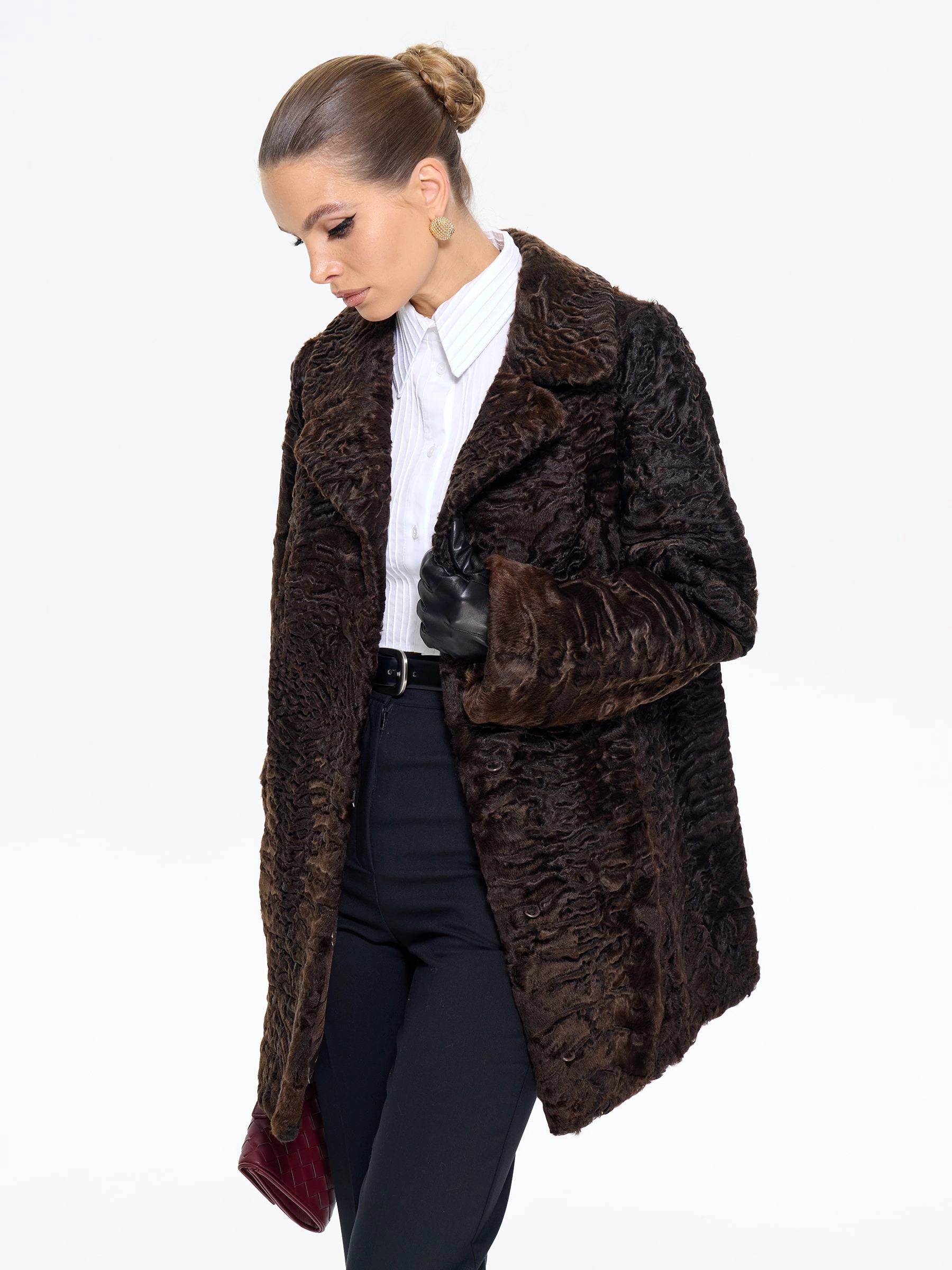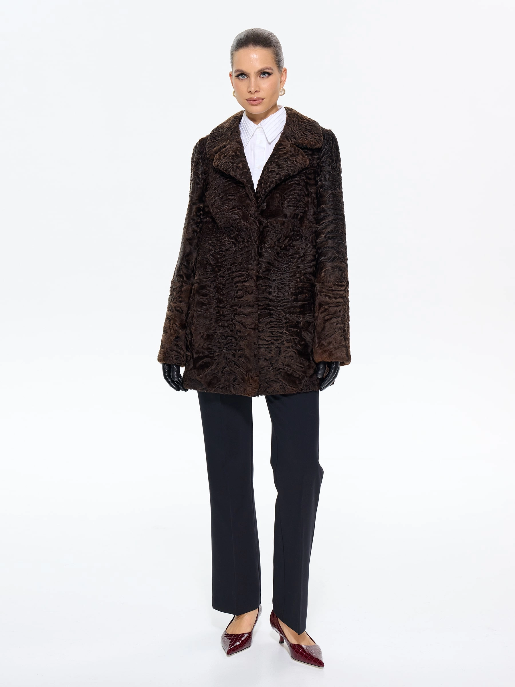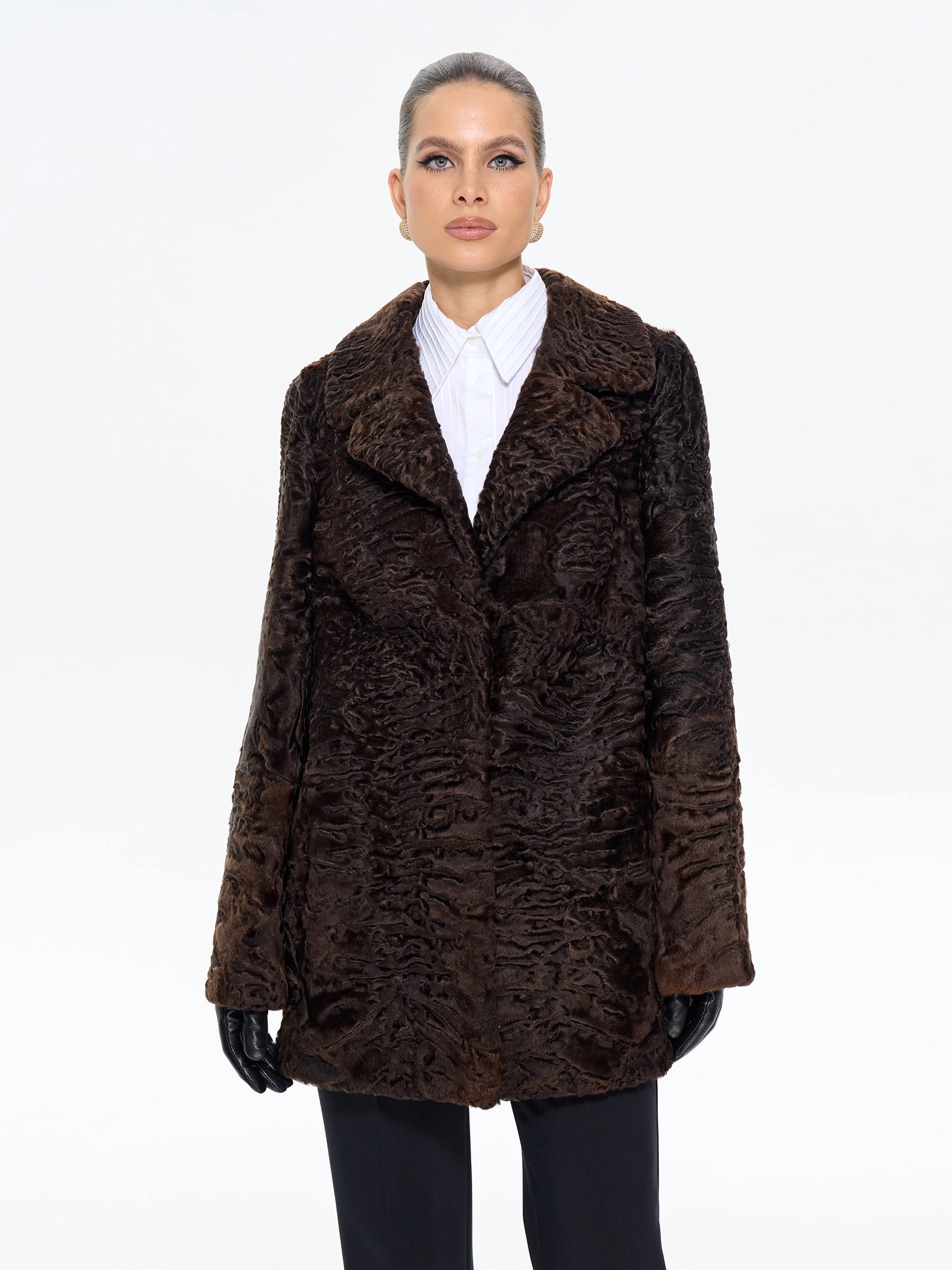 Элегантная шуба из меха каракульчи премиум-класса с английским воротником прямого силуэта. Классическая длина 80 см и втачной рукав создают утонченный образ, который дополнит кожаными перчатками и сапогами-челси для повседневной элегантности или с платьем-футляром для вечернего выхода. Эта модель — воплощение вечного шарма и аристократического стиля в коричневом оттенке.