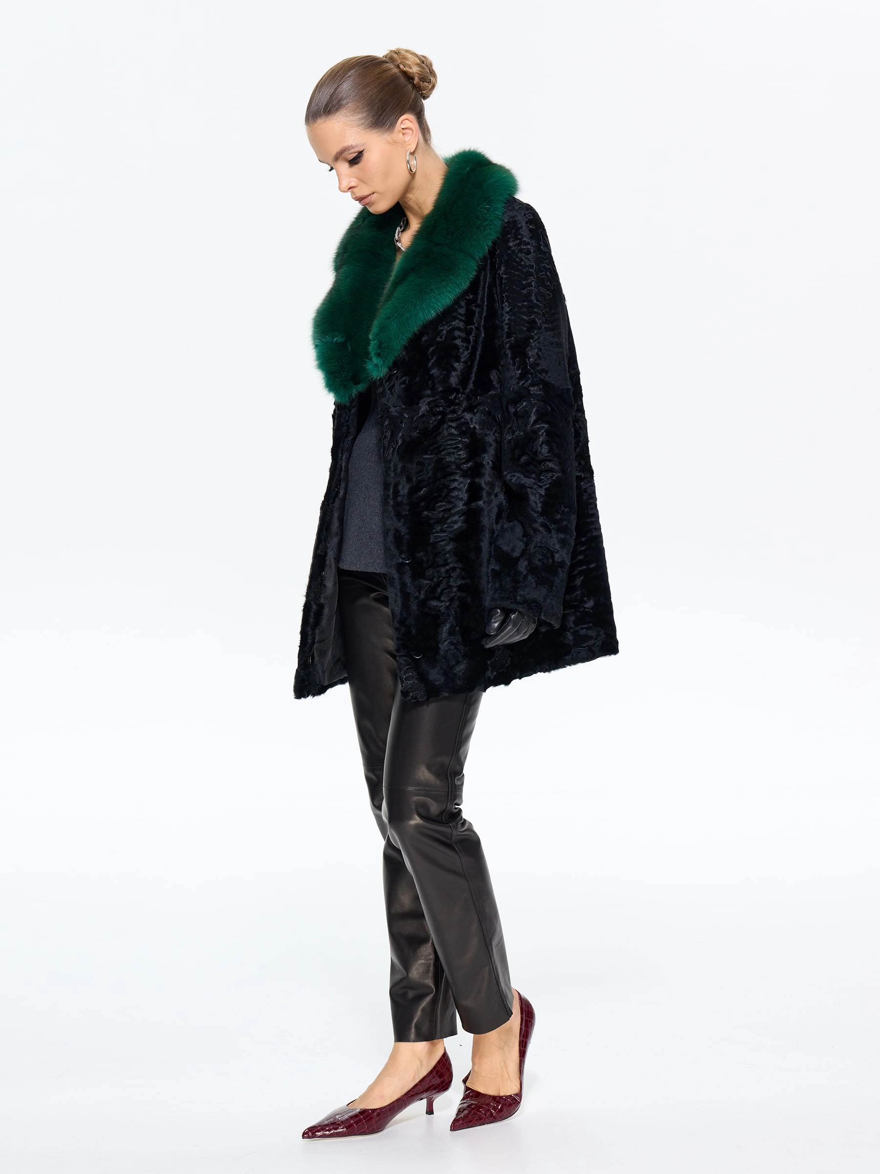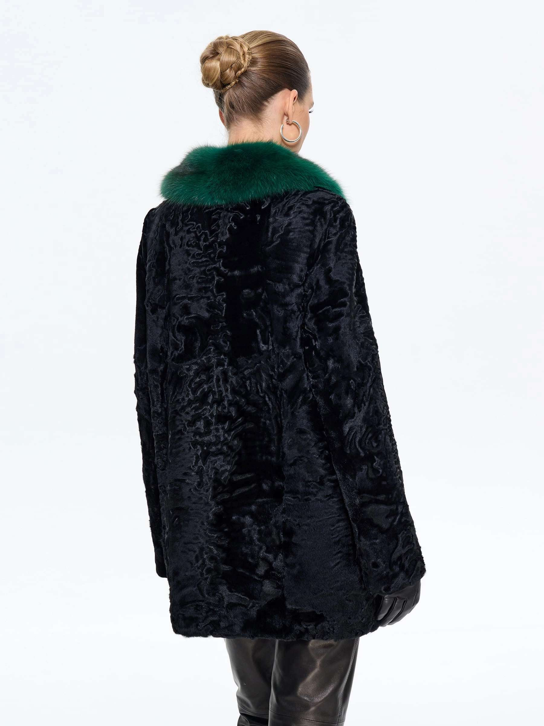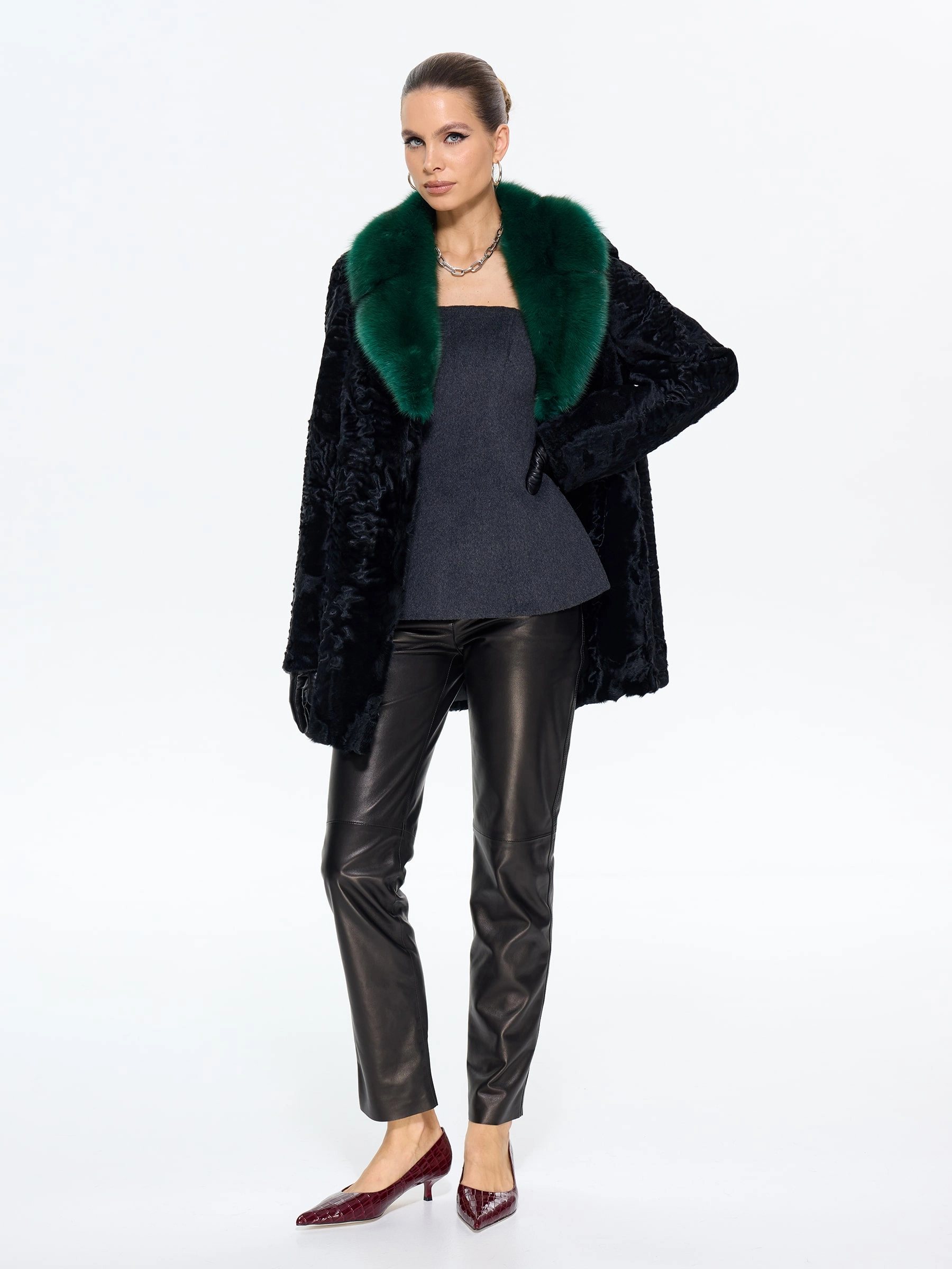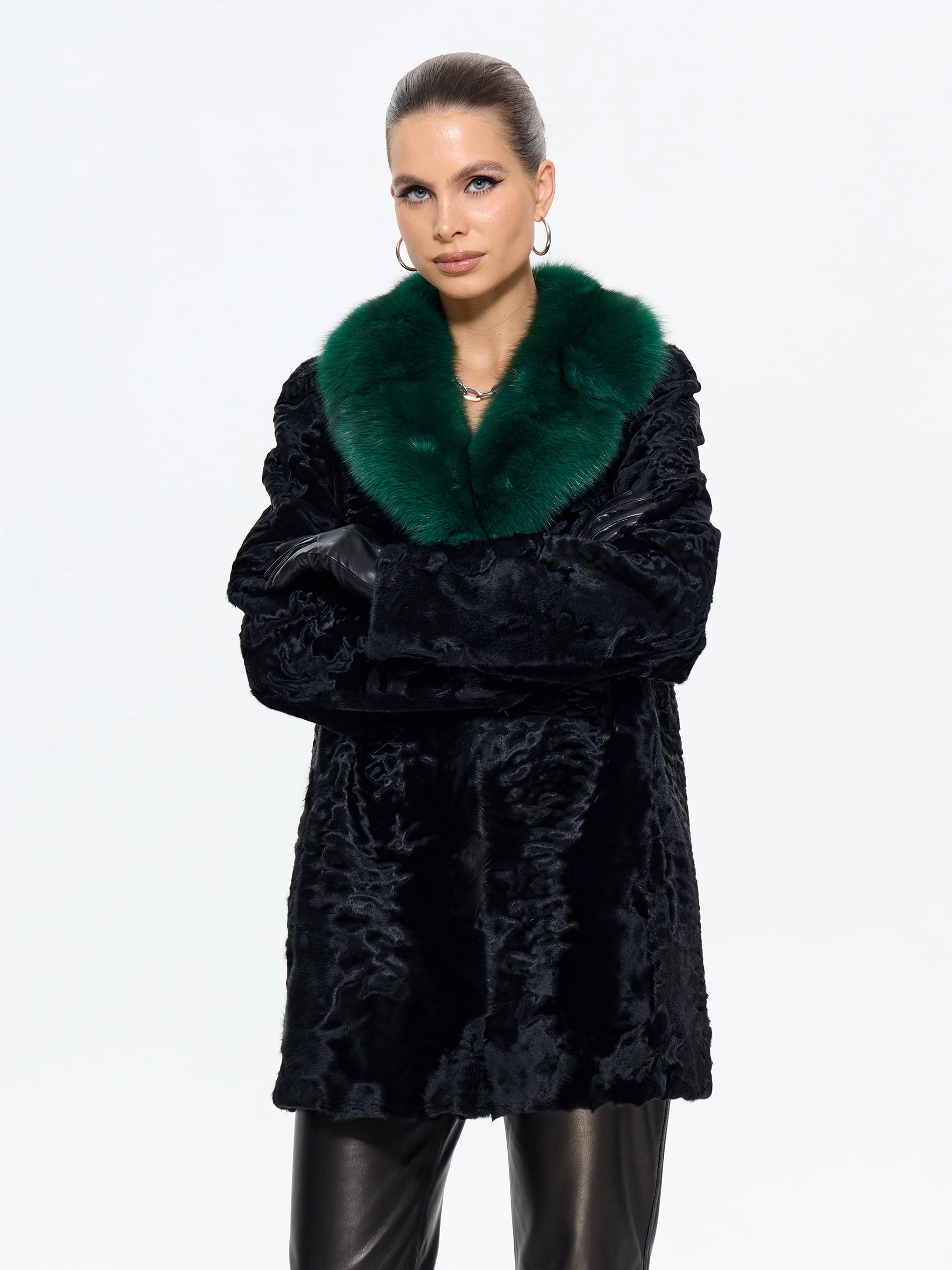 Шуба из меха каракульчи премиум-класса с элегантным английским воротником. Классический прямой силуэт длиной 80 см подчеркивает стройность и воплощает утонченный шарм. Модель с втачными рукавами и застежкой-клипсами легко дополняется аксессуарами. Стилисты рекомендуют носить эту шубу с кожаными перчатками, объемной сумкой и сапогами-челси для повседневного образа или с платьем-футляром и жемчугом для вечернего выхода. Это идеальный вариант для ценительниц вечной классики и безупречного стиля.