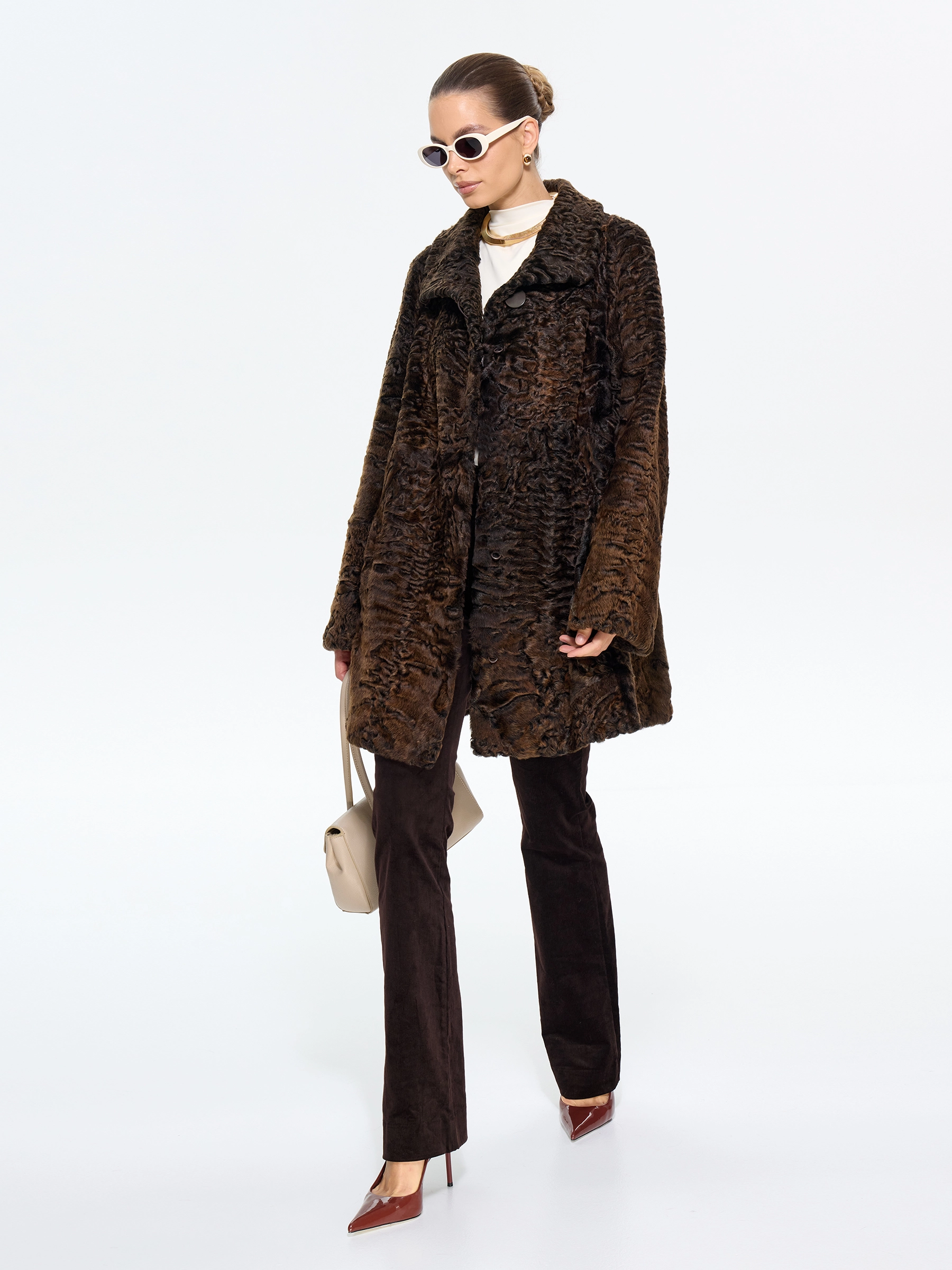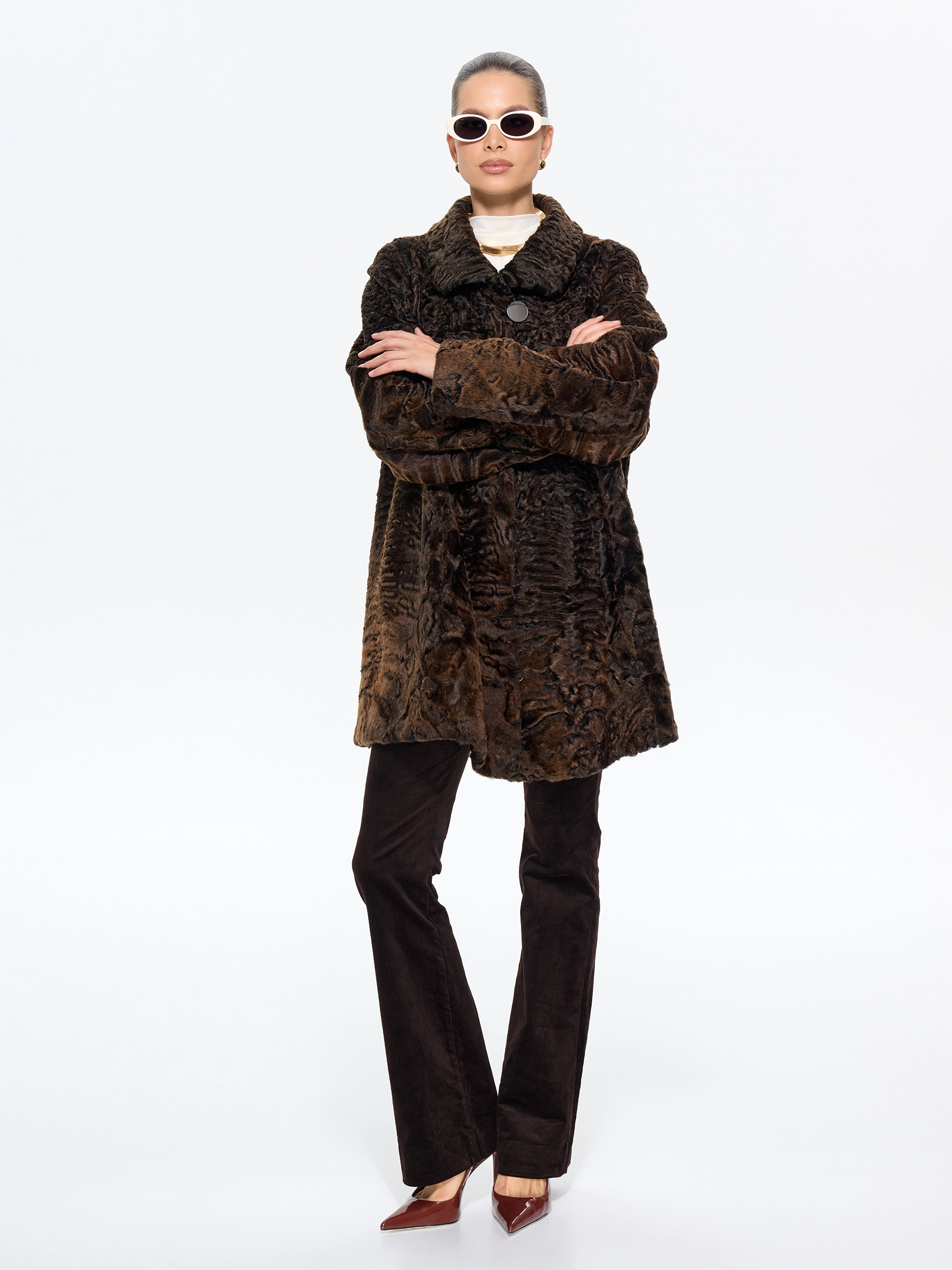 Товар короткая женская шуба из меха каракульчи лиза, коричневая, размер 60, артикул 65570 выполнен из мех каракульчи с застежкой клипсы. Рассчитан на сезон: весна-осень. Длина изделия 80 см, силуэт расклешенный.