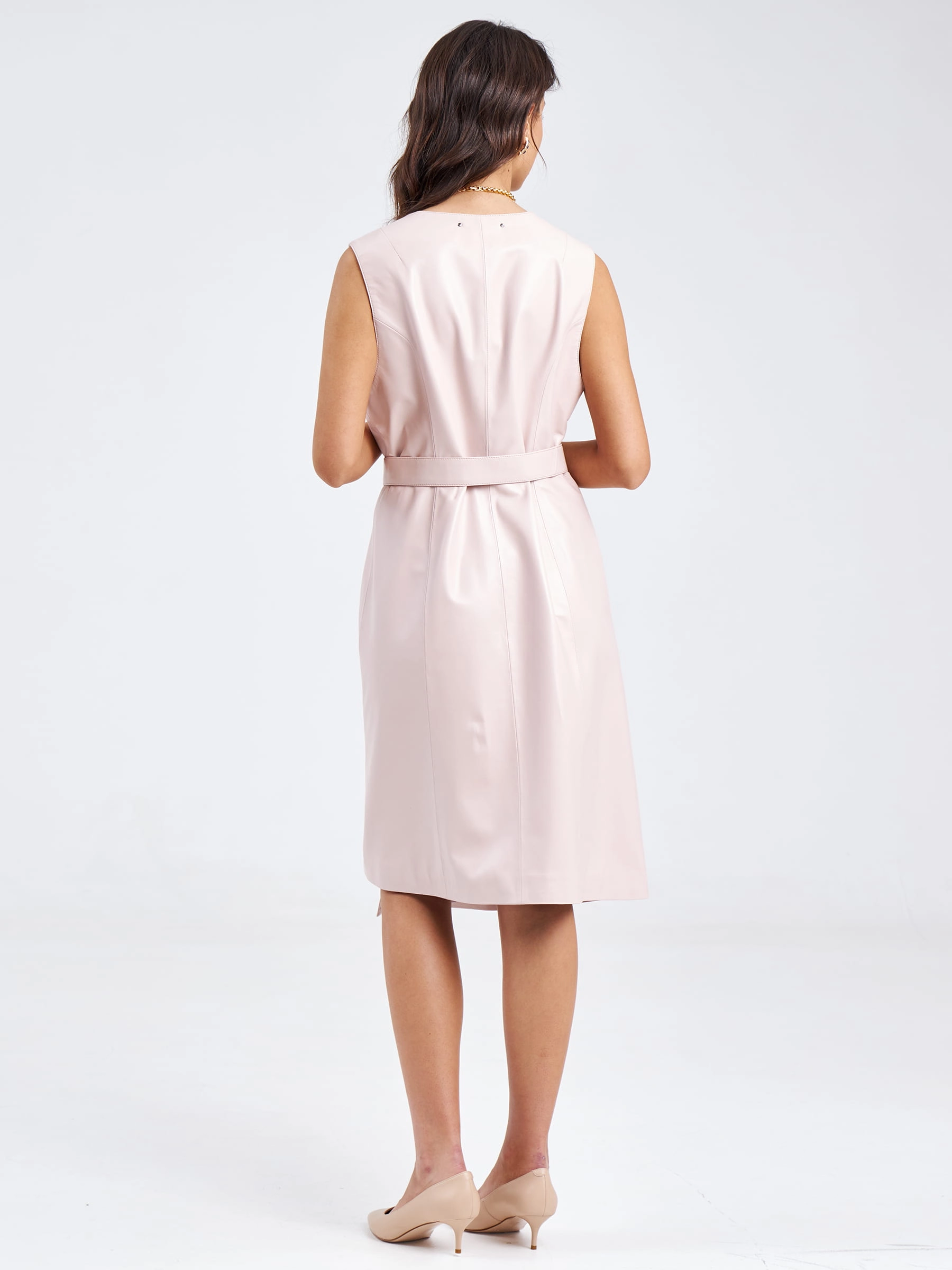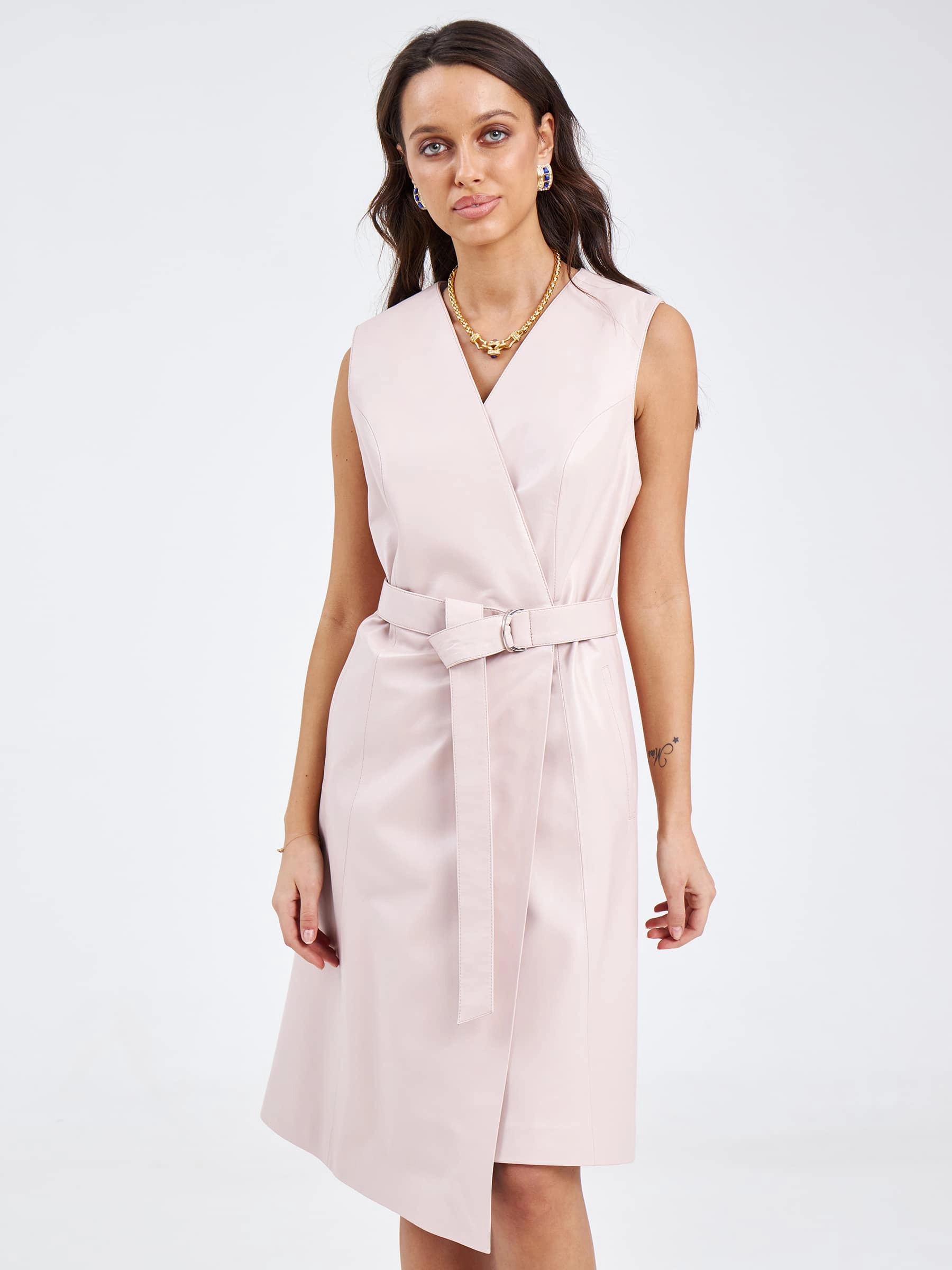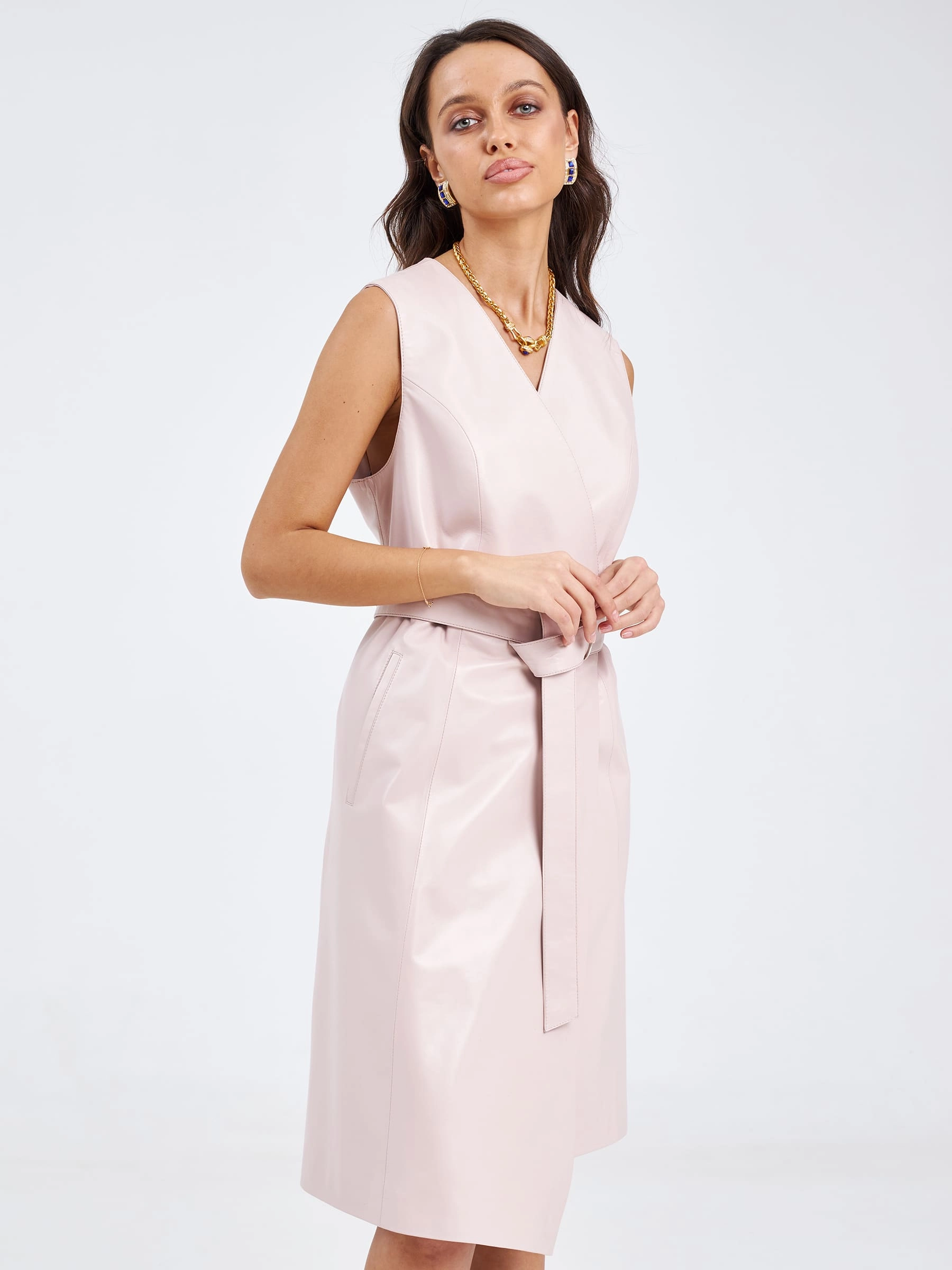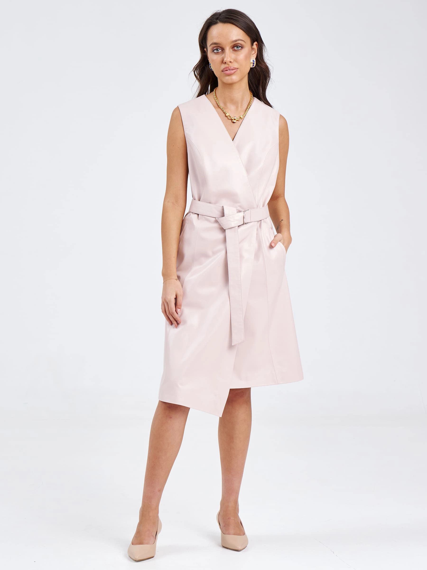 Товар кожаный женский сарафан из натуральной кожи 02, пудровый, размер 46, артикул 85190 выполнен из натуральной кожи с застежкой запах. Рассчитан на сезон: весна-лето. Длина изделия 100 см, силуэт приталенный .