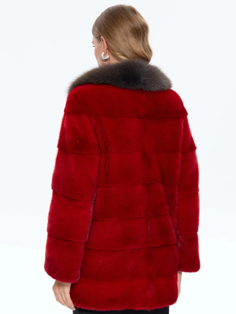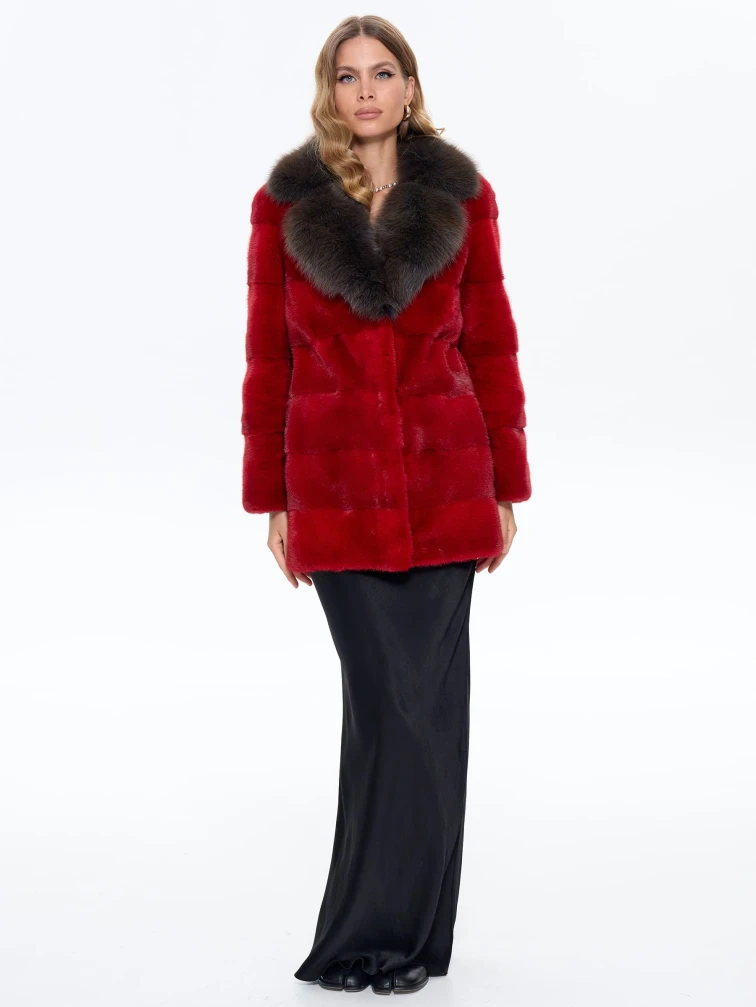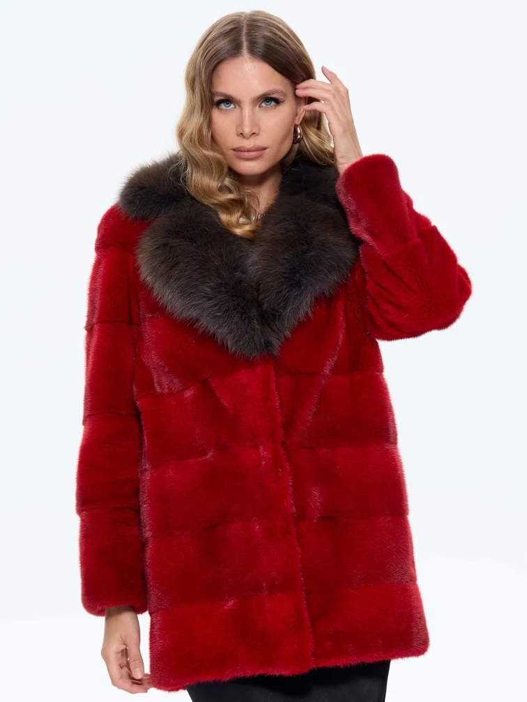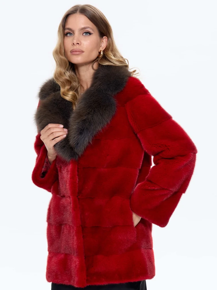 Товар красная норковая шуба с куницей 2б, размер 44, артикул 65180 выполнен из мех норки с застежкой клипсы. Рассчитан на сезон: зима. Длина изделия 75 см, силуэт прямой.