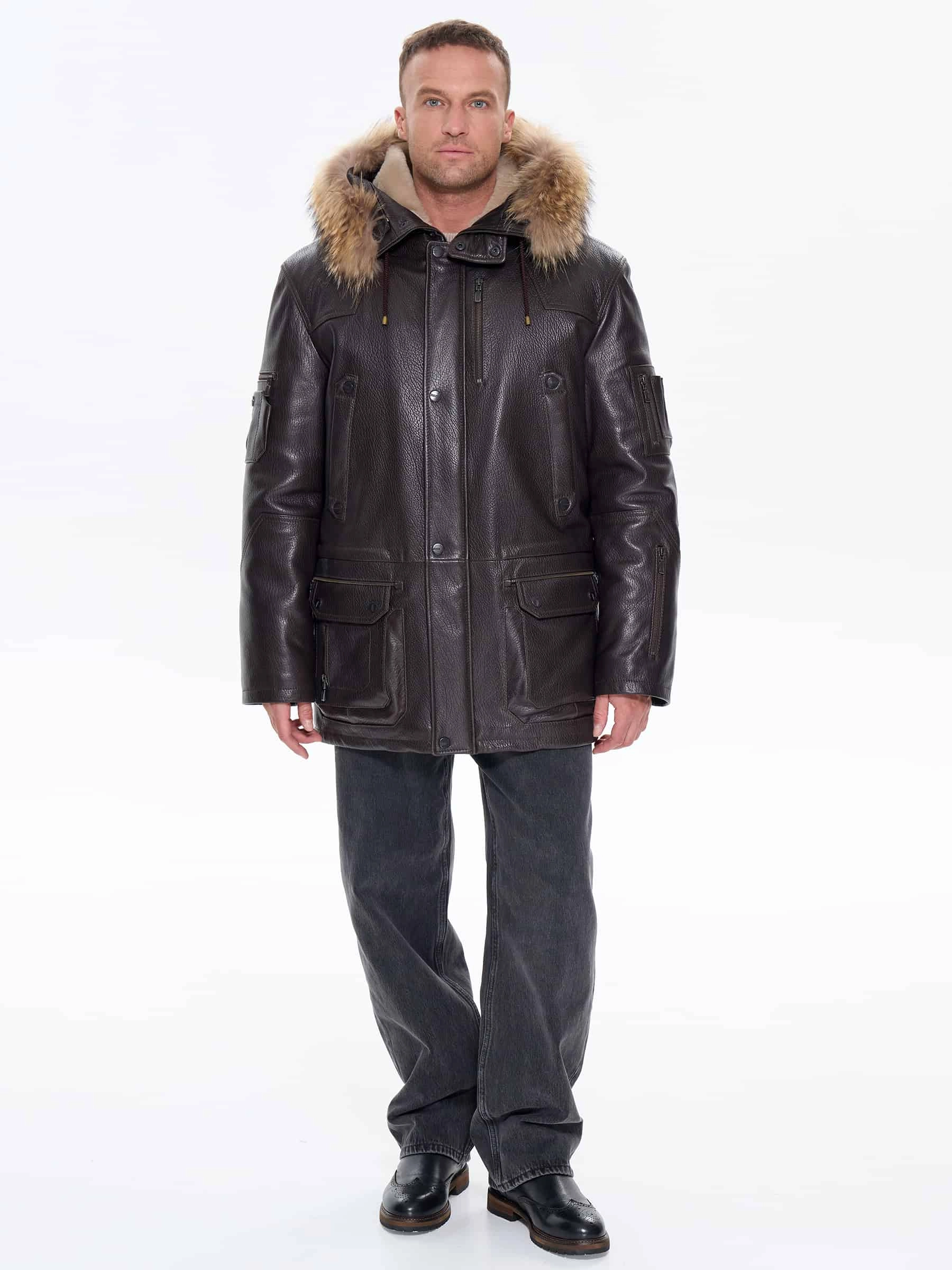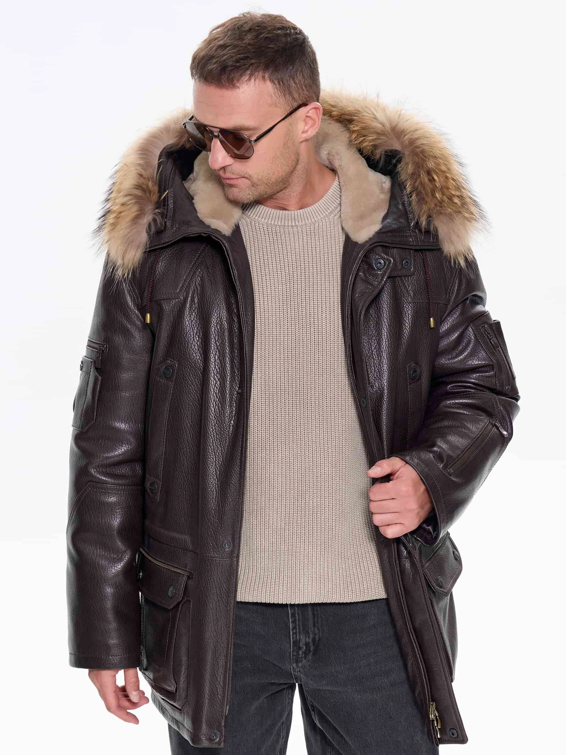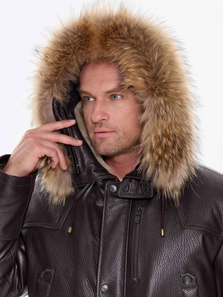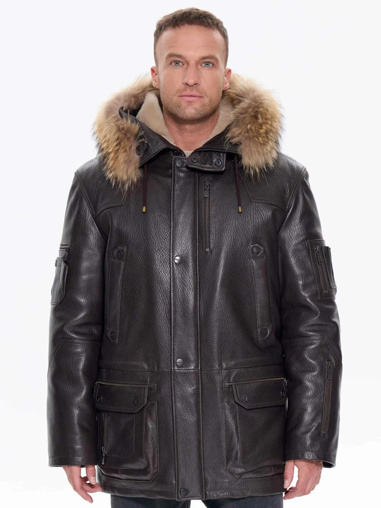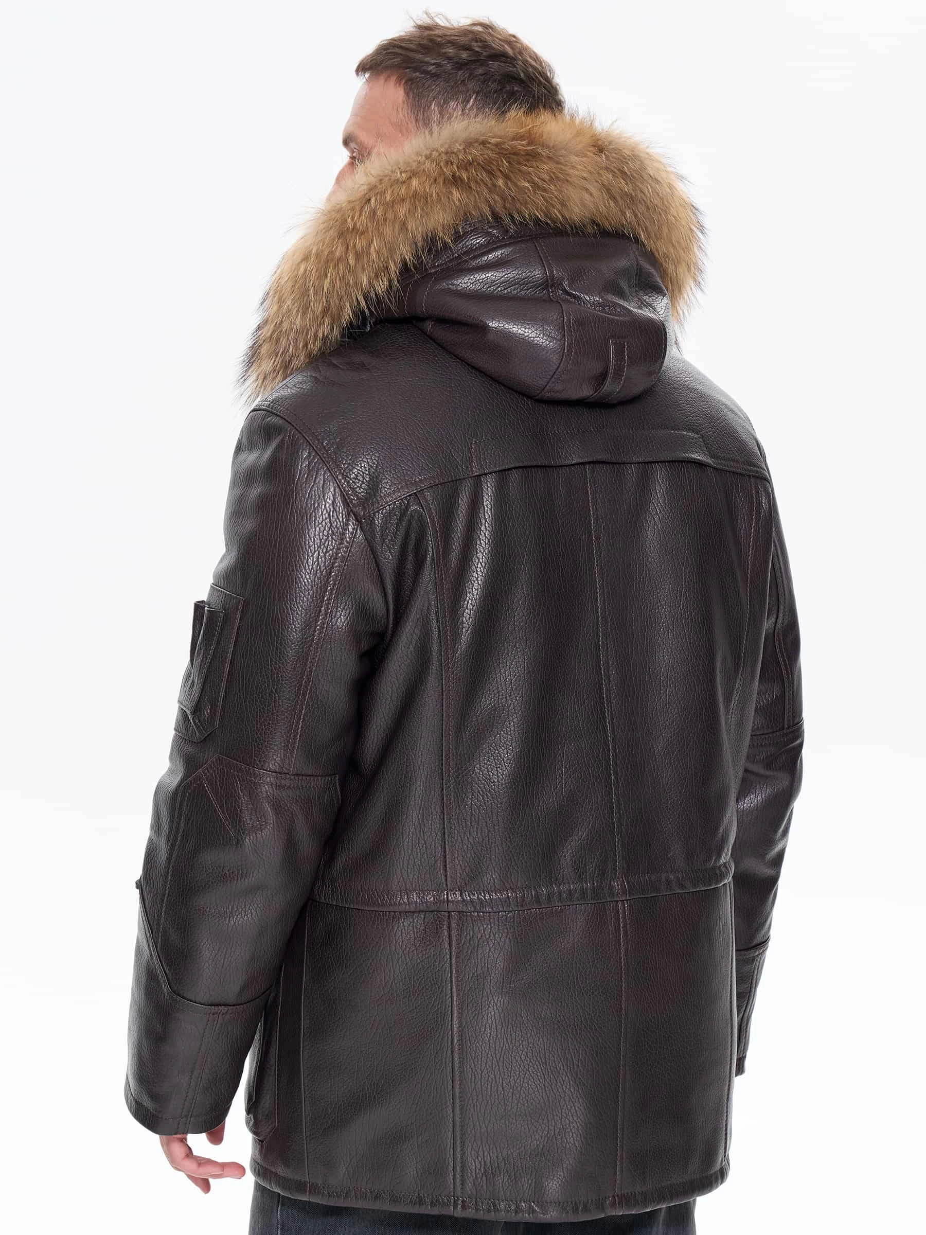 Утепленная мужская кожаная куртка аляска с мехом енота Алекс, коричневая, размер 52, артикул 40300