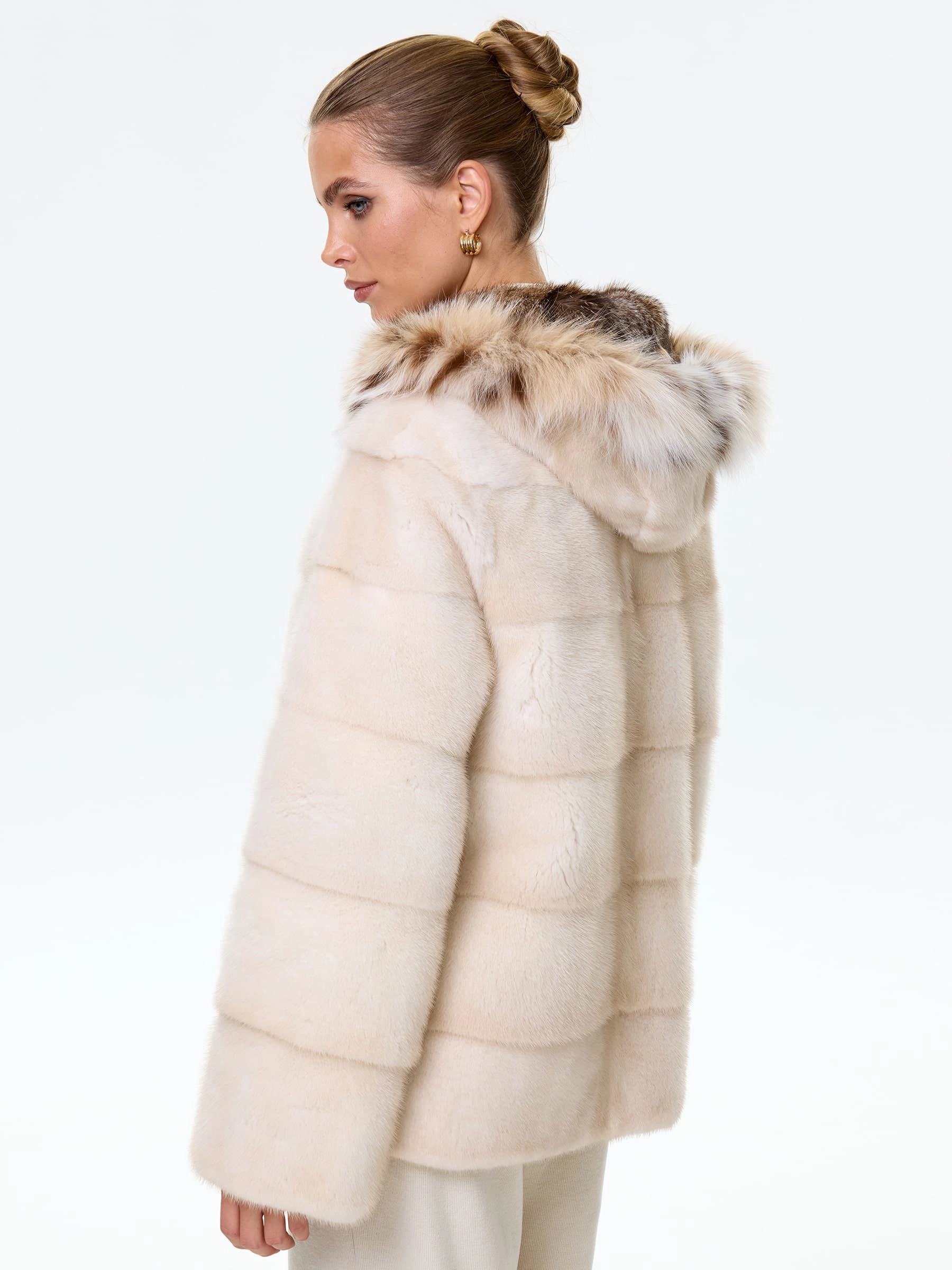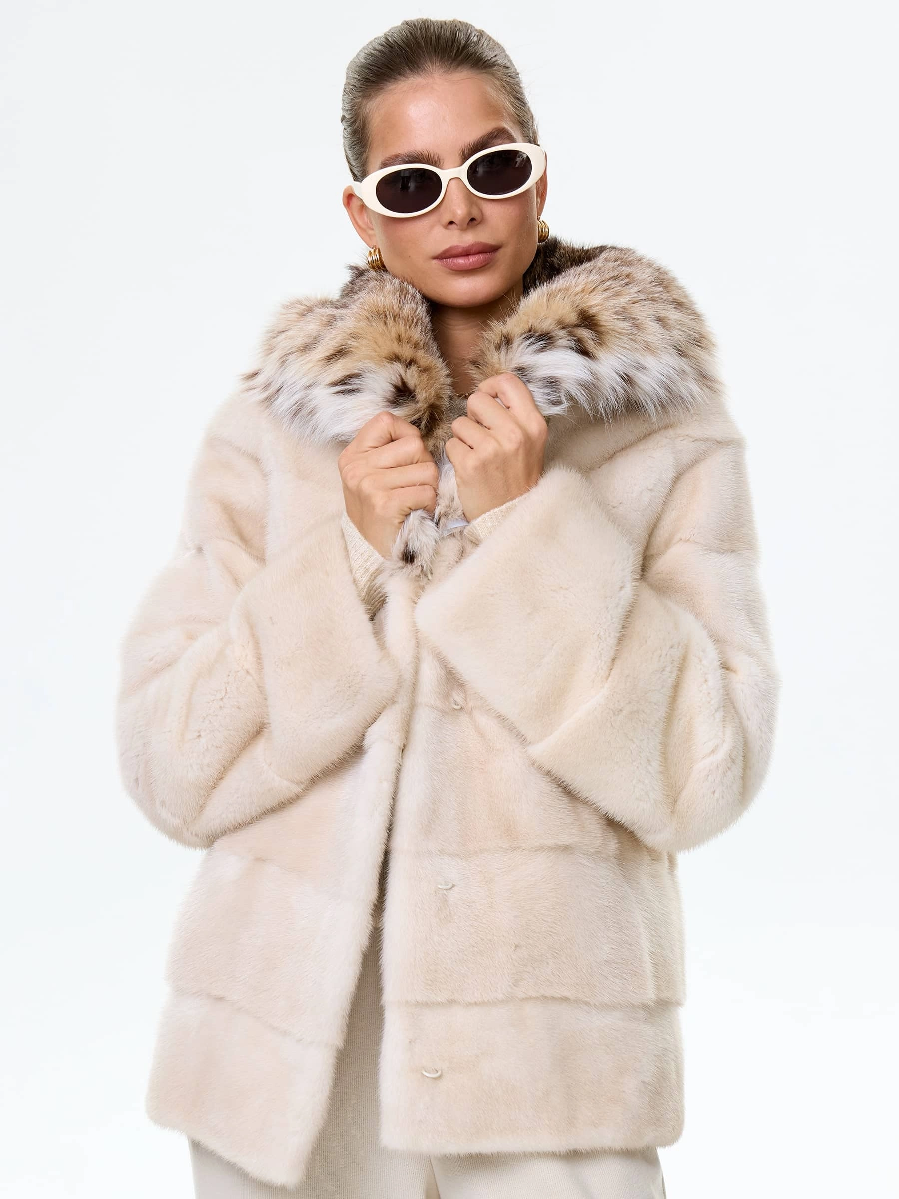 Норковая шуба женская с капюшоном и отделкой рысевидной кошкой Юля(к), жемчужная, размер 48, артикул 34130