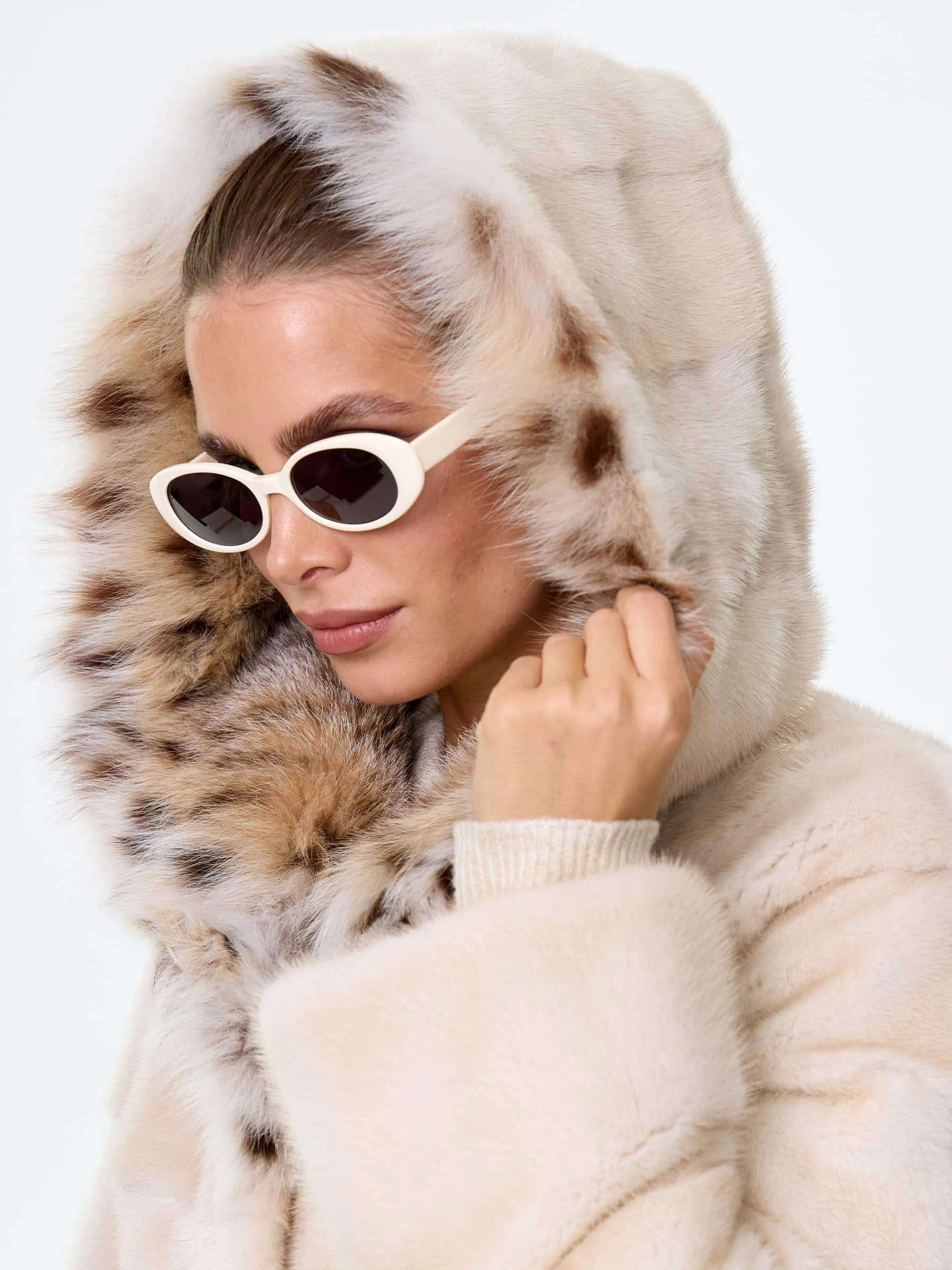 Товар норковая шуба женская с капюшоном и отделкой рысевидной кошкой юля(к), жемчужная, размер 48, артикул 34130 выполнен из норка с застежкой клипсы. Рассчитан на сезон: зима. Длина изделия 65 см, силуэт прямой.