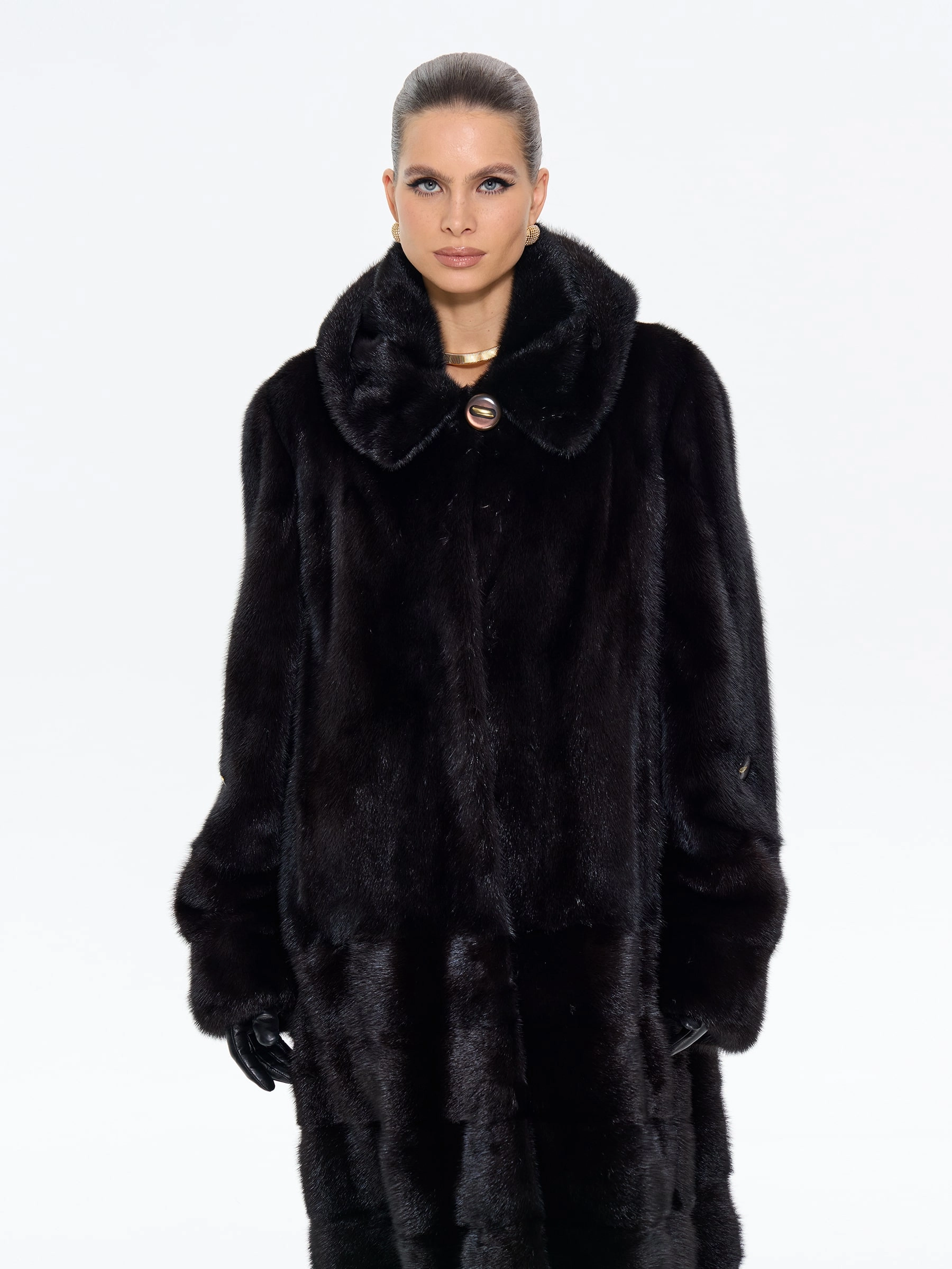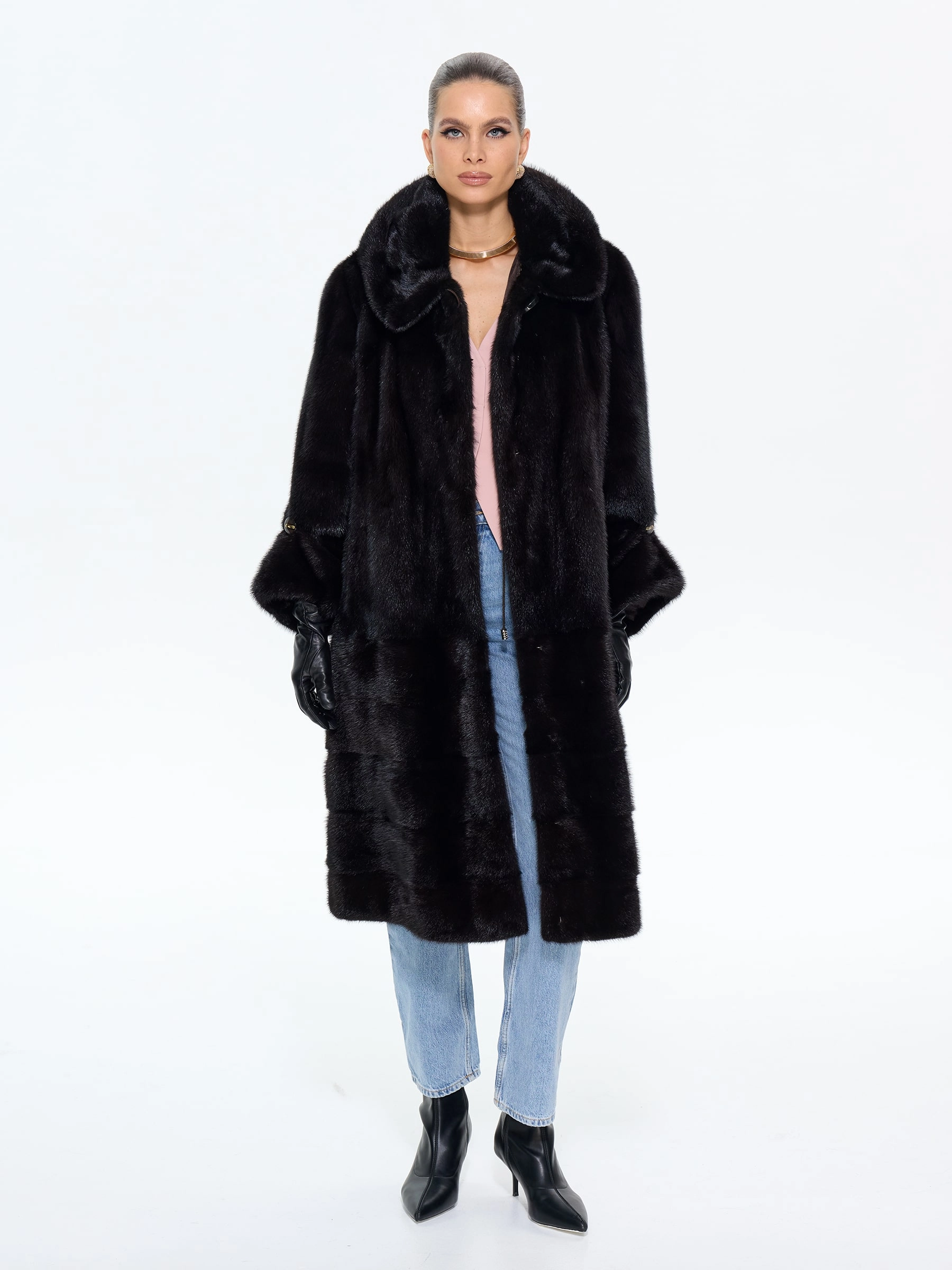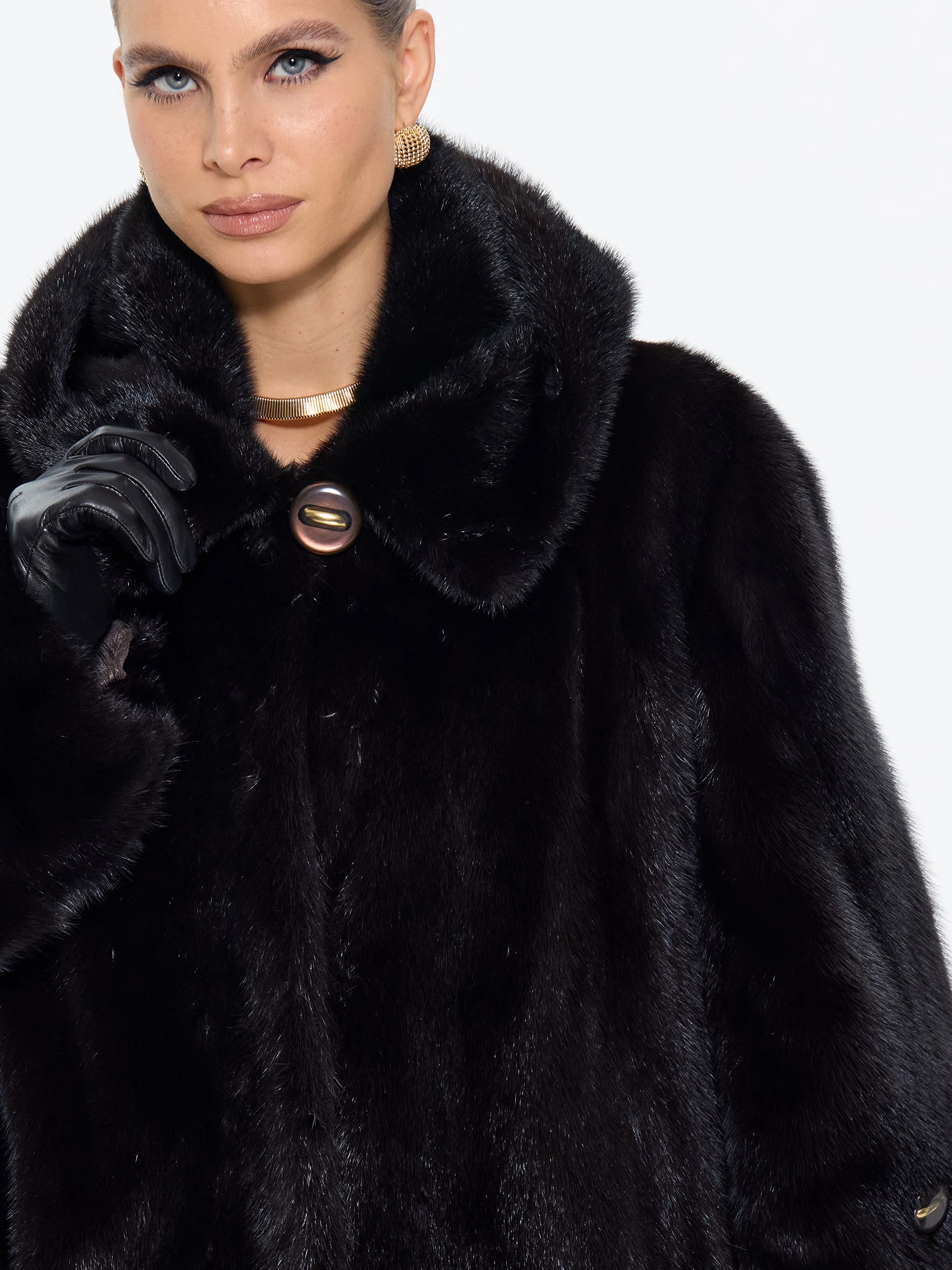Элегантная шуба из норки в цвете махагон с искусной комбинацией меховой раскладки. Низ изделия выложен поперечно для создания объемного эффекта, в то время как верх выполнен в классической продольной технике. Силуэт "трапеция" с глубоким капюшоном создает современный образ утонченной роскоши. Регулируемая длина рукава обеспечивает идеальную посадку. Изысканное сочетание разных техник раскладки меха подчеркивает статусность изделия. Шуба дарит ощущение защищенности и безупречного стиля, сохраняя элегантность в любую погоду.