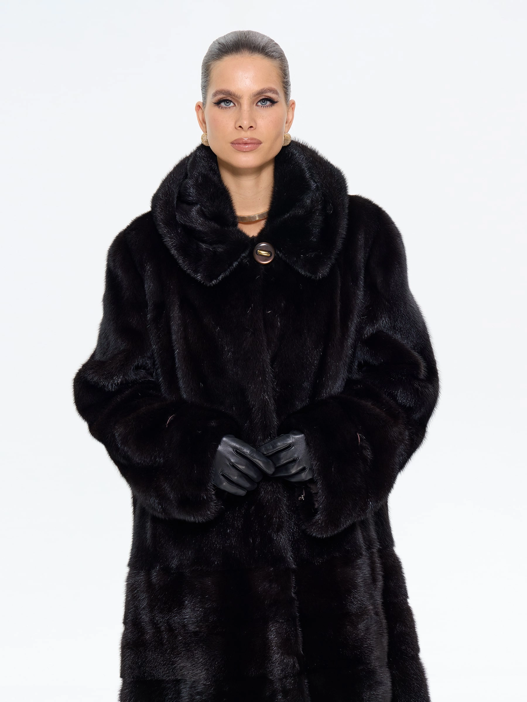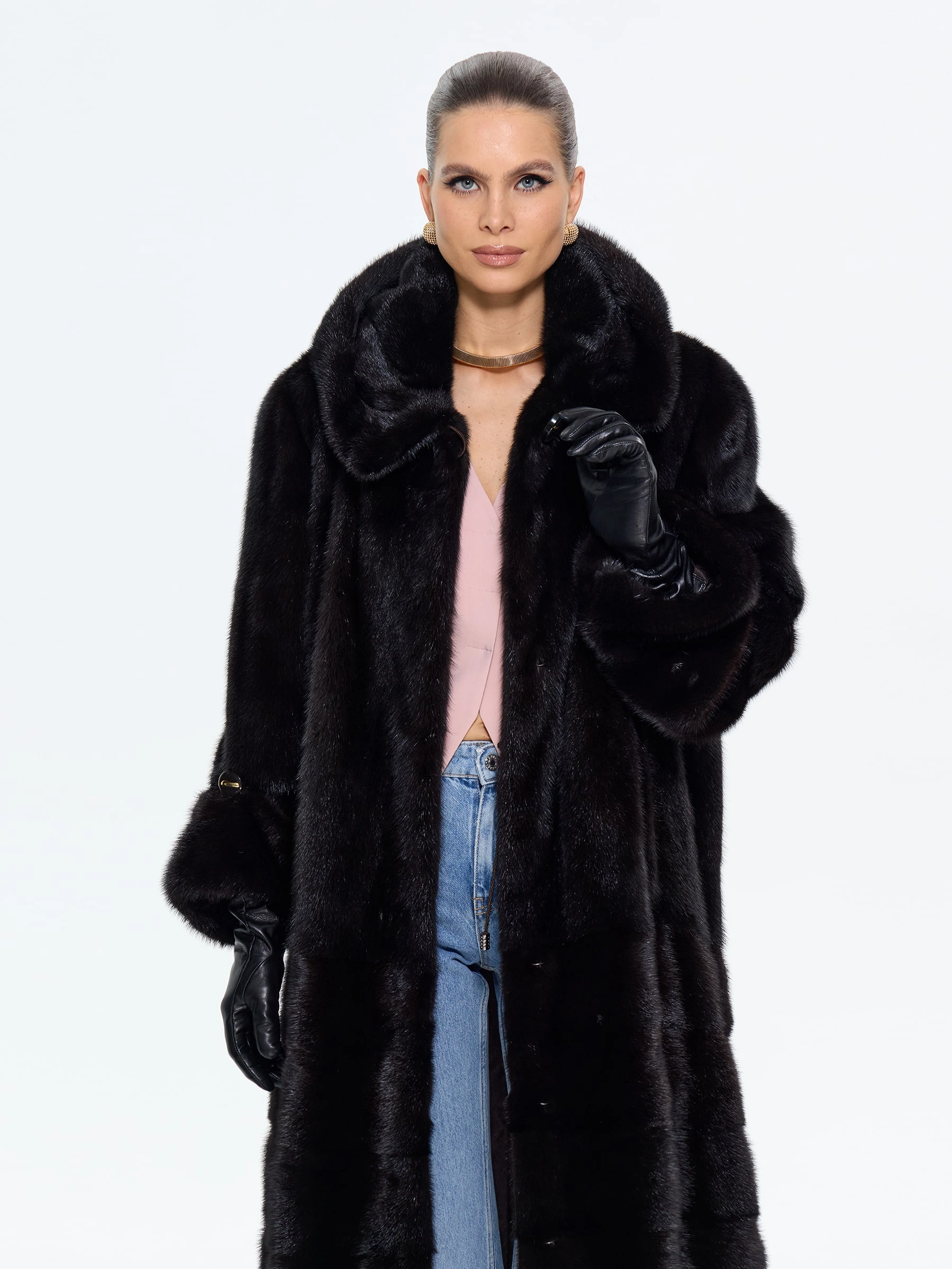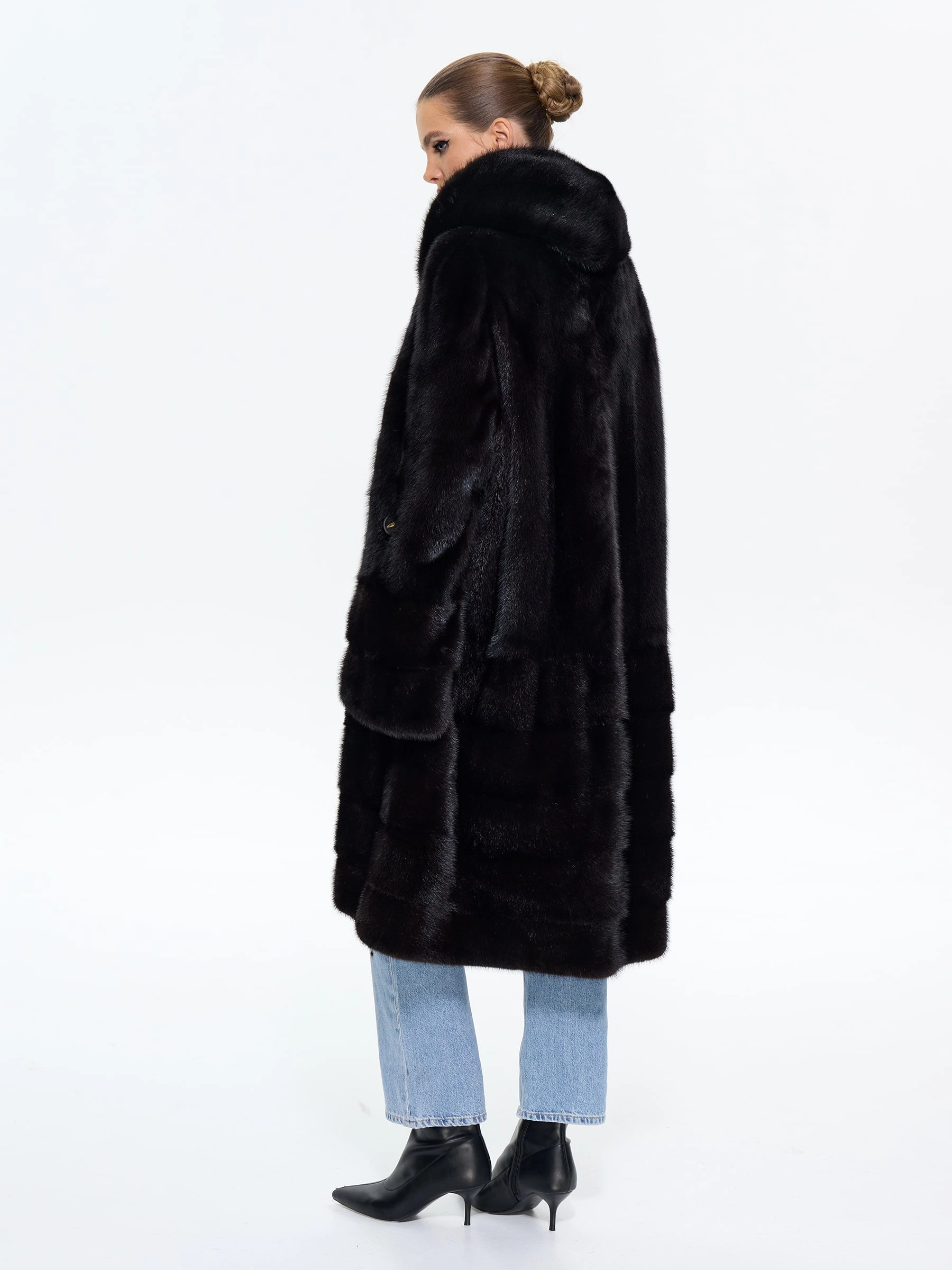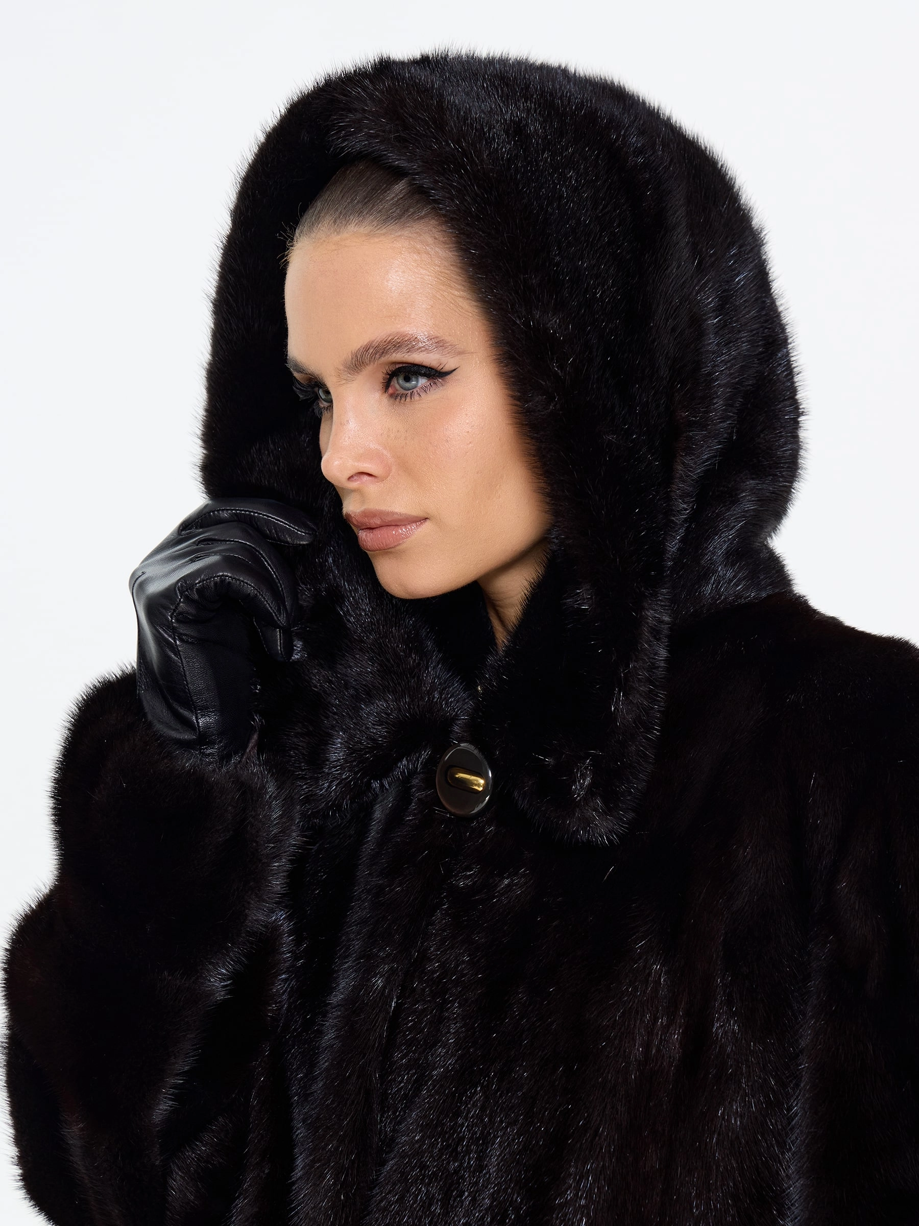 Шуба женская из меха норки с капюшоном М-102-1221, коричневая, размер 60, артикул 65430