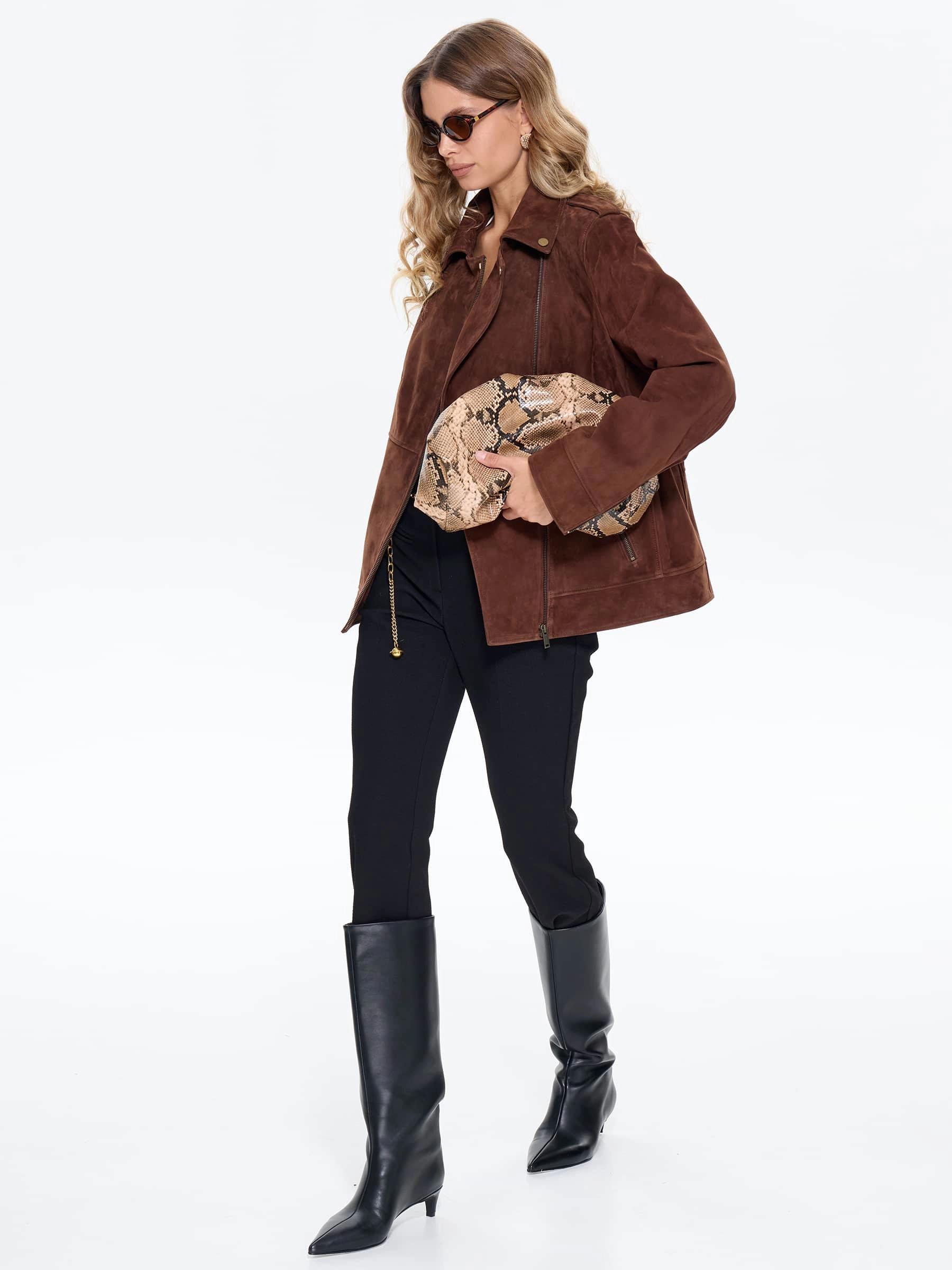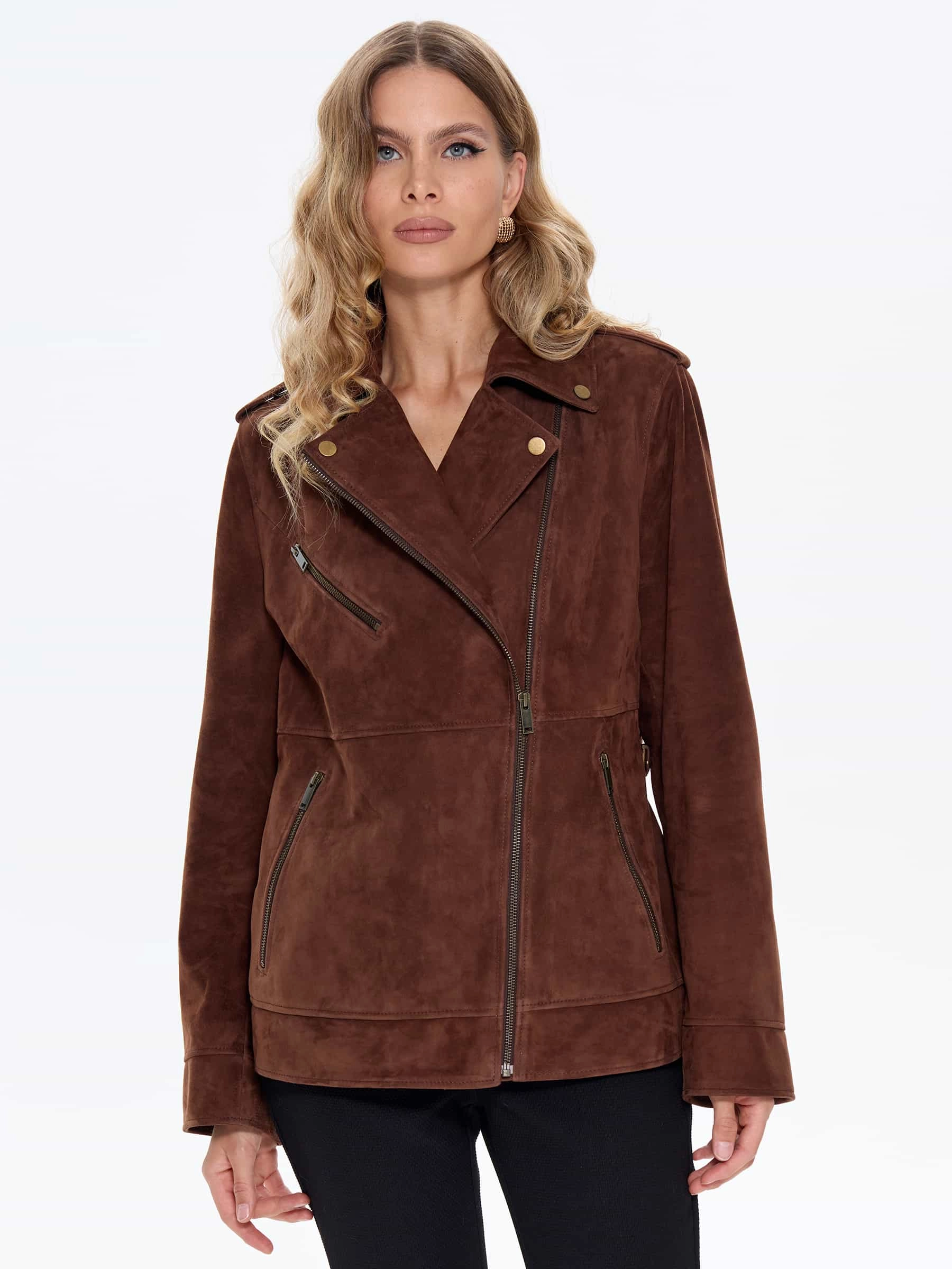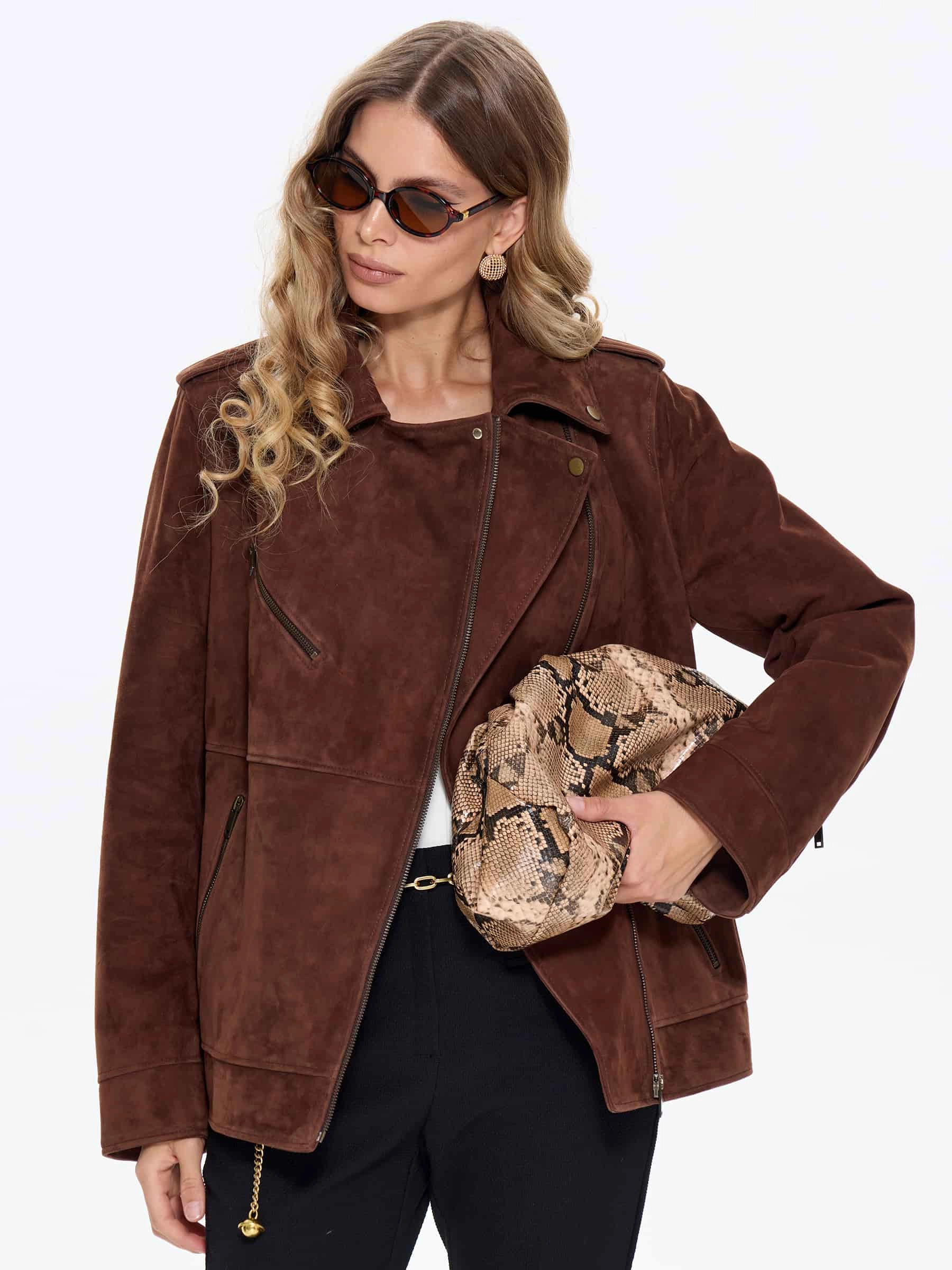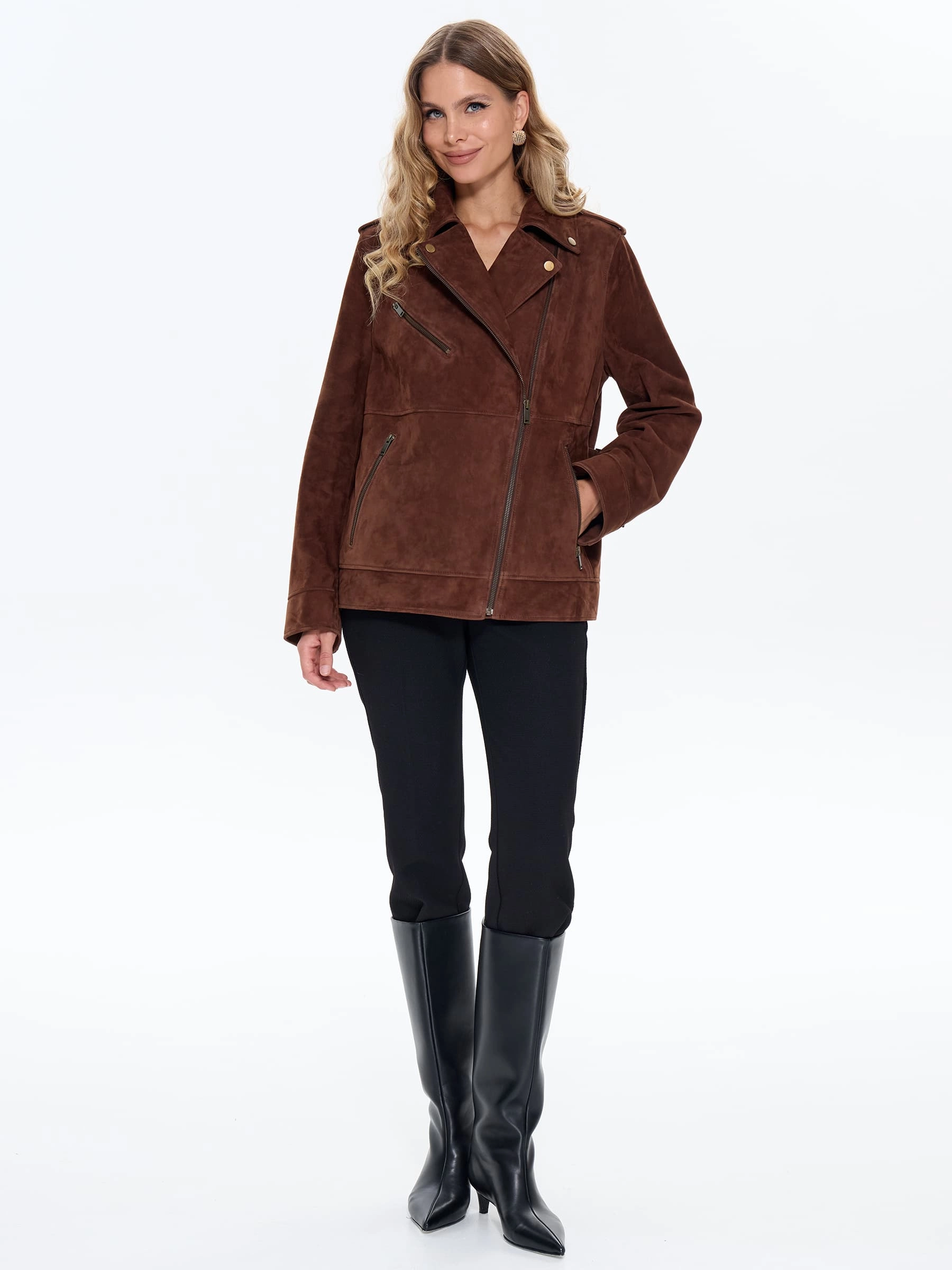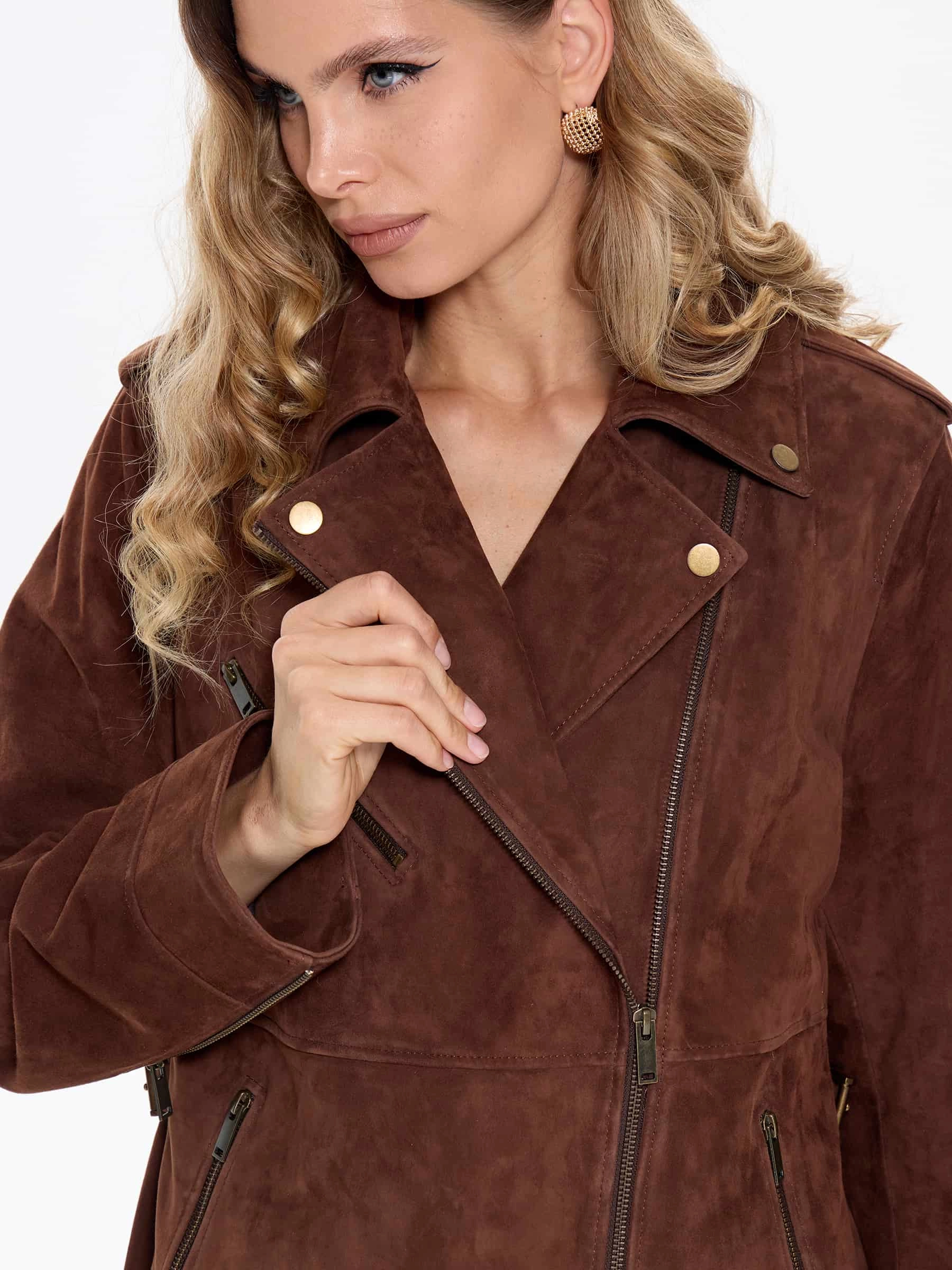 Удлиненную косуху выполнили из замши премиум класса. Прямой крой с втачными рукавами дополнили погонами. Прорезные карманы и манжеты застегиваются крупными молниями. Великолепная посадка по фигуре и свободе движений.