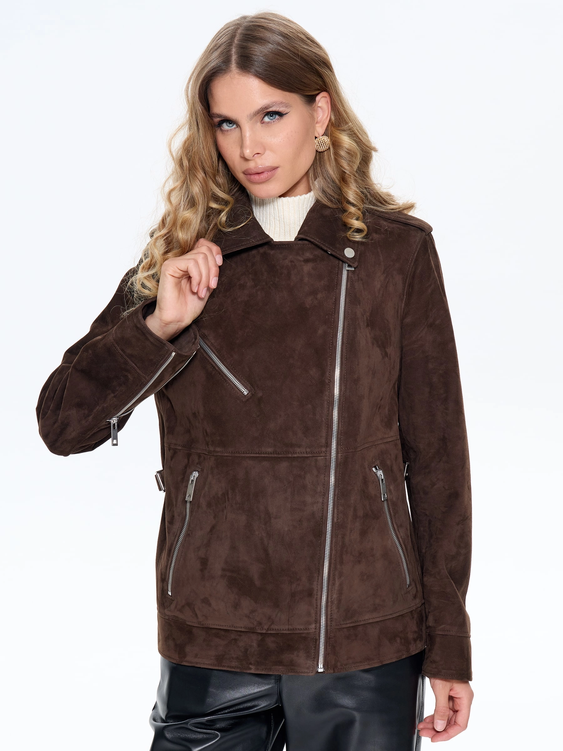 Замшевая женская куртка косуха премиум класса 3079з, коричневая, размер 42, артикул 24700