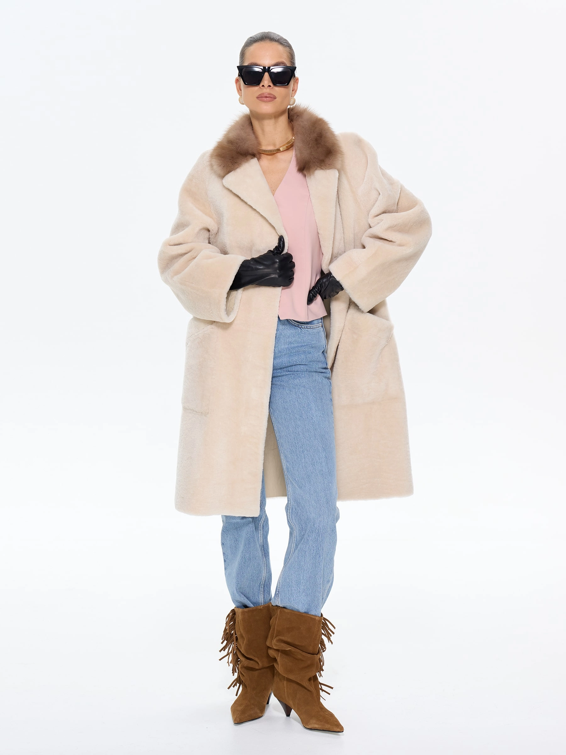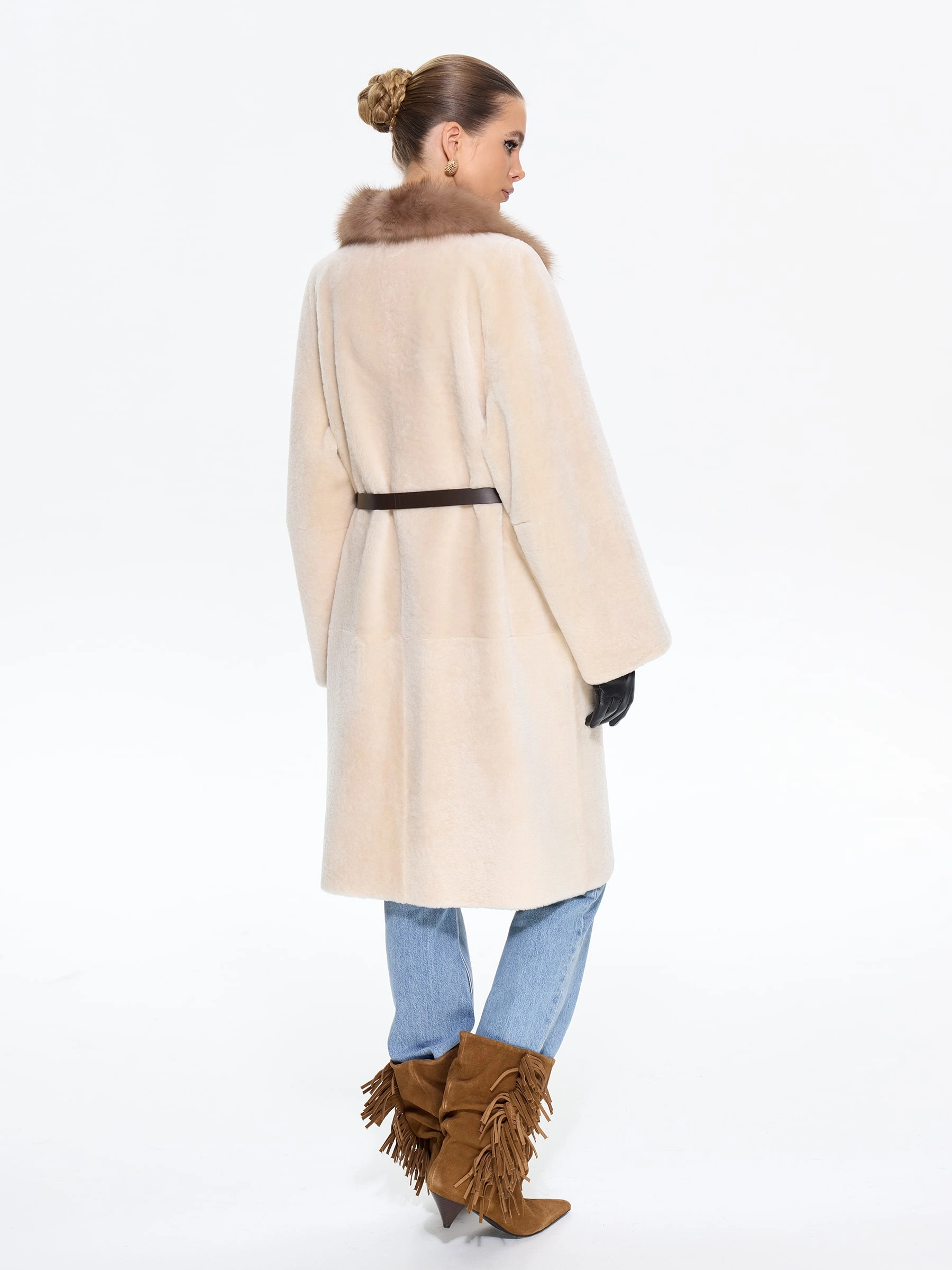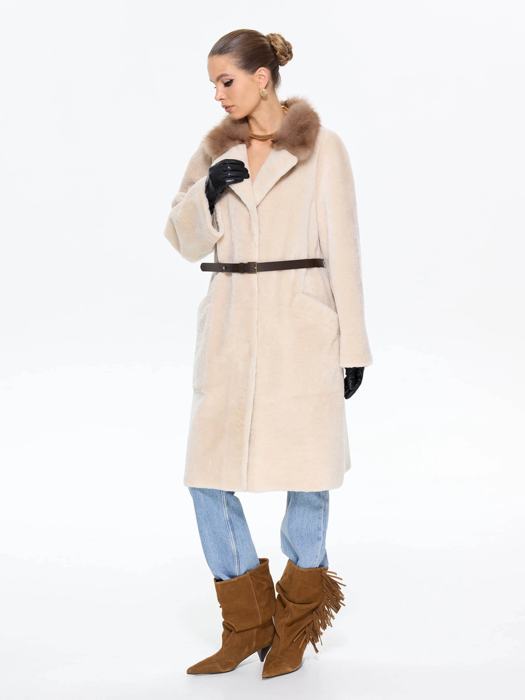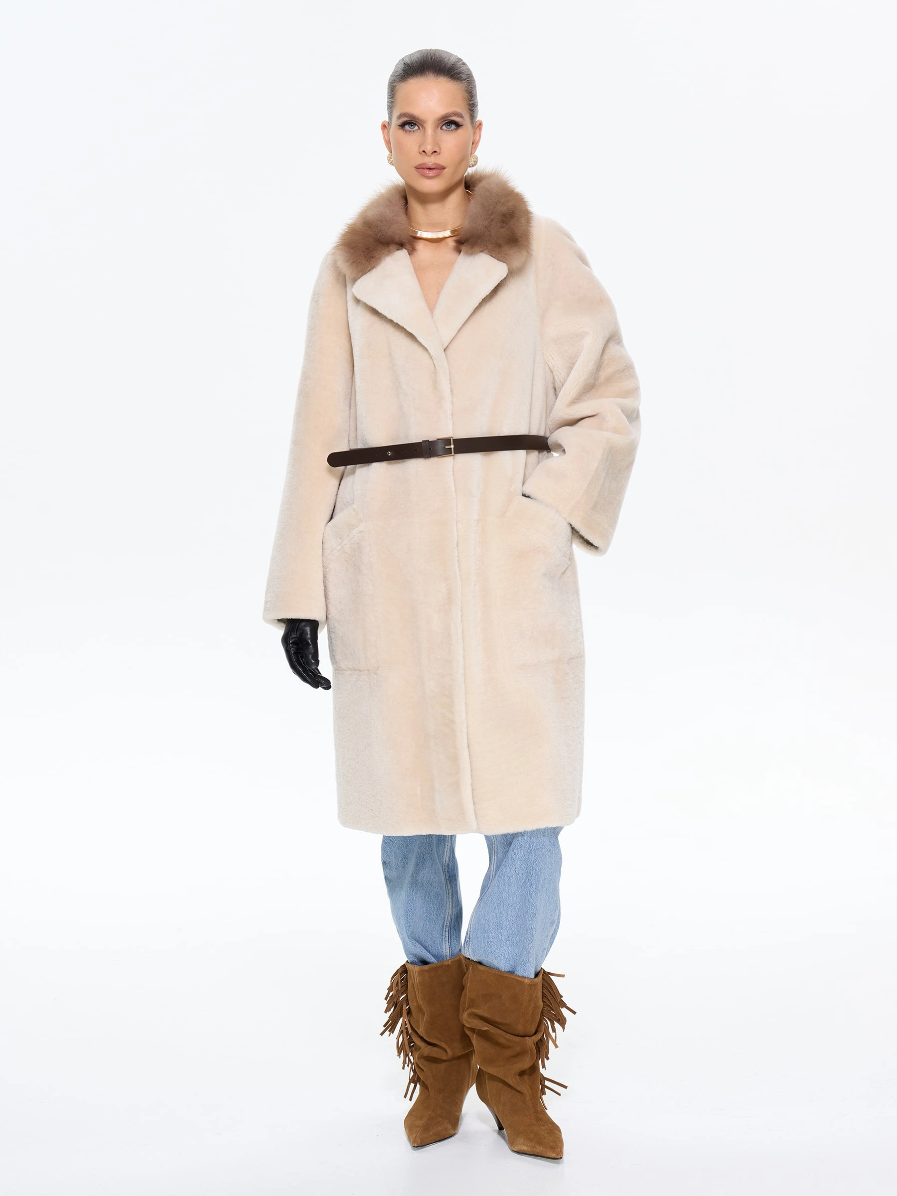 Элегантная дублёнка свободного кроя с английским воротником из натурального меха астрагана премиум-класса в нежном бежевом оттенке. Модель длиной 100 см со спущенным рукавом и роскошным воротником, отделанным куницей, создает утонченный силуэт с элементами классики — накладные карманы и дополнительный ремень позволяют варьировать образ. Стилисты рекомендуют носить эту дублёнку с кожаными сапогами и брюками-бананами для повседневного стиля или с юбкой-миди и замшевыми ботильонами для элегантного выхода. Изысканное сочетание практичности и аристократического шарма, где каждая деталь подчеркивает безупречный вкус своей обладательницы.