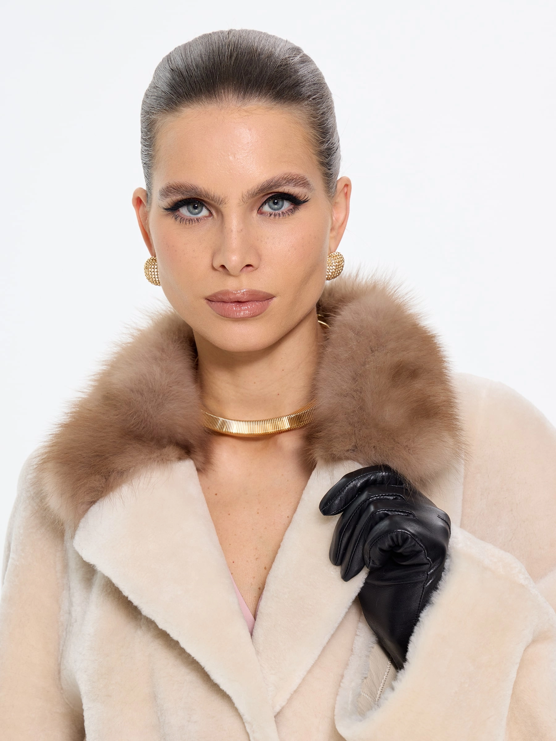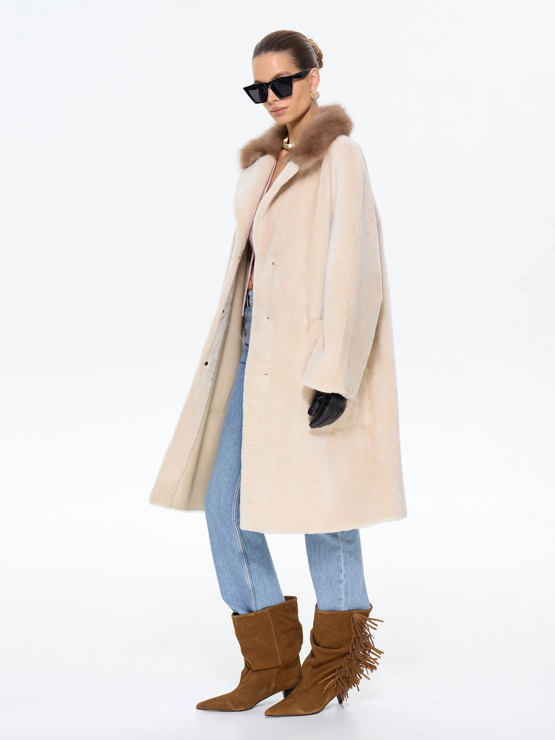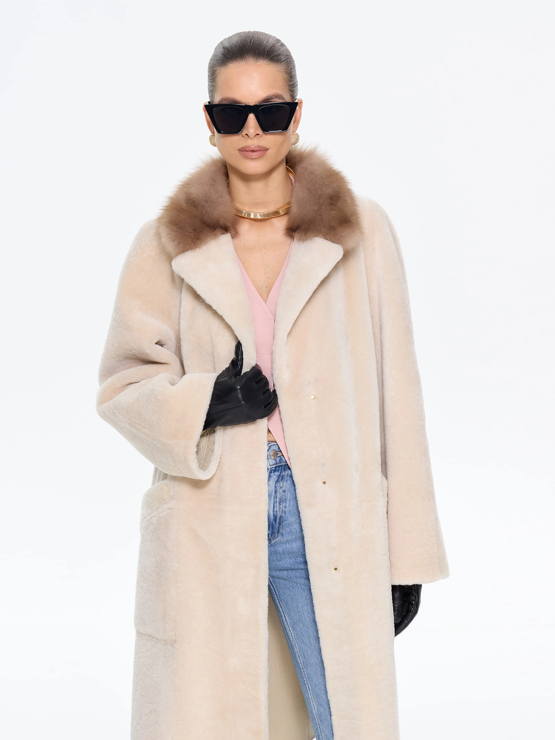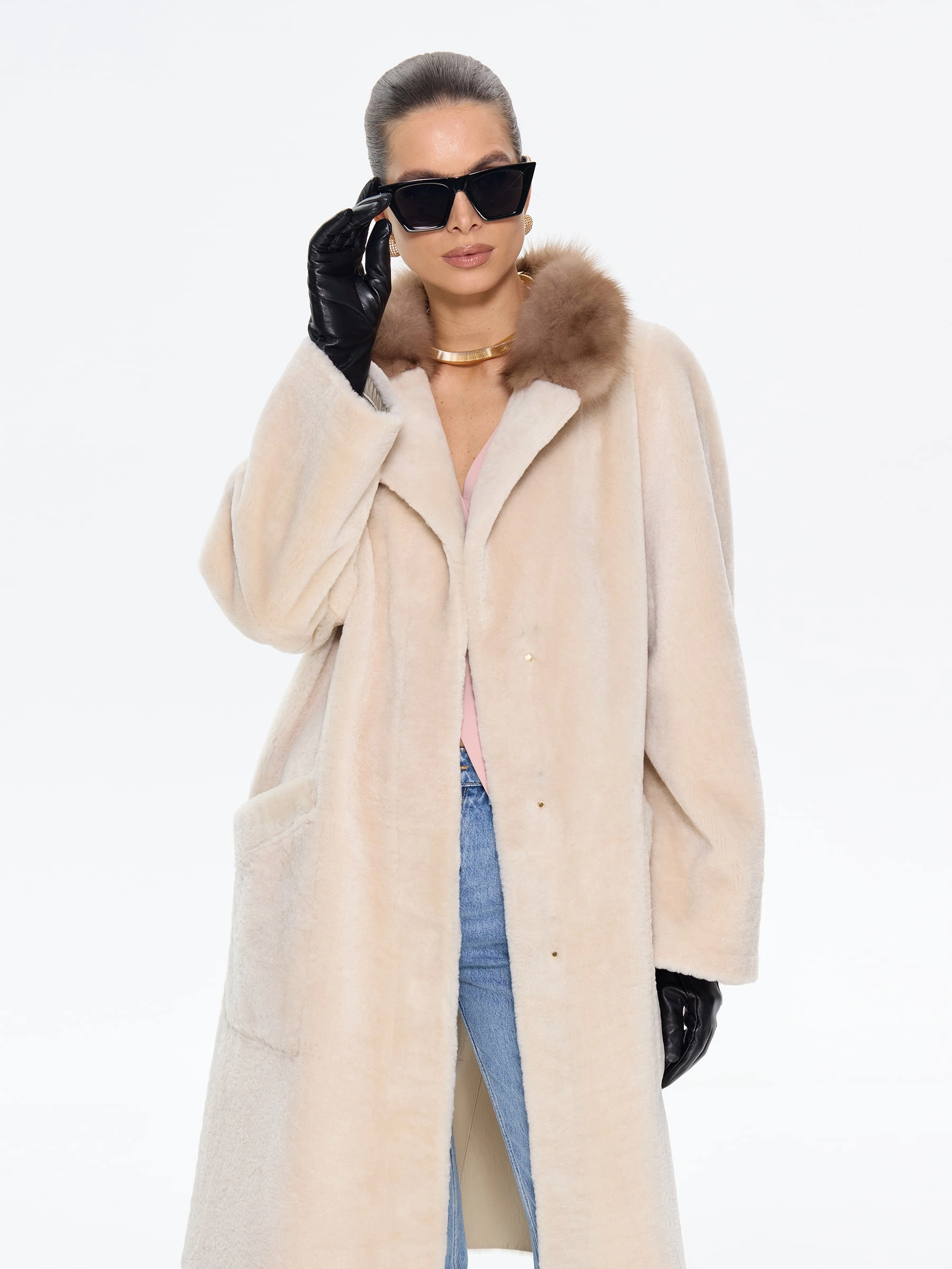Элегантная дублёнка свободного кроя с английским воротником из натурального меха астрагана премиум-класса в нежном бежевом оттенке. Модель длиной 100 см со спущенным рукавом и роскошным воротником, отделанным куницей, создает утонченный силуэт с элементами классики — накладные карманы и дополнительный ремень позволяют варьировать образ. Стилисты рекомендуют носить эту дублёнку с кожаными сапогами и брюками-бананами для повседневного стиля или с юбкой-миди и замшевыми ботильонами для элегантного выхода. Изысканное сочетание практичности и аристократического шарма, где каждая деталь подчеркивает безупречный вкус своей обладательницы.