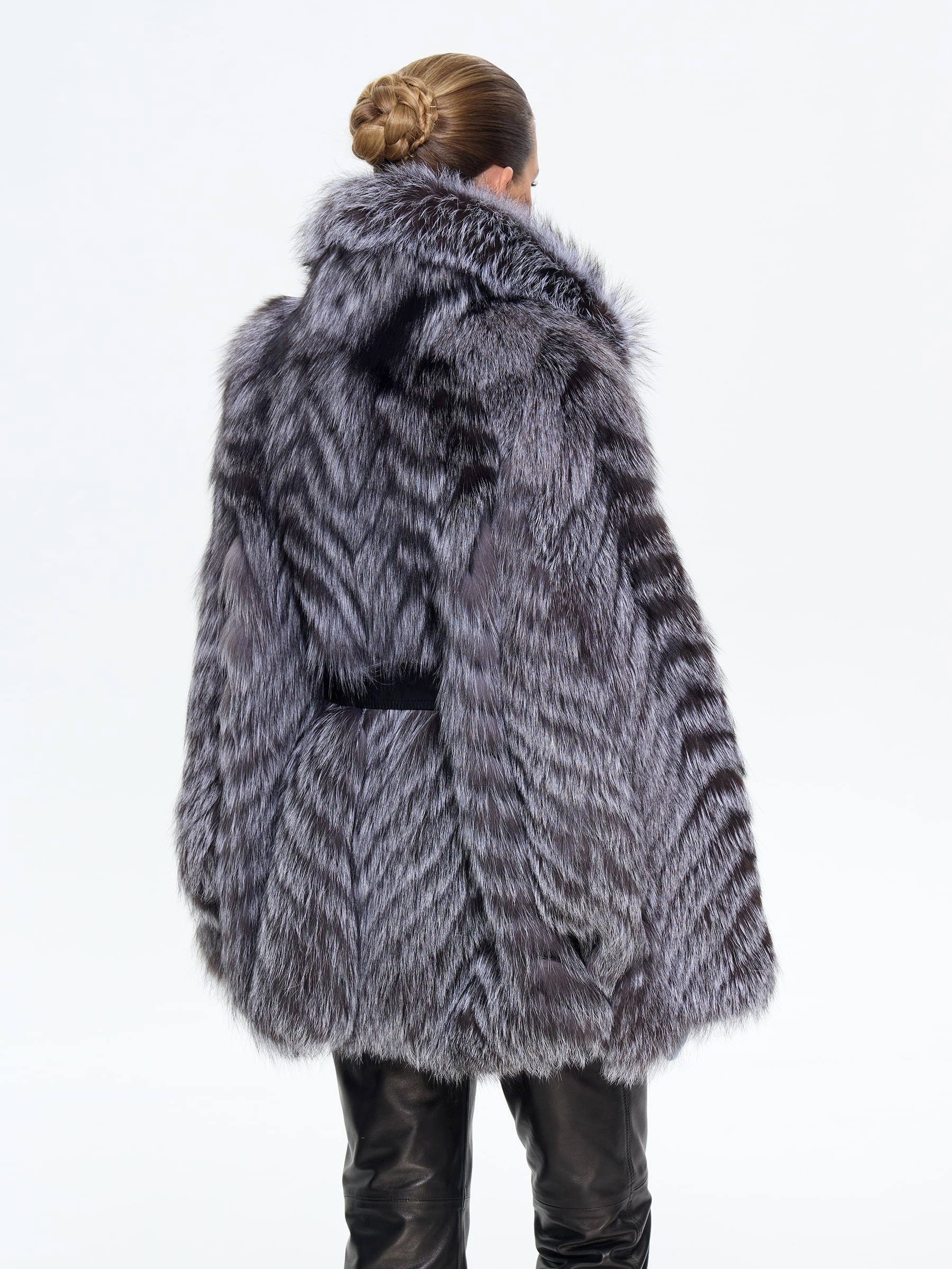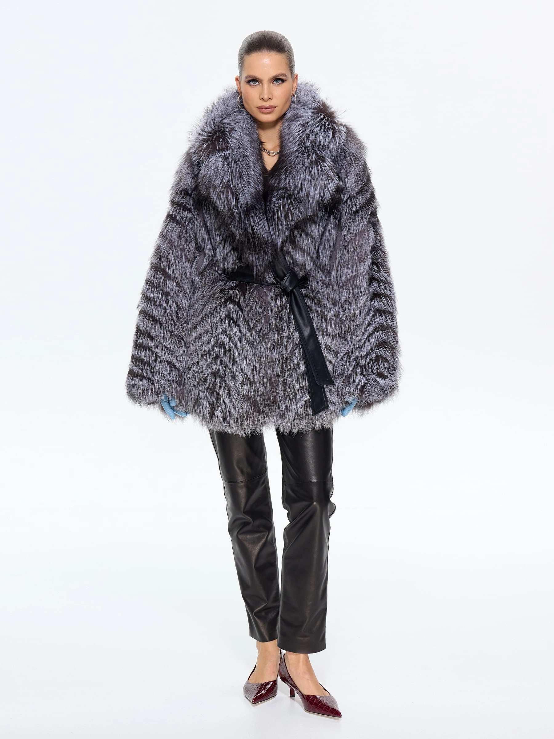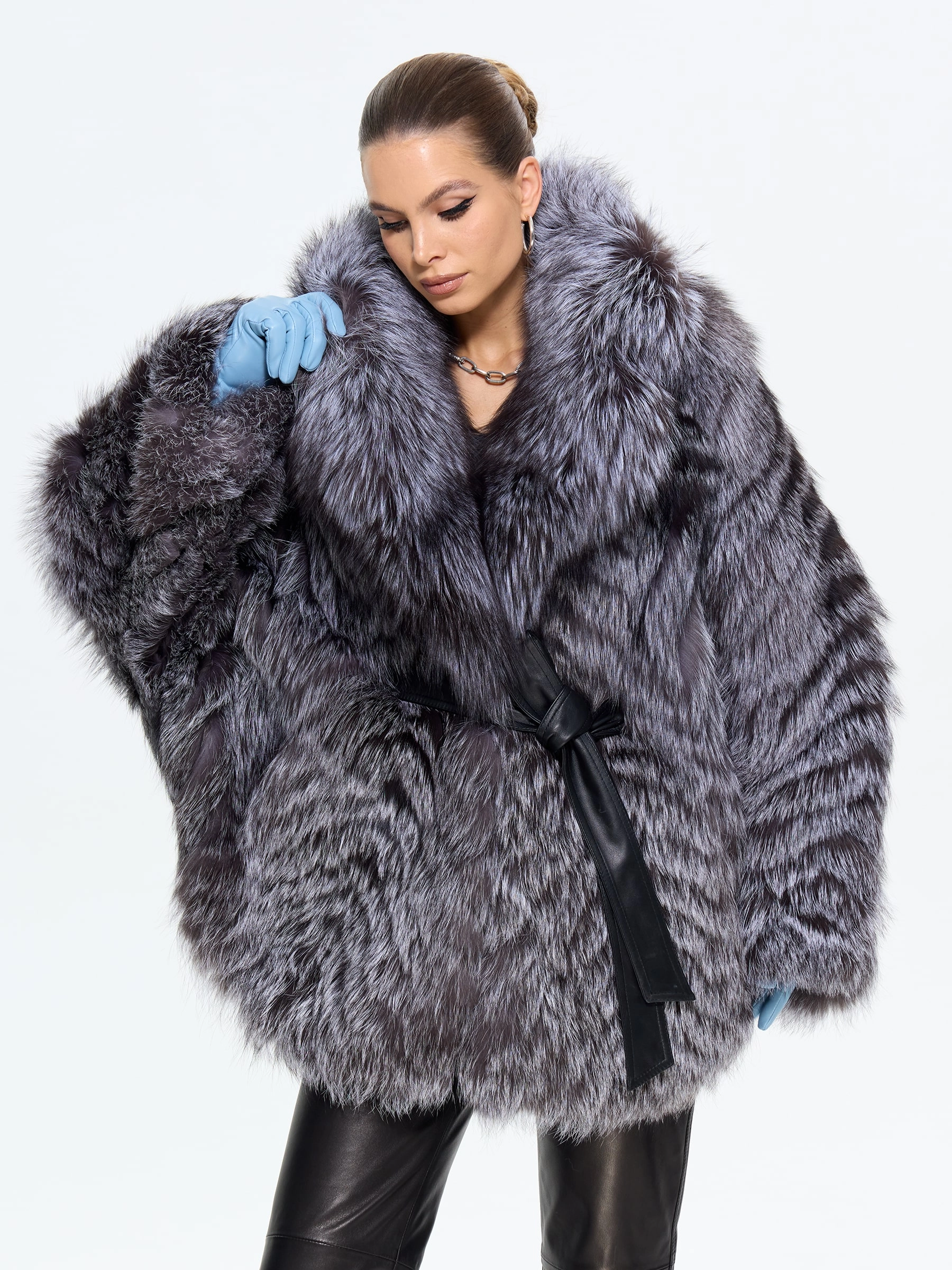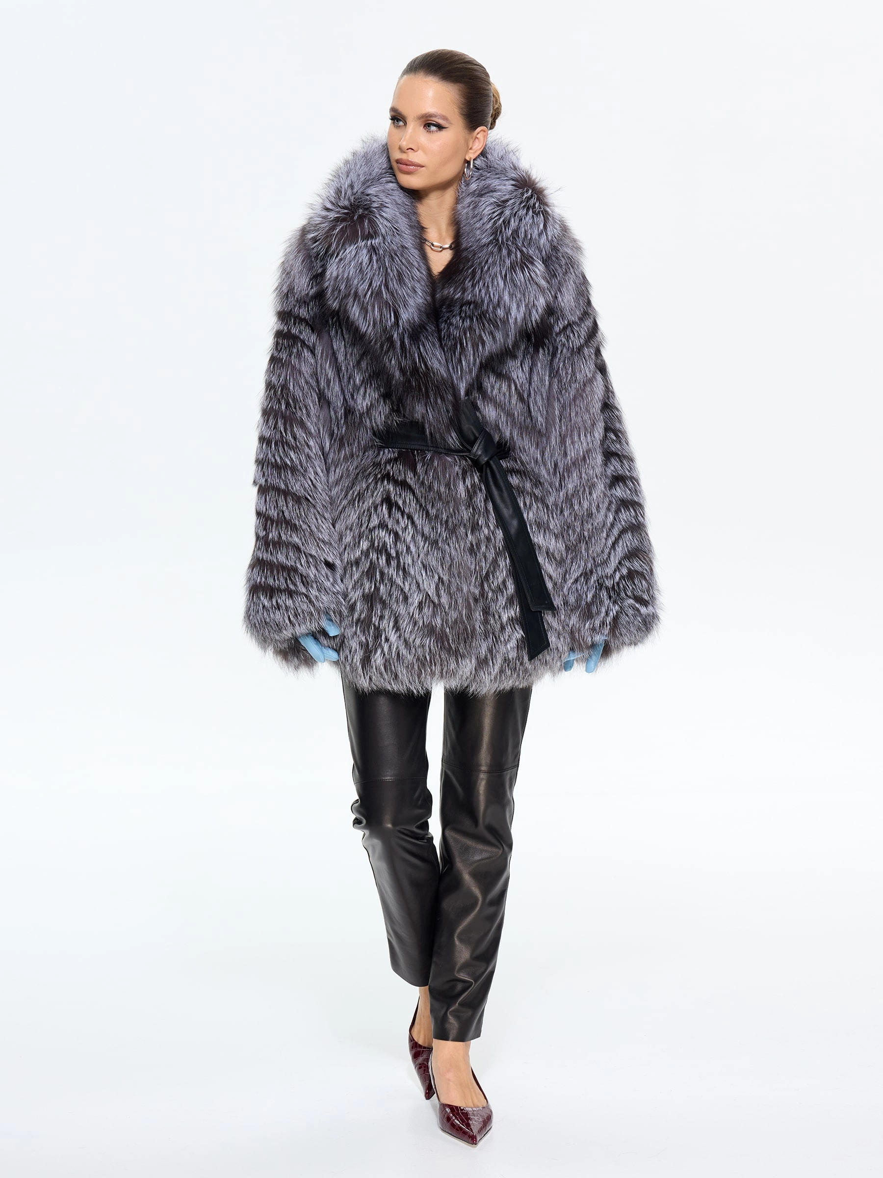 Короткая шуба из чернобурки с воротником английского кроя — это вызов условностям. Свободный силуэт с поясом и рукавом кимоно создает идеальный баланс роскоши и легкости. Сочетайте ее с высокими сапогами и объемным свитером, чтобы выглядеть стильно, дерзко и небрежно-элегантно.