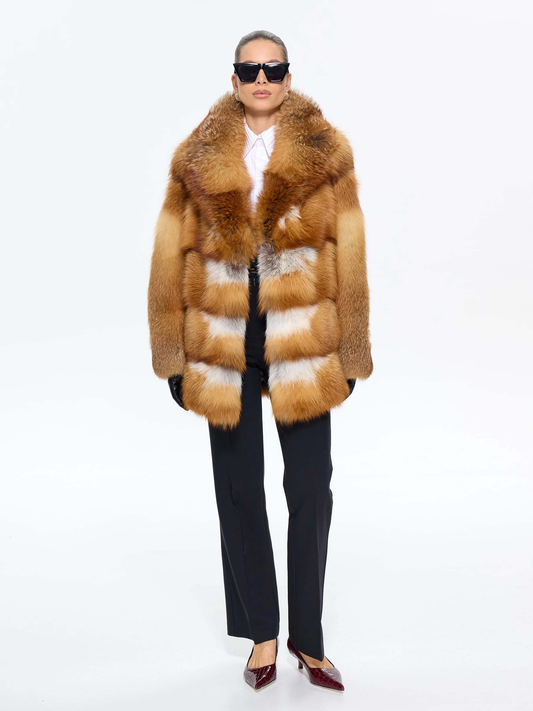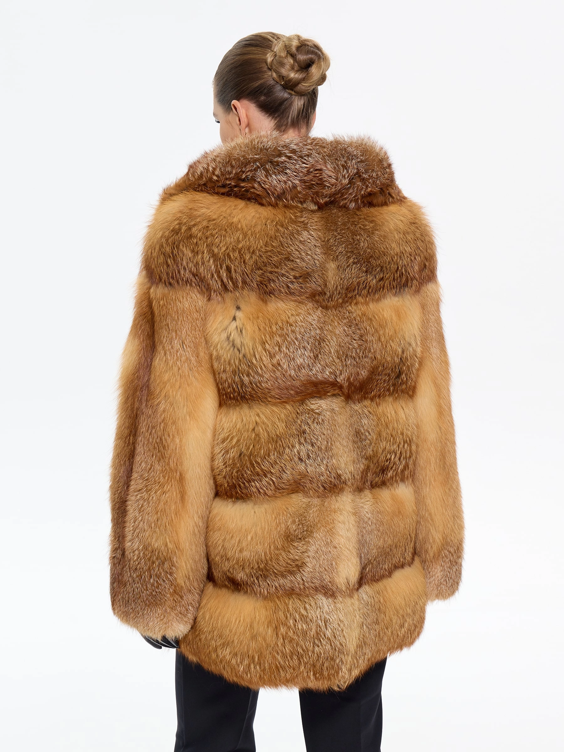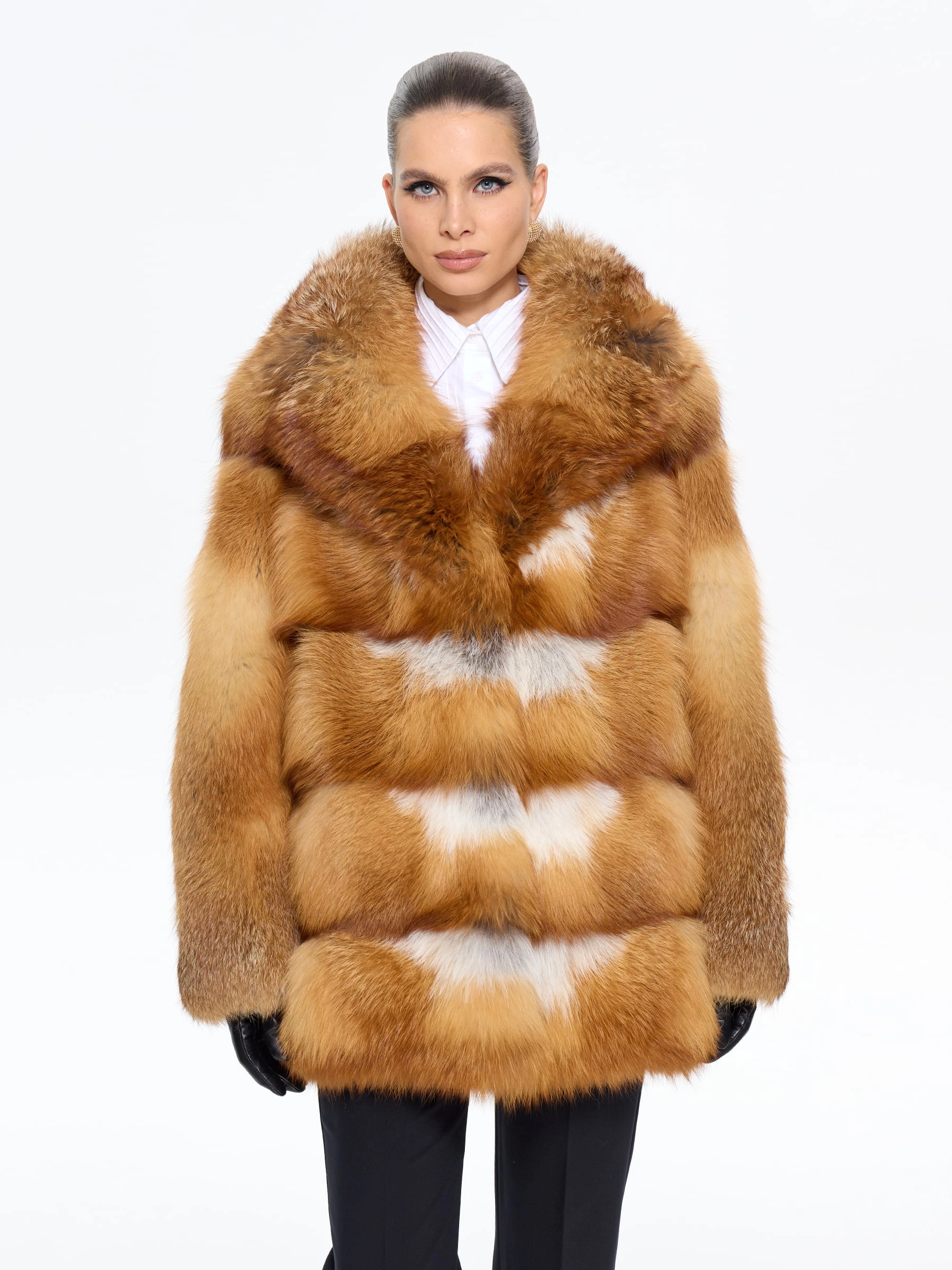 Пламенная шуба из меха лисы без капюшона с элегантным английским воротником — для тех, кто привык быть в центре внимания! Модель длиной 75 см с классическим прямым кроем и роскошным рыжим мехом создает образ дерзкой аристократки. Стилисты рекомендуют носить эту шубу с кожаными брюками и грубыми ботинками для смелого повседневного образа или с шелковым платьем-чехлом и сапогами-ботфортами для вечернего выхода — она станет главным акцентом вашего гардероба, подчеркивающим бескомпромиссный вкус и яркую индивидуальность.