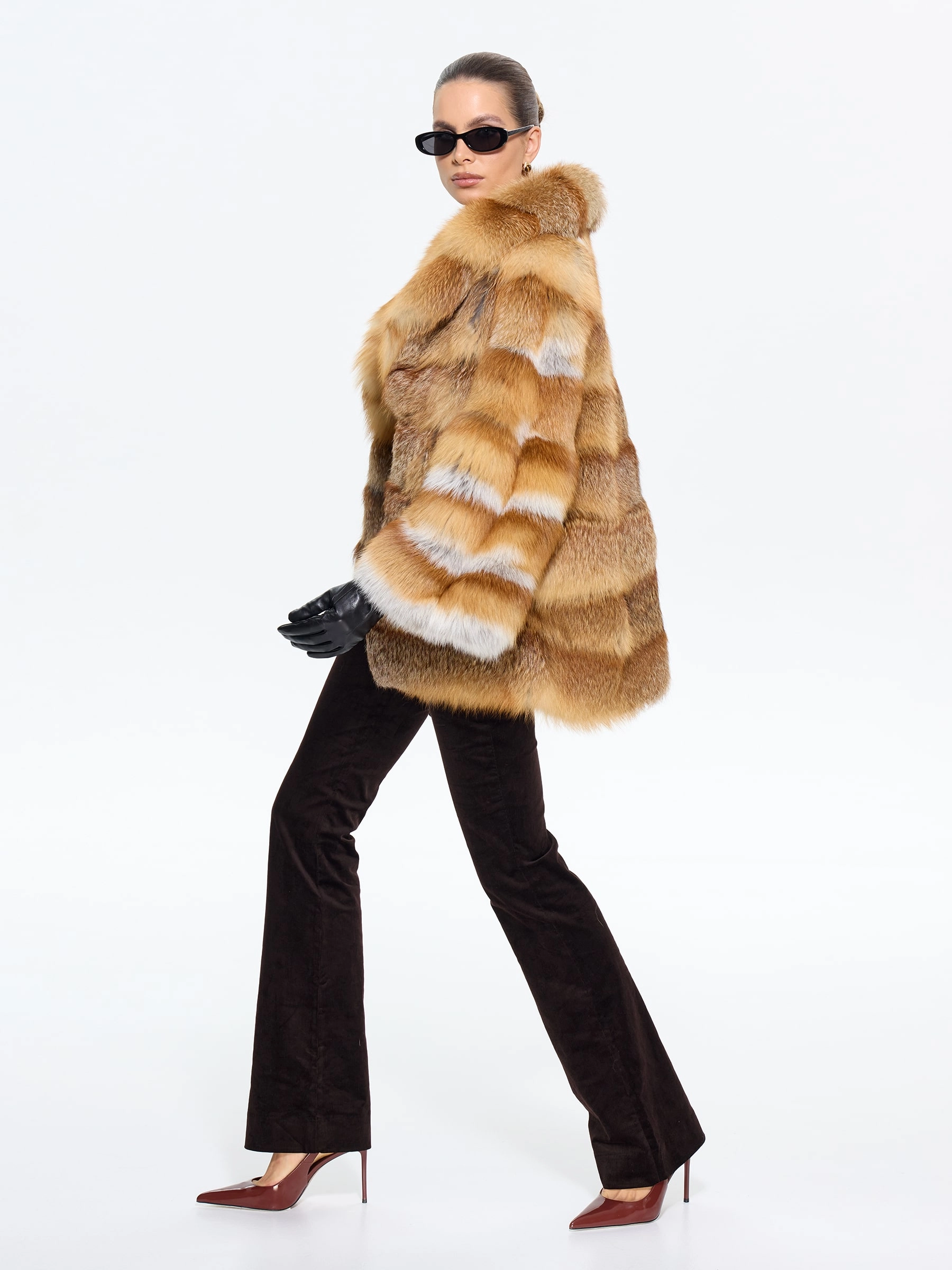 Эффектная короткая шуба из меха лисы с элегантным английским воротником — для тех, кто не боится заявить о своем стиле! Модель длиной 70 см с прямым силуэтом и смечными рукавами кимано подчеркивает индивидуальность, а роскошный мех создает объем и драматизм. Стилисты рекомендуют носить эту дерзкую модель с кожаными брюками и грубыми ботинками для создания уличного образа или с облегающим платьем и сапогами-ботфортами для вечернего выхода — она станет главным акцентом вашего гардероба, подчеркивающим смелый и современный вкус.
