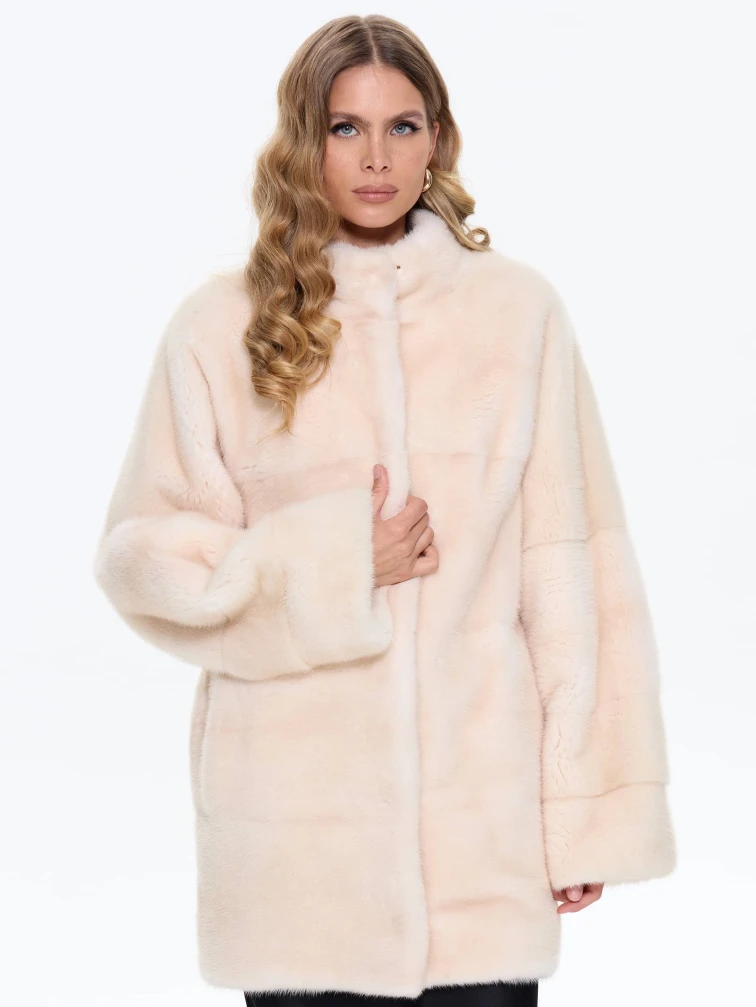 Шуба прямого кроя BRASCHI из густого меха бежевой натуральной норки в поперечной раскладке создает эластичное полотно с выразительной полосатой текстурой. Спущенные рукава с мягкой линией плеч обеспечивают свободу движений, а универсальная длина до середины бедра сочетает тепло и легкость. Практичный воротник-стойка защищает от ветра, а застежка на клипсах сохраняет мех в идеальном состоянии. Идеальный выбор для активных горожанок, ценящих комфорт и стиль.