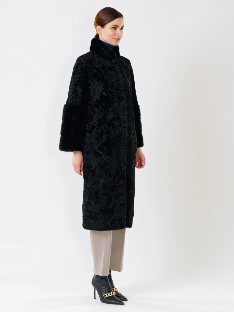 Пальто из афганского каракуля. Воротник-стойка и отделка рукавов выполнены из норки датской селекции. Удобные карманы. Ювелирный подбор шкурок по оттенку и структуре волоса. Аккуратная работа портных. Чёткая посадка по фигуре. Премиальный уровень.