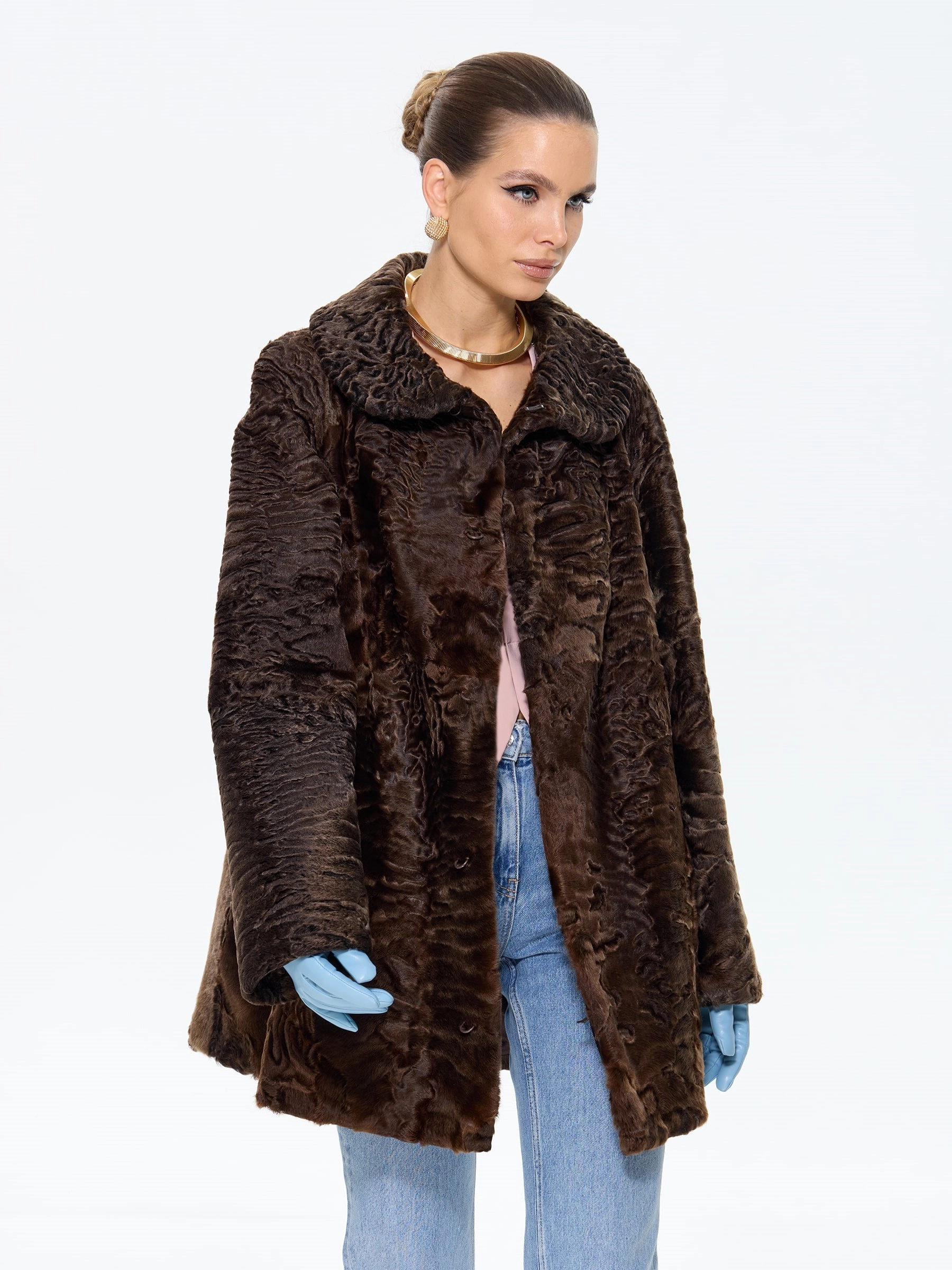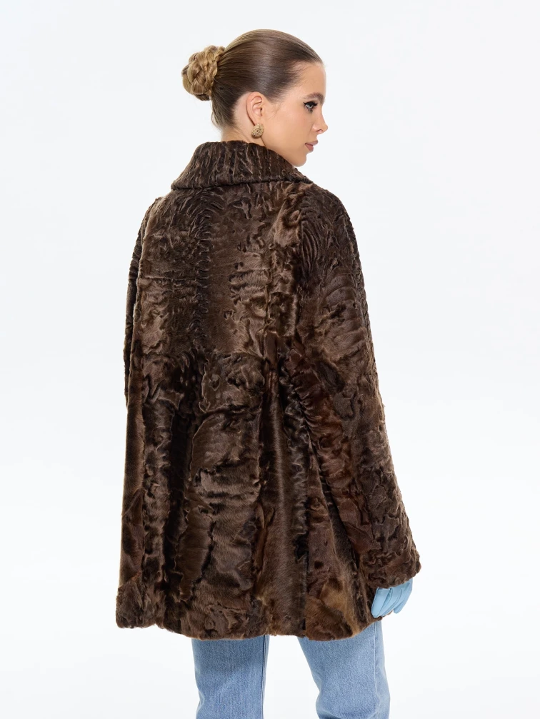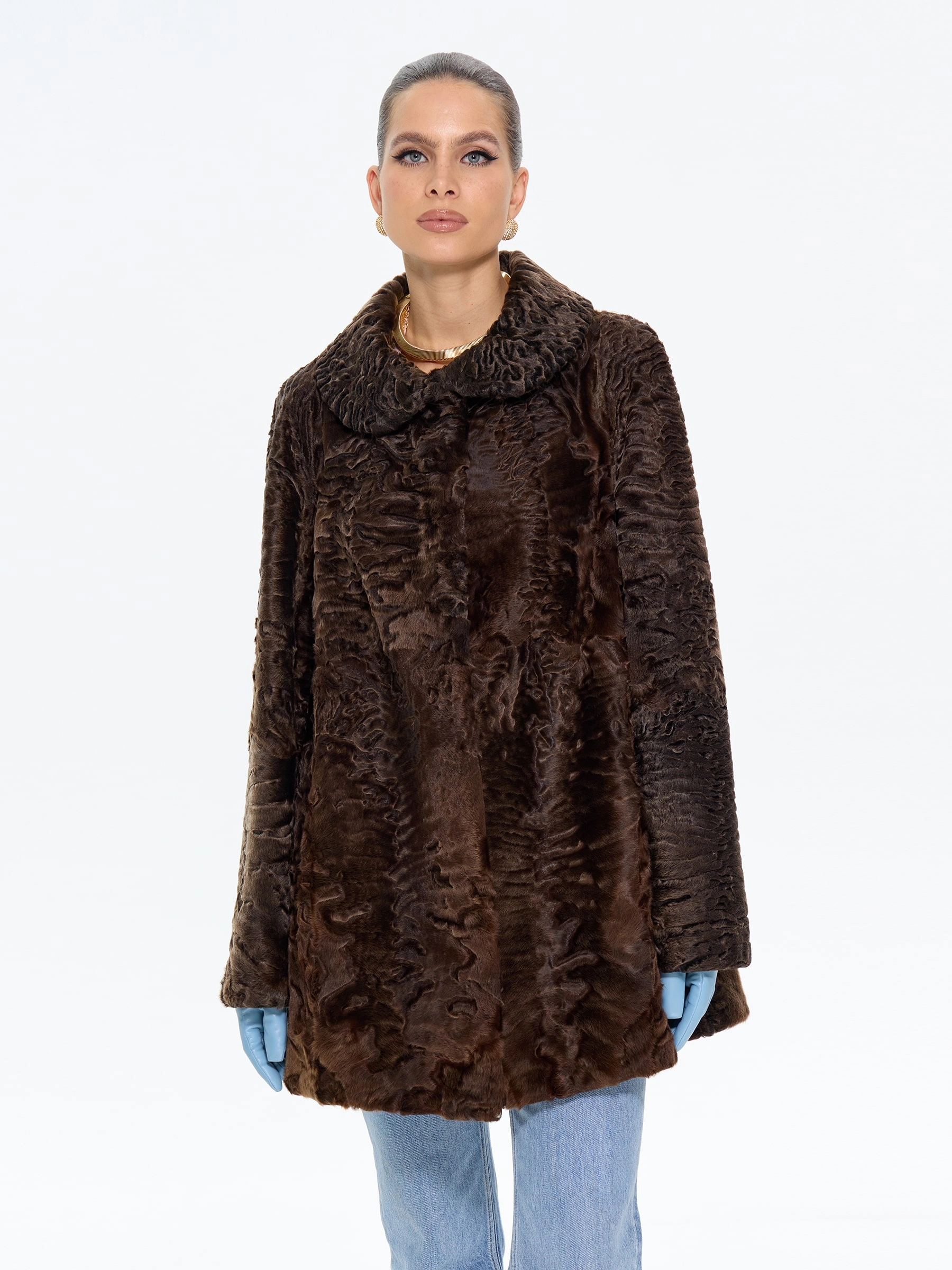 Женская шуба из меха каракульчи Елизавета, коричневая, размер 56, артикул 65590