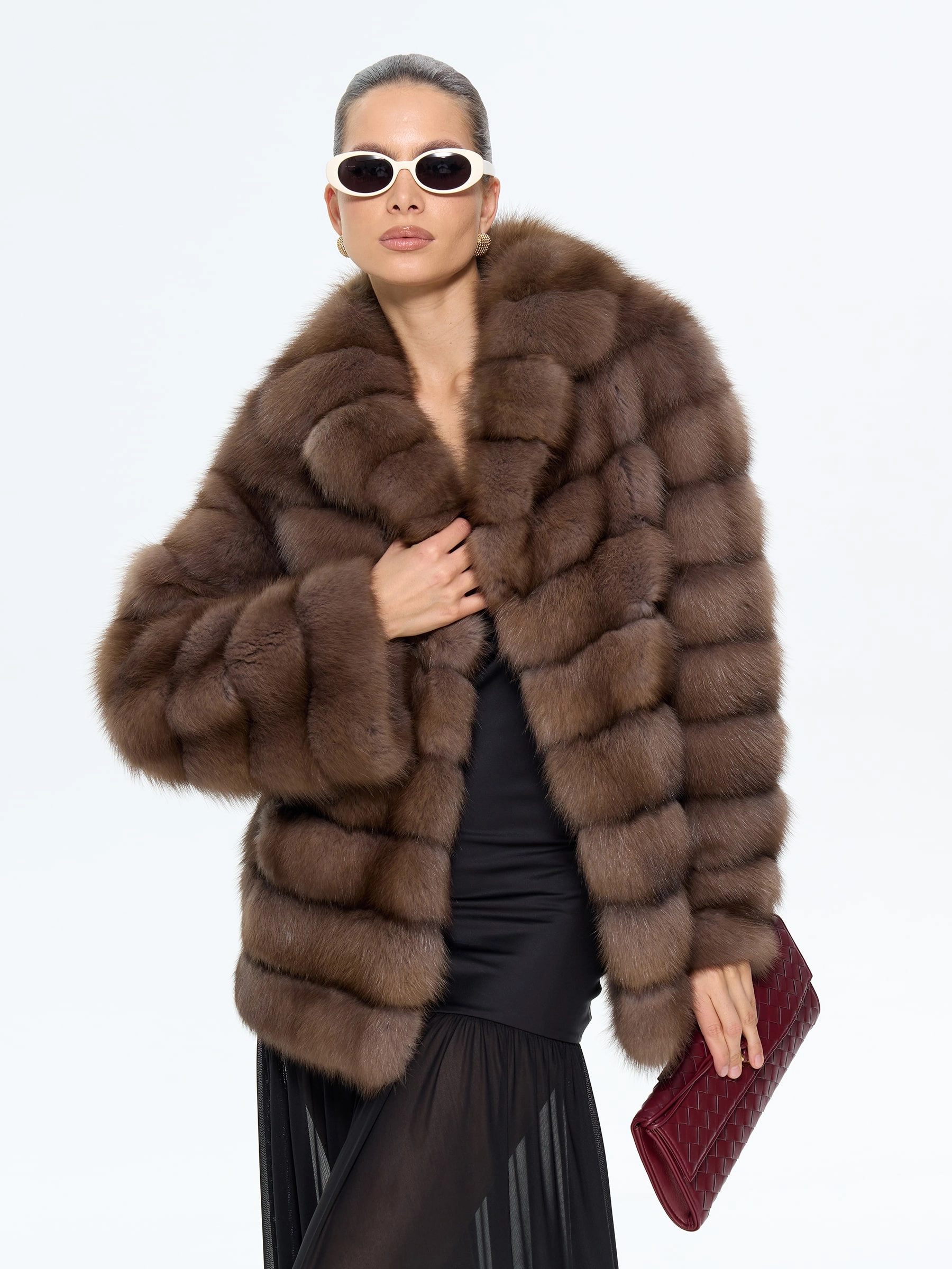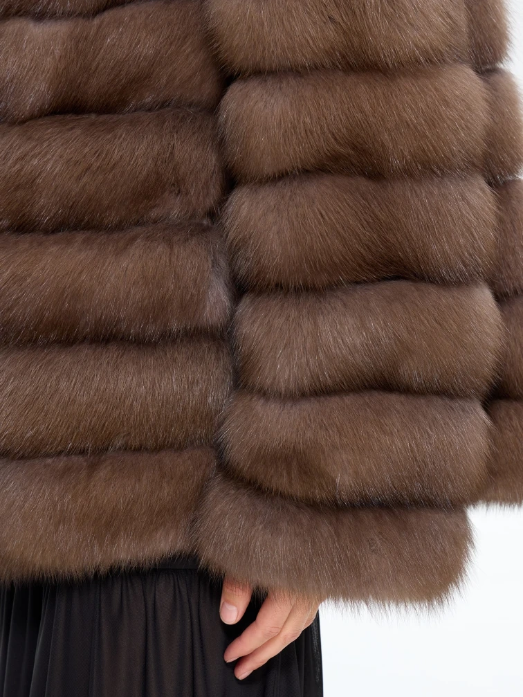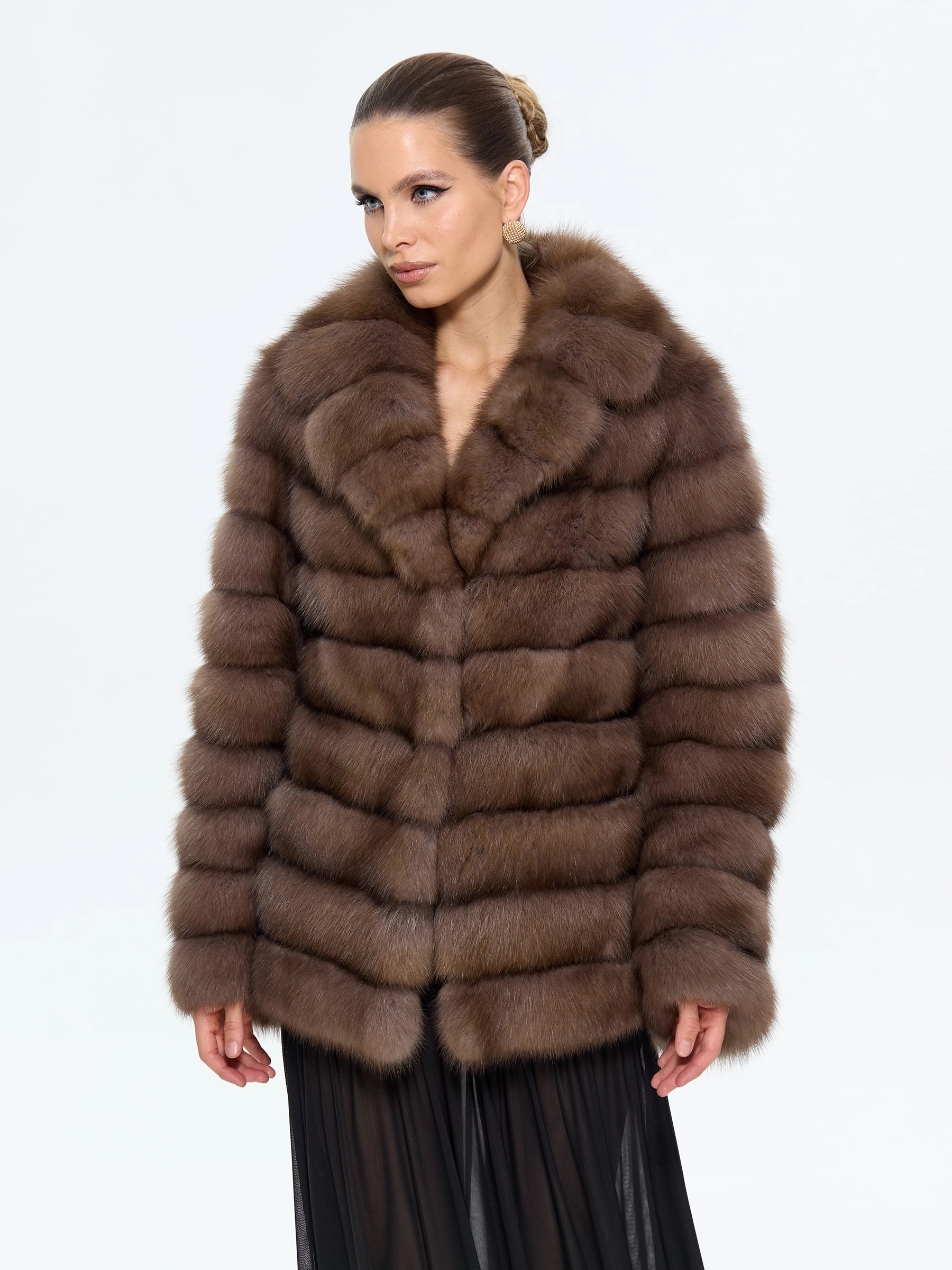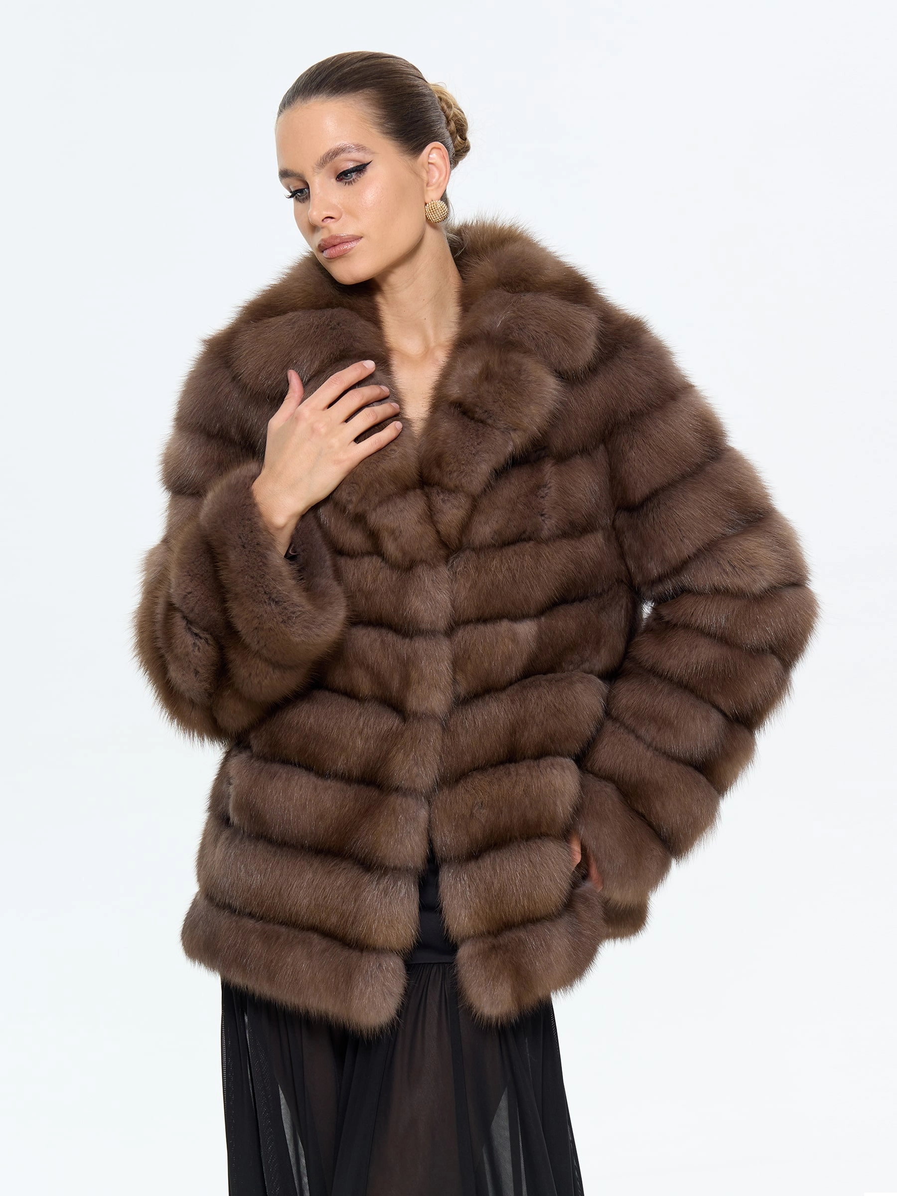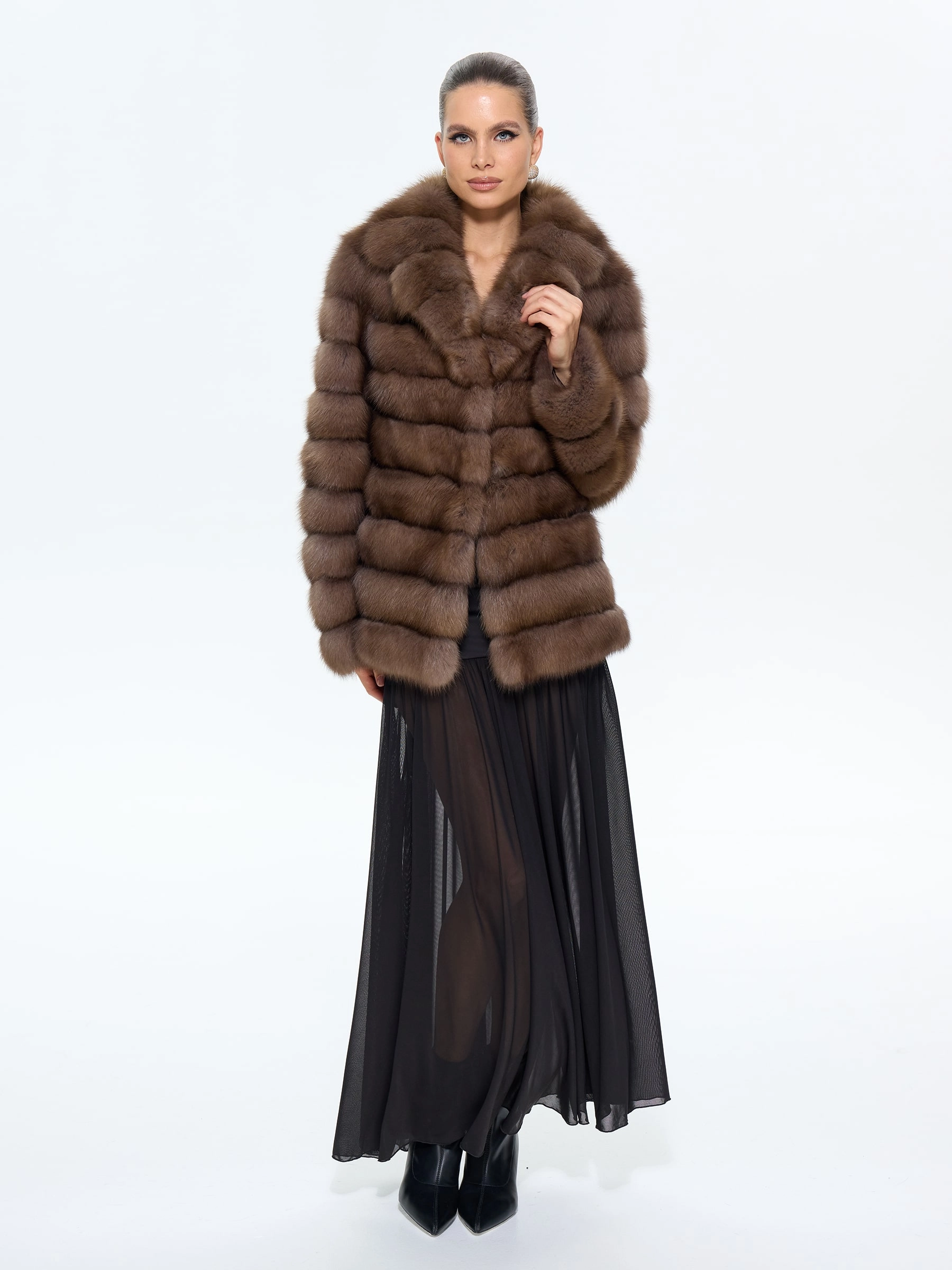 Элегантная шуба из меха куницы с изысканным английским воротником длиной 65 см воплощает утонченную классику. Прямой силуэт в дымчатом оттенке с аккуратными клипсами и втачными рукавами создает идеальные пропорции. Стилисты рекомендуют носить эту модель с водолазкой и кожаными брюками для повседневного образа или с платьем-миди и сапогами-ботфортами для вечернего выхода, подчеркивая ее универсальность и роскошную эстетику.