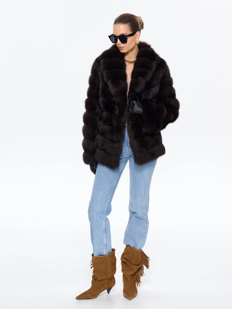 Элегантная шуба автоледи из меха куницы в глубоком темно-коричневом цвете сочетает в себе практичность и роскошь. Модель прямого силуэта длиной 75 см с мягким шалевидным воротником создает уют и завершенный образ. Совет от стилиста: эта шуба из меха куницы с воротником шикарного шалевидного кроя отлично смотрится с кожаными леггинсами и уггами для повседневного образа, а для вечернего выхода добавьте к ней узкие брюки, лакированные ботильоны и объемный клатч, подчеркивая ее классический шарм.