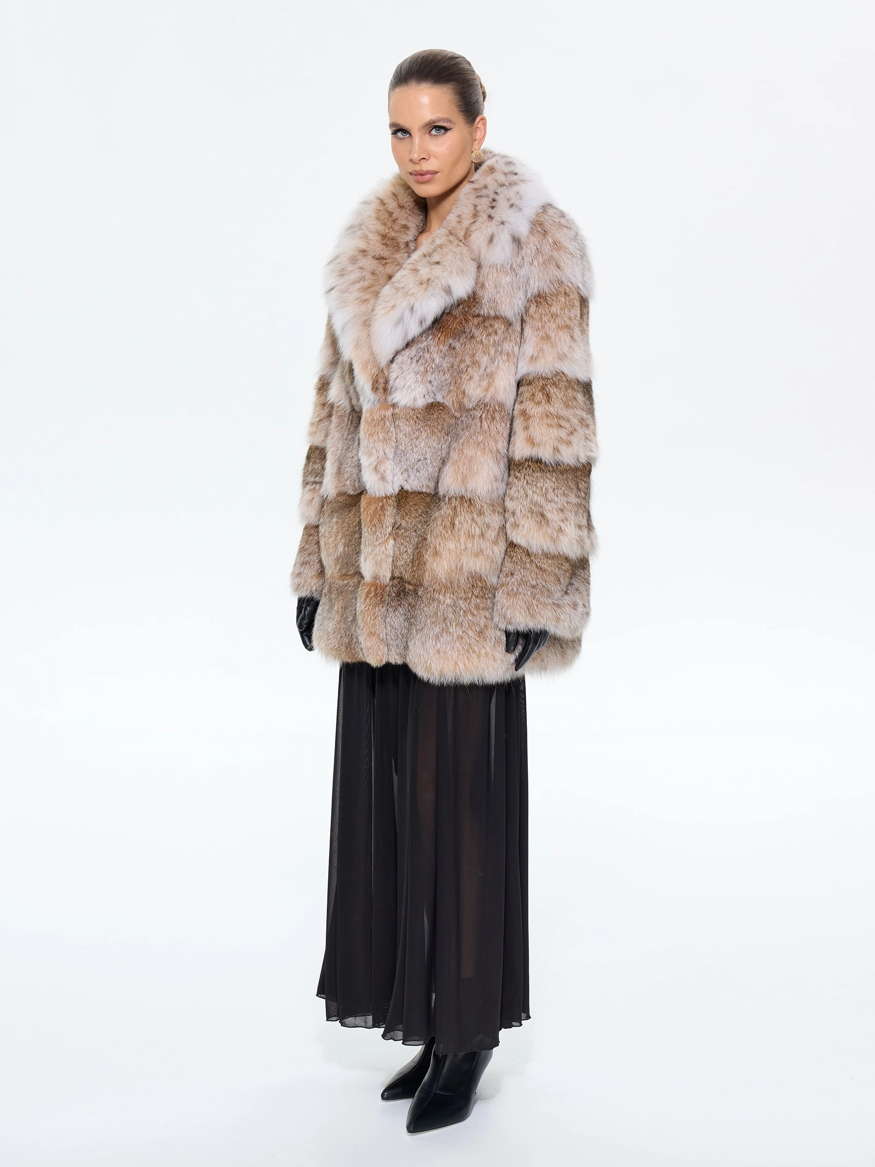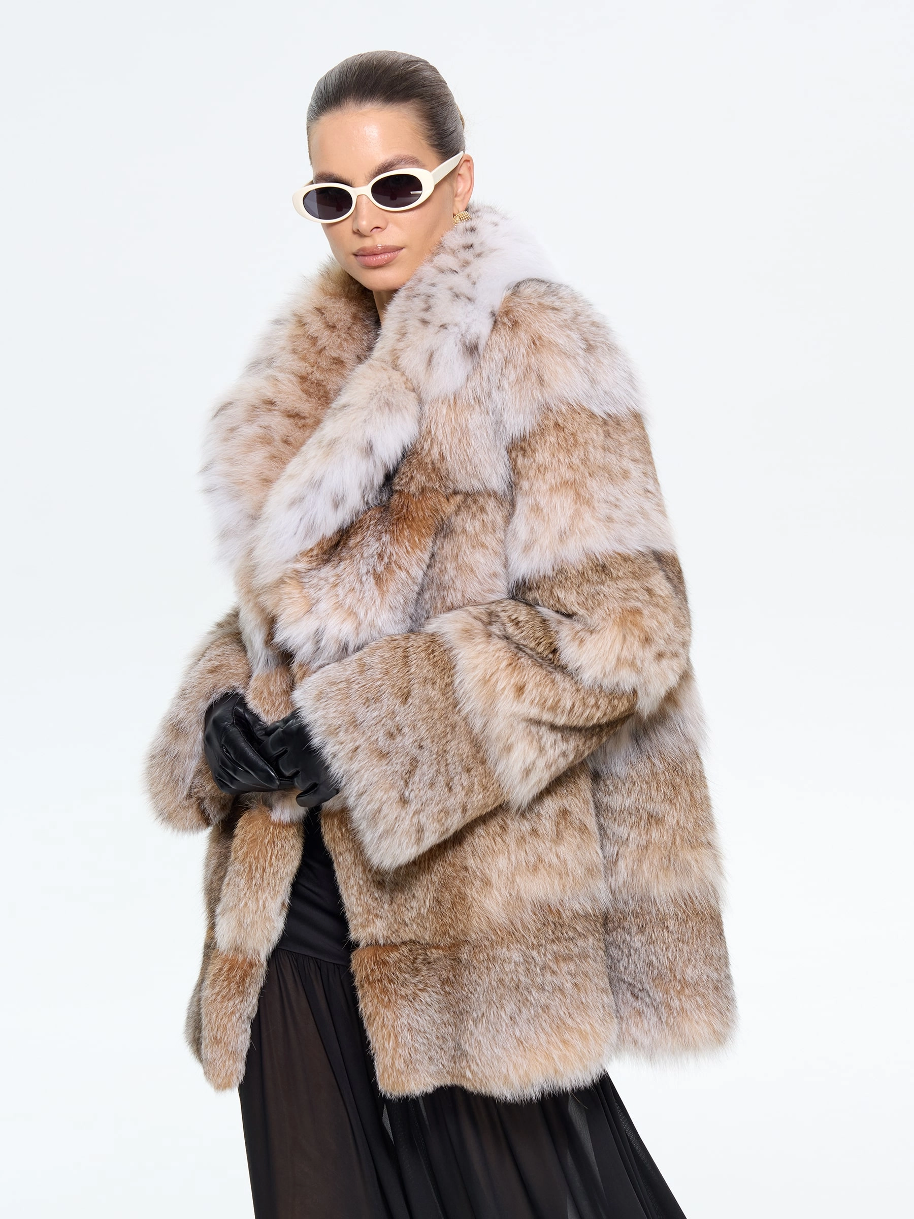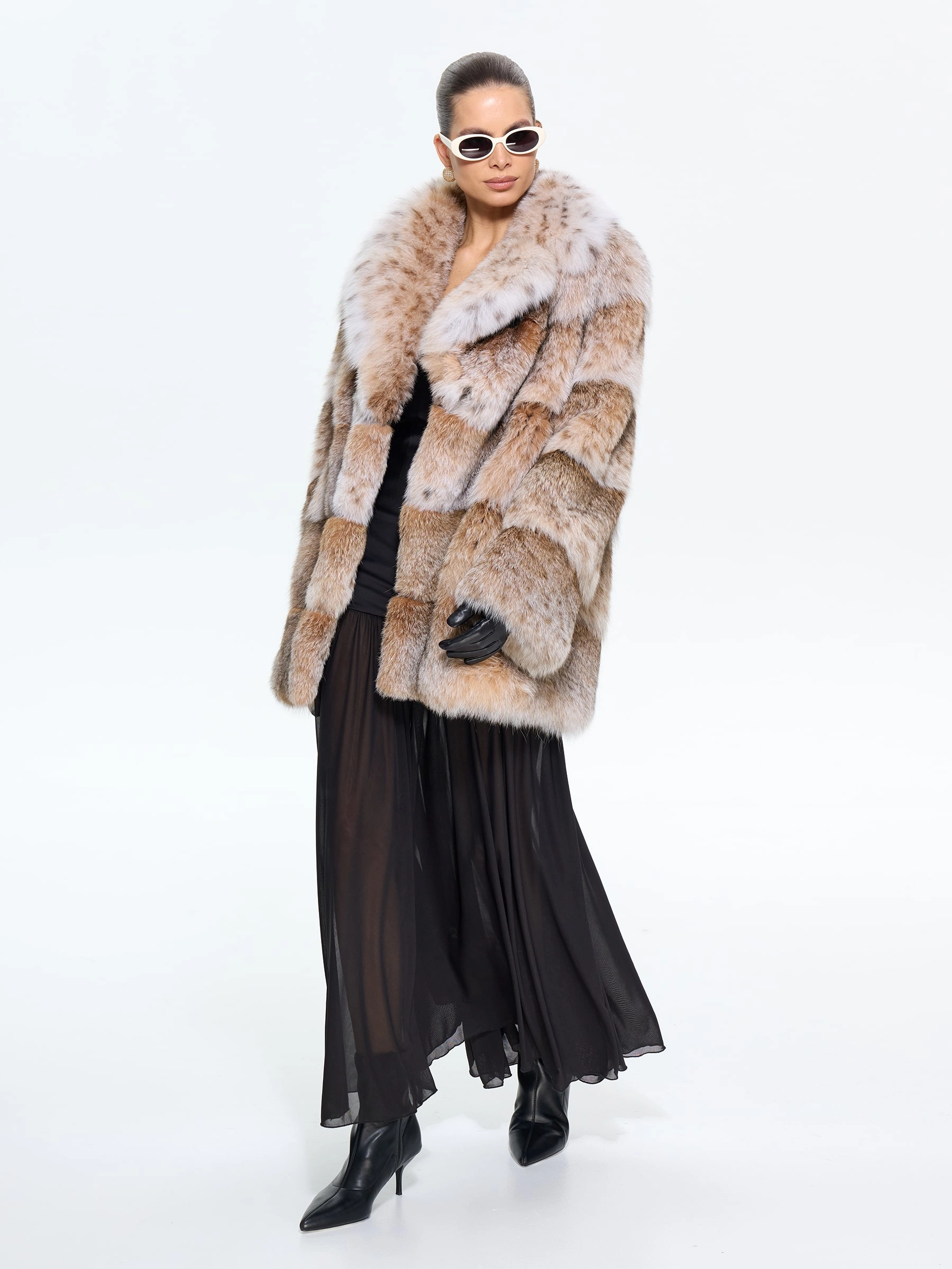 Товар женская шуба из меха рыси л850, натуральный, размер 46, артикул 65340 выполнен из мех рыси с застежкой клипсы. Рассчитан на сезон: зима. Длина изделия 75 см, силуэт прямой.
