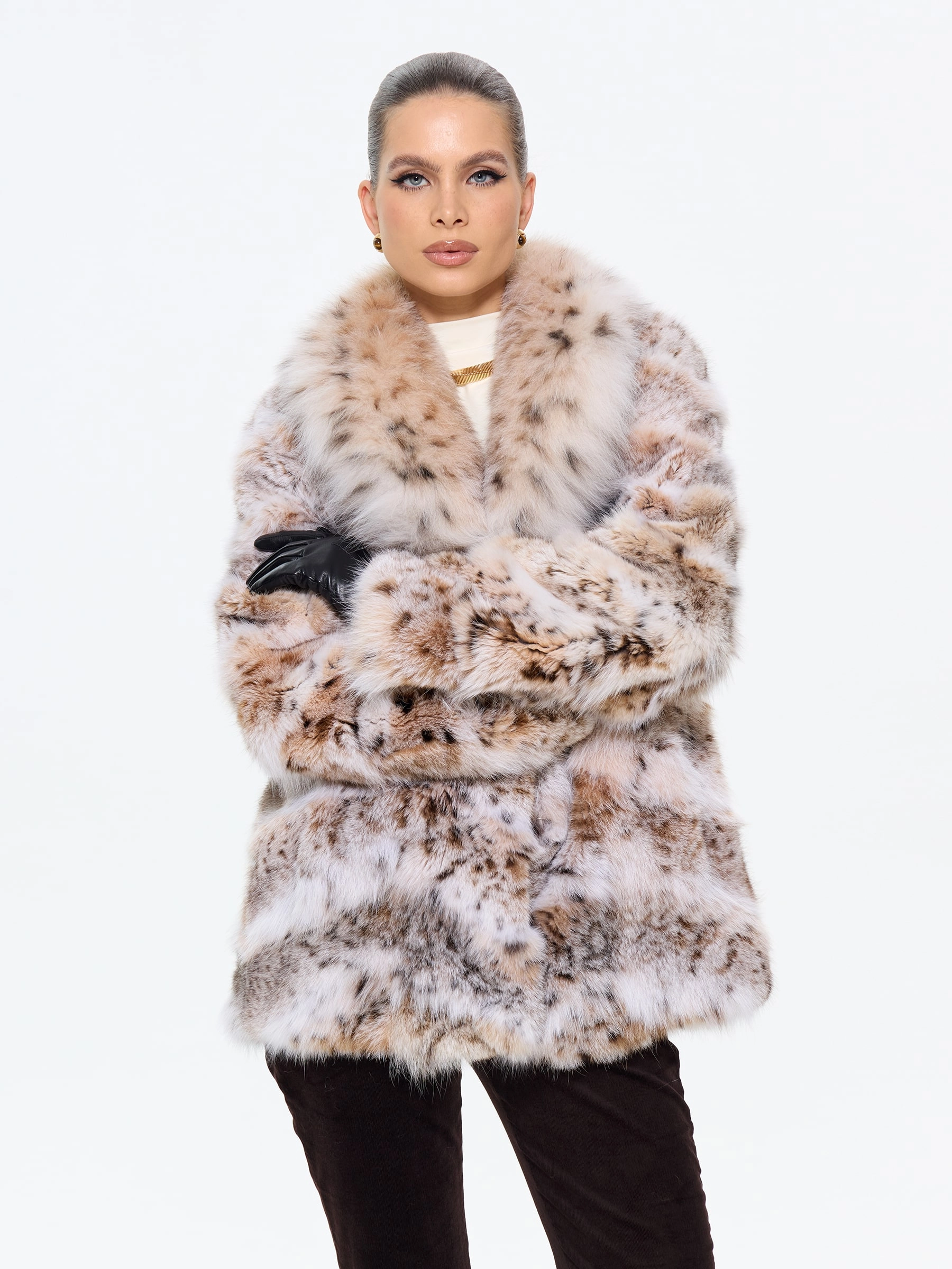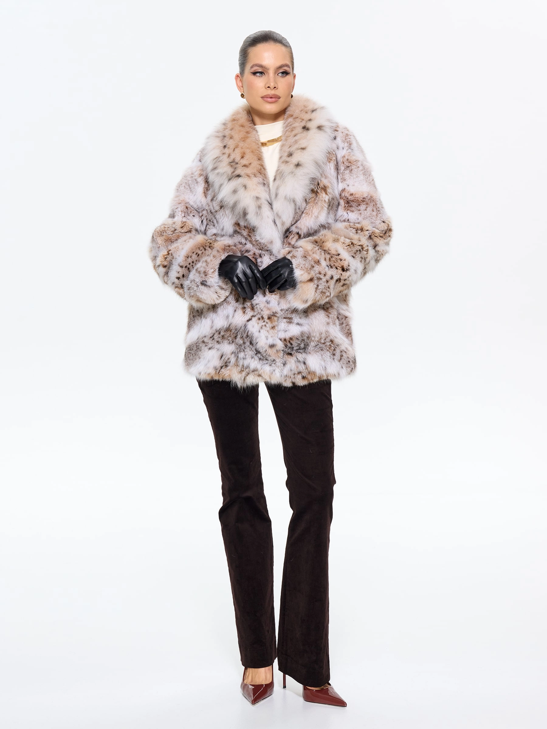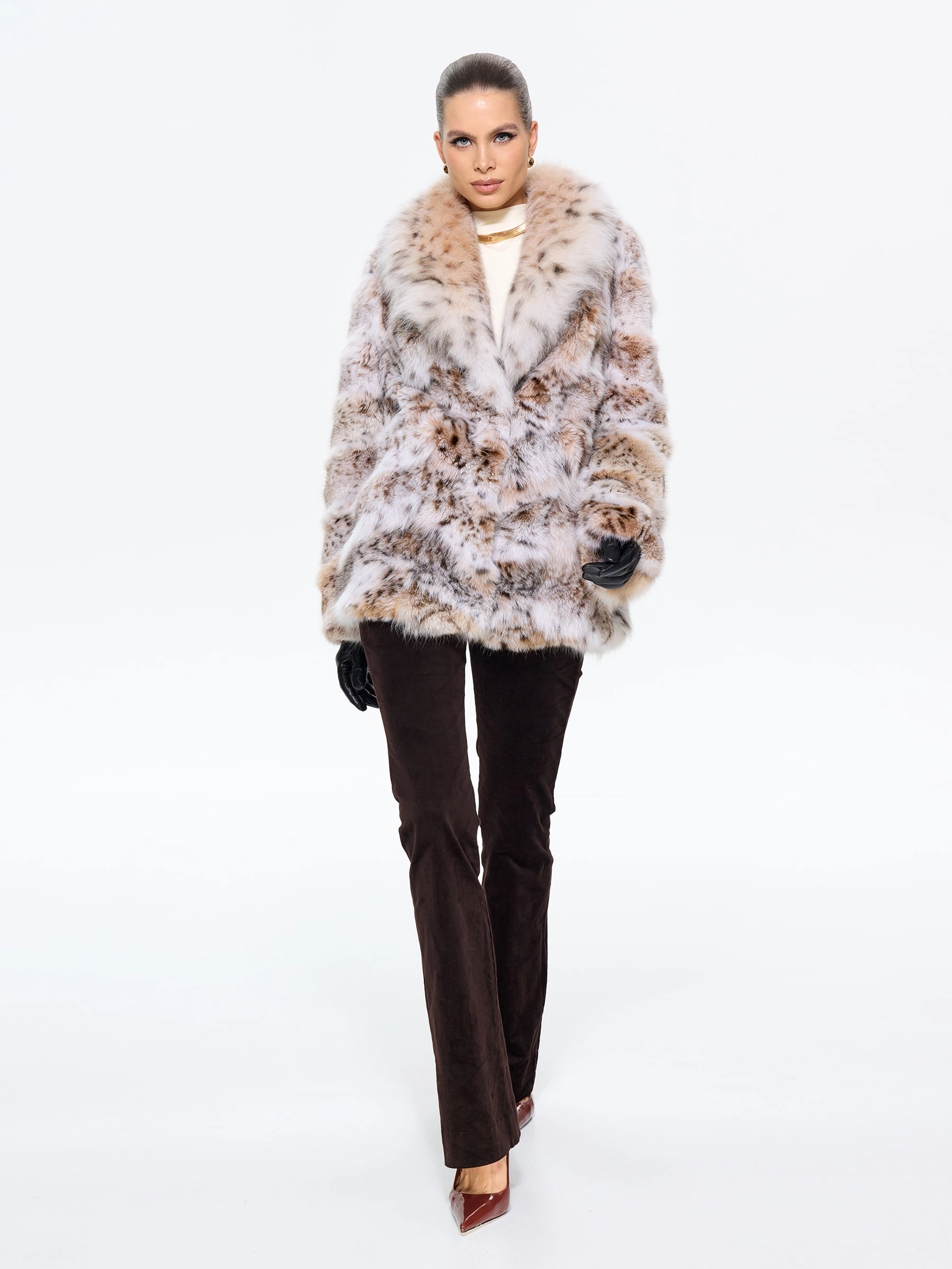 Шуба из меха рыси с роскошным шалевидным воротником — это воплощение смелой элегантности. Её прямой силуэт и длина 75 см создают идеальный баланс между классикой и современностью, а скрытые карманы и удобные клипсы подчеркивают практичность. Для создания дерзкого образа стилисты рекомендуют набросить её на плечи поверх кожаных брюк и грубых ботинок — такой лук говорит о том, что вы не признаете правил и создаете свою собственную моду, где роскошь встречается с небрежной легкостью.