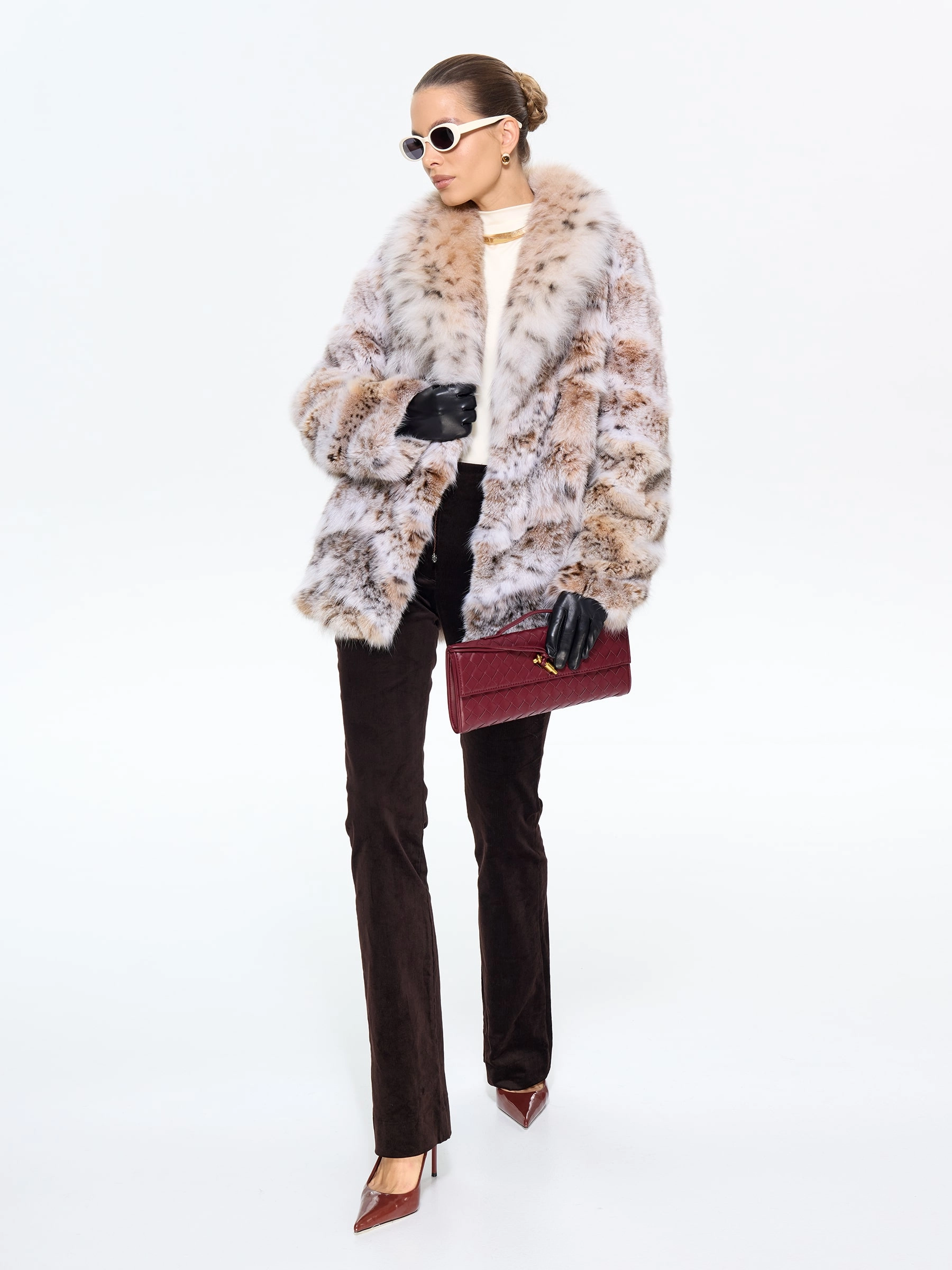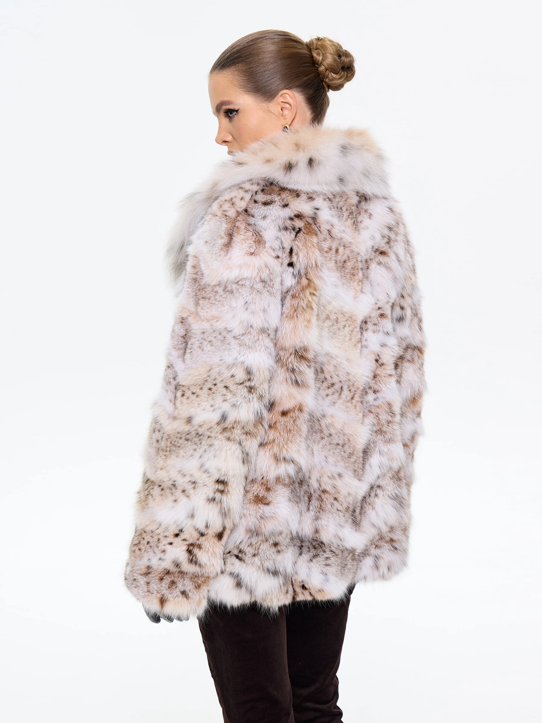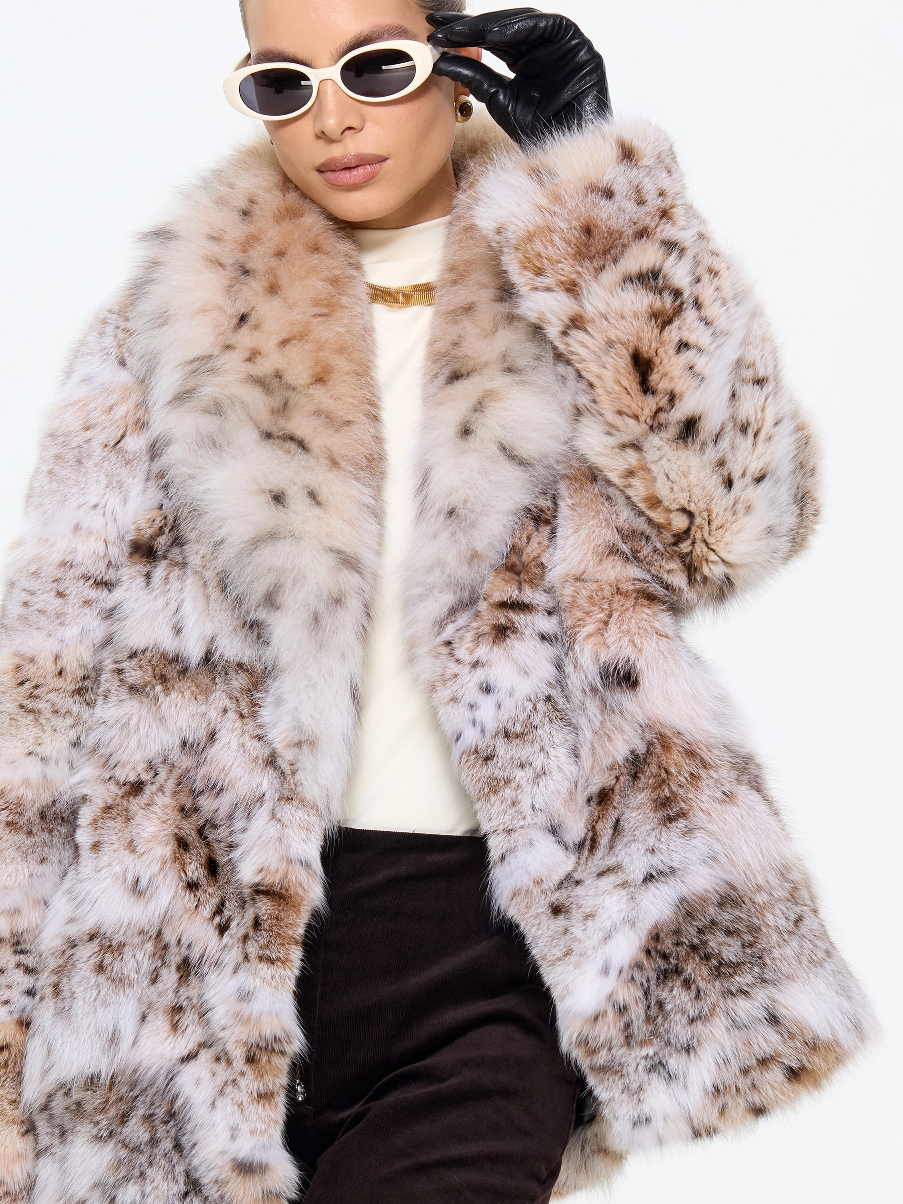 Шуба из меха рыси с роскошным шалевидным воротником — это воплощение смелой элегантности. Её прямой силуэт и длина 75 см создают идеальный баланс между классикой и современностью, а скрытые карманы и удобные клипсы подчеркивают практичность. Для создания дерзкого образа стилисты рекомендуют набросить её на плечи поверх кожаных брюк и грубых ботинок — такой лук говорит о том, что вы не признаете правил и создаете свою собственную моду, где роскошь встречается с небрежной легкостью.